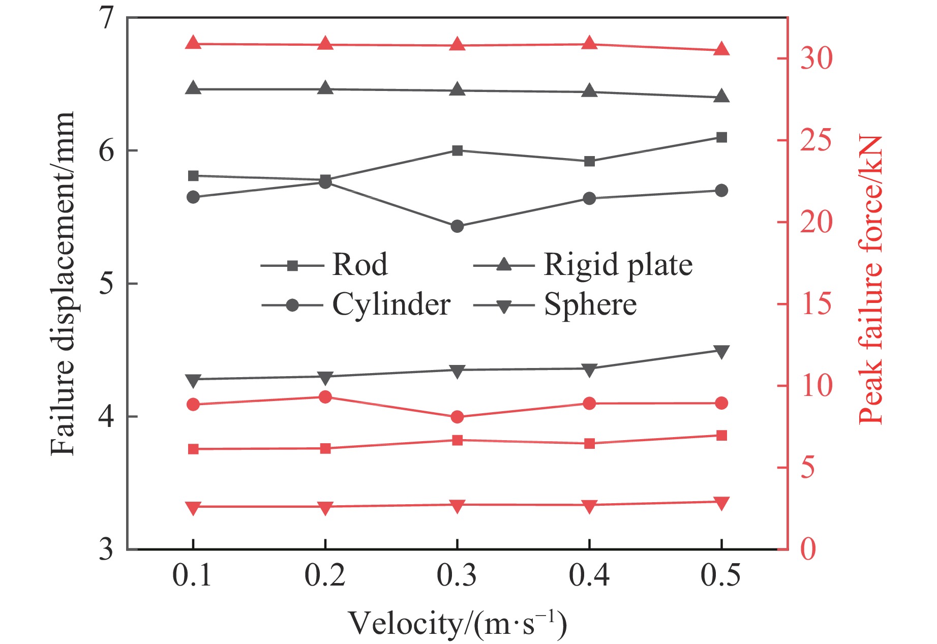 Figure  9.  Failure displacement-failure peak force curves of the batteries under different punch shapes