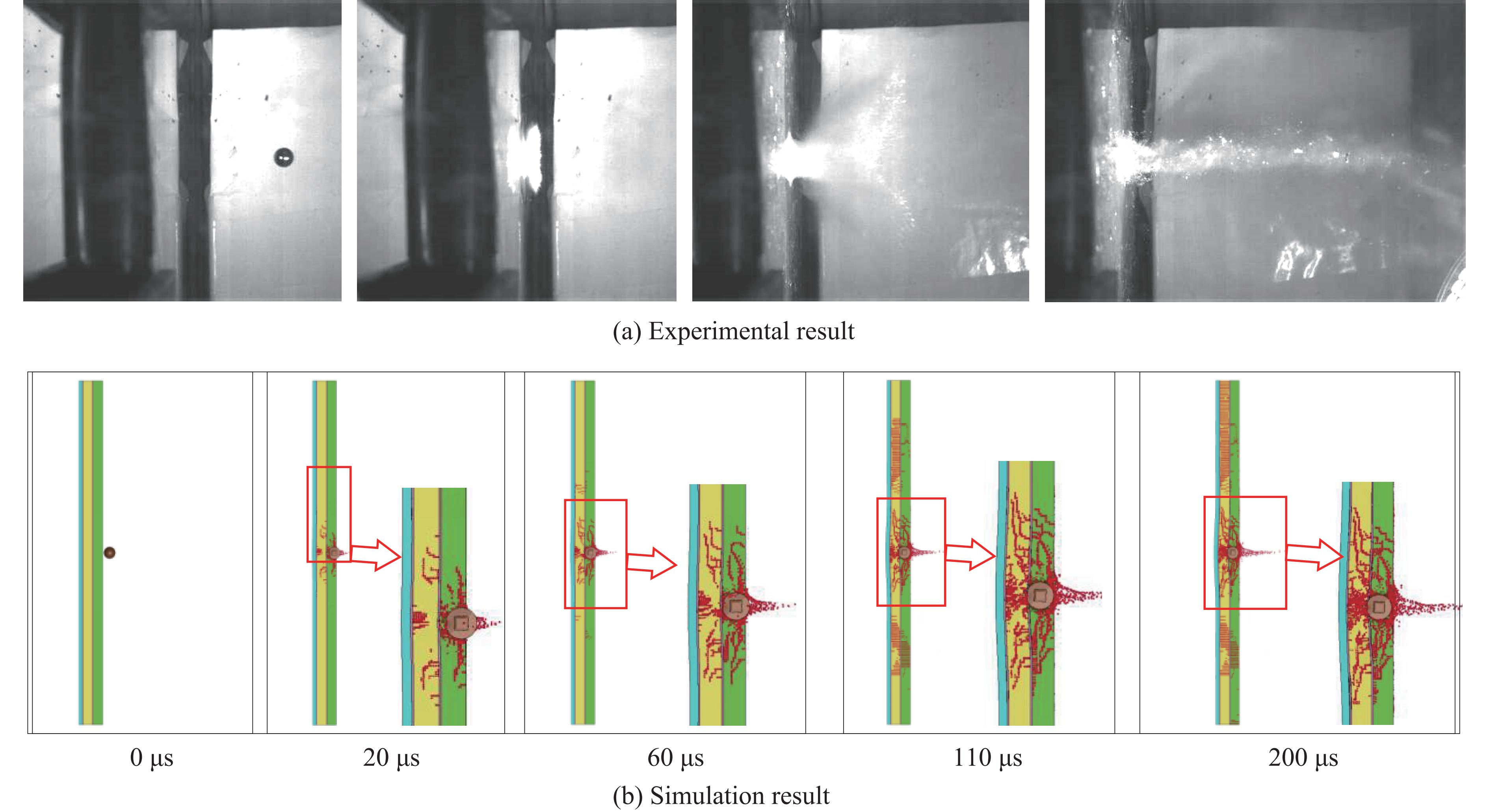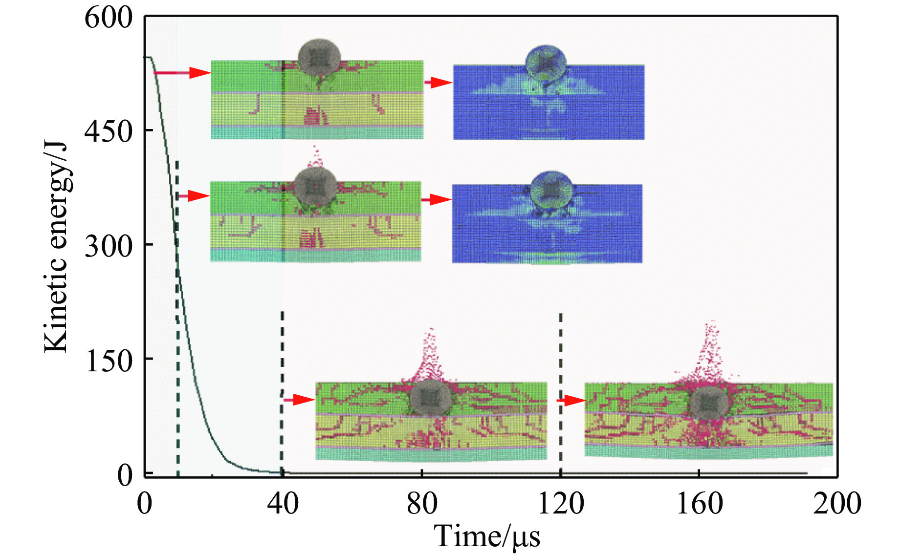 No. Impact velocity/(m·s–1) Depth of penetration Exp./mm Sim./mm Error/% 1 336 4.9 4.1 16.30 2 413 5.8 6.1 5.20 3 517 11.3 10.2 9.70 4 634 13.4 15.3 14.20 -
