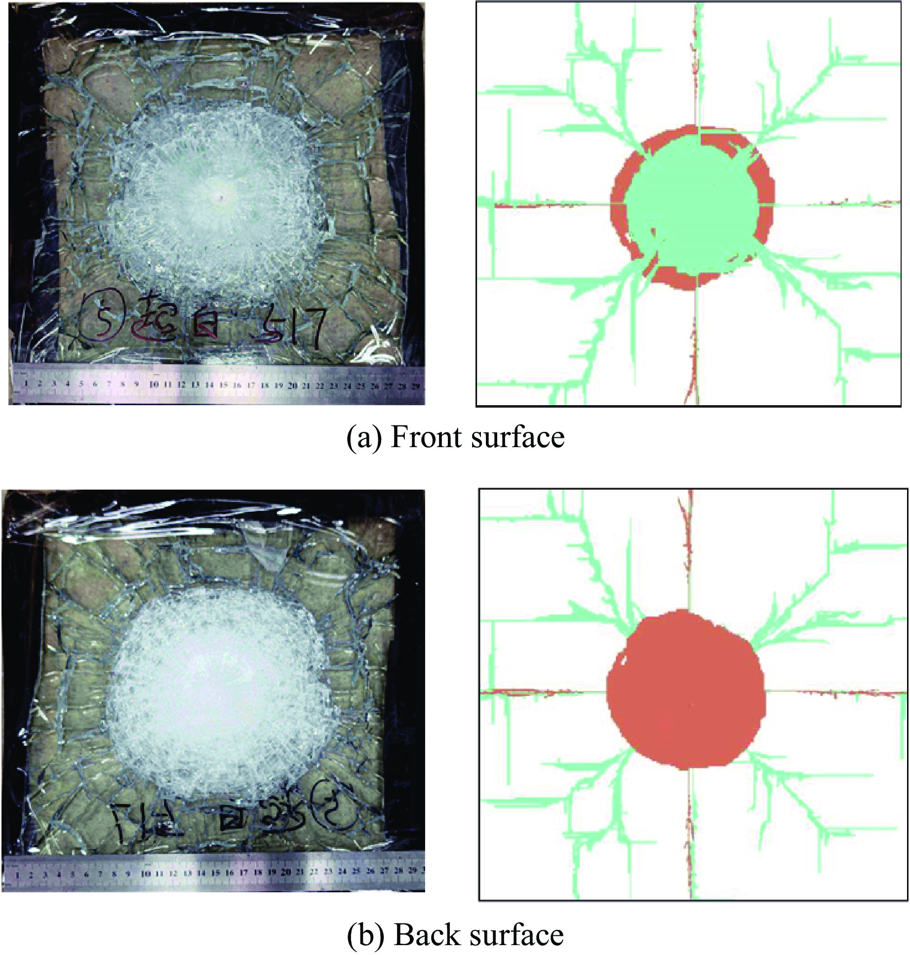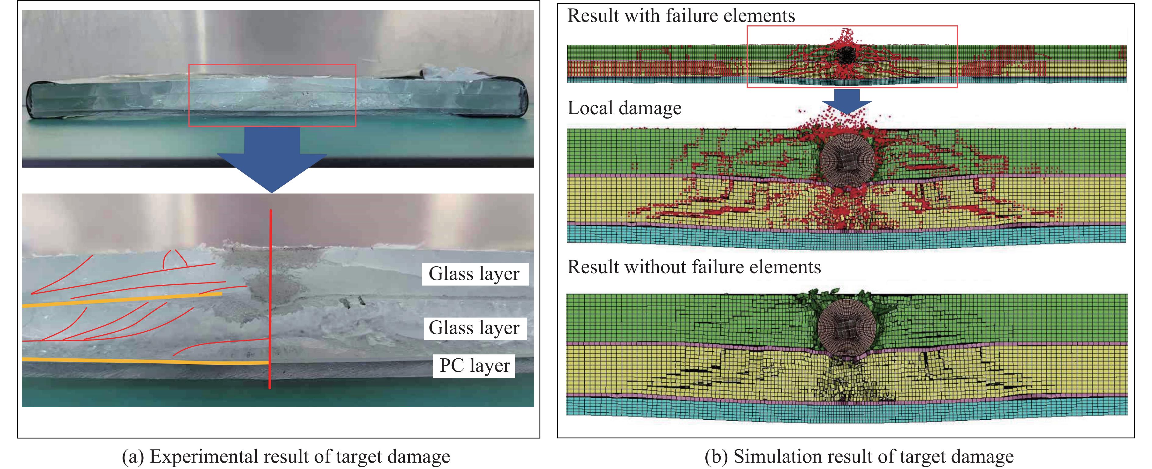 摘要: 玻璃叠层复合装甲具有良好的透光性和抗冲击性能,广泛应用于军事和民用防护领域。由于玻璃容易发生失效或破碎,为了获得靶板的冲击损伤机制,开展了钢球高速撞击下的试验和数值模拟研究。结果表明,在第1层玻璃破碎锥和应力波传播的作用下,第2层玻璃破碎锥体积和整体损伤面积显著大于第1层玻璃。弹丸高速撞击下,玻璃层形成了大量径向和环向裂纹,其中,在Rayleigh波作用下形成的环向裂纹可以阻止径向裂纹传播造成的次生裂纹扩展。根据损伤程度不同,玻璃层分为粉末区、小尺寸碎片区、大尺寸碎片区和径向裂纹区。受应力波传播、靶板弯曲变形以及破碎玻璃的体积膨胀共同作用,玻璃层沿厚度方向出现了竖向裂纹和平行破碎锥面的斜向裂纹。玻璃之间聚氨酯黏结层可造成竖向裂纹偏转,在一定程度上阻碍了裂纹沿厚度方向传播。玻璃/聚氨酯/聚碳酸酯之间,受介质波阻抗不同,导致界面的剪切波作用,胶层出现了局部分层现象。聚碳酸酯依靠自身的塑性变形聚集了破碎装玻璃颗粒,形成了局部高应力状态区域,完成了对弹丸的持续阻碍作用。因此,聚氨酯胶层的变形主要为破碎锥对其直接剪切作用所致。Abstract: The glass laminated composite armor exhibits good light transmission and impact resistance, making it widely used in military and civil protection fields. However, due to the susceptibility of glass to failure and breakage, the experiments and numerical simulations were carried out to investigate the impact damage mechanism of the target plate under high-speed impact of the steel ball projectile. Results show that under the action of breaking cone of first glass layer and stress wave propagation, the volume of breaking cone in the second layer of glass and the overall damage area are significantly larger than those in the first layer. During high-speed impact, many radial and circumferential cracks form in the glass layer. The circumferential cracks, resulting from Rayleigh waves, can prevent the propagation of secondary cracks caused by the radial crack propagation. The glass layer can be divided into the powder region, small fragment region, large fragment region and radial crack region according to different damage degrees. Along the thickness direction, the combined action of stress wave propagation, bending deformation of the target plate and volume expansion of the broken glass result in vertical and oblique cracks along the breaking cone in the glass layer. The PU bonding layer between the glass layer can deflect vertical cracks and hinder the propagation of the cracks along the thickness direction. At the interfaces between the glass/PU/PC layers, shear wave action arises due to the differences in dielectric wave impedance, leading to localized stratification within the adhesive layer. The deformation of PC layer gathers broken glass particles, forming a local high-stress area and complets the continuous obstruction of the projectile. Finally, the deformation of the PU adhesive layer is primarily induced by the shear stress caused from the breaking cone of the glass layer.