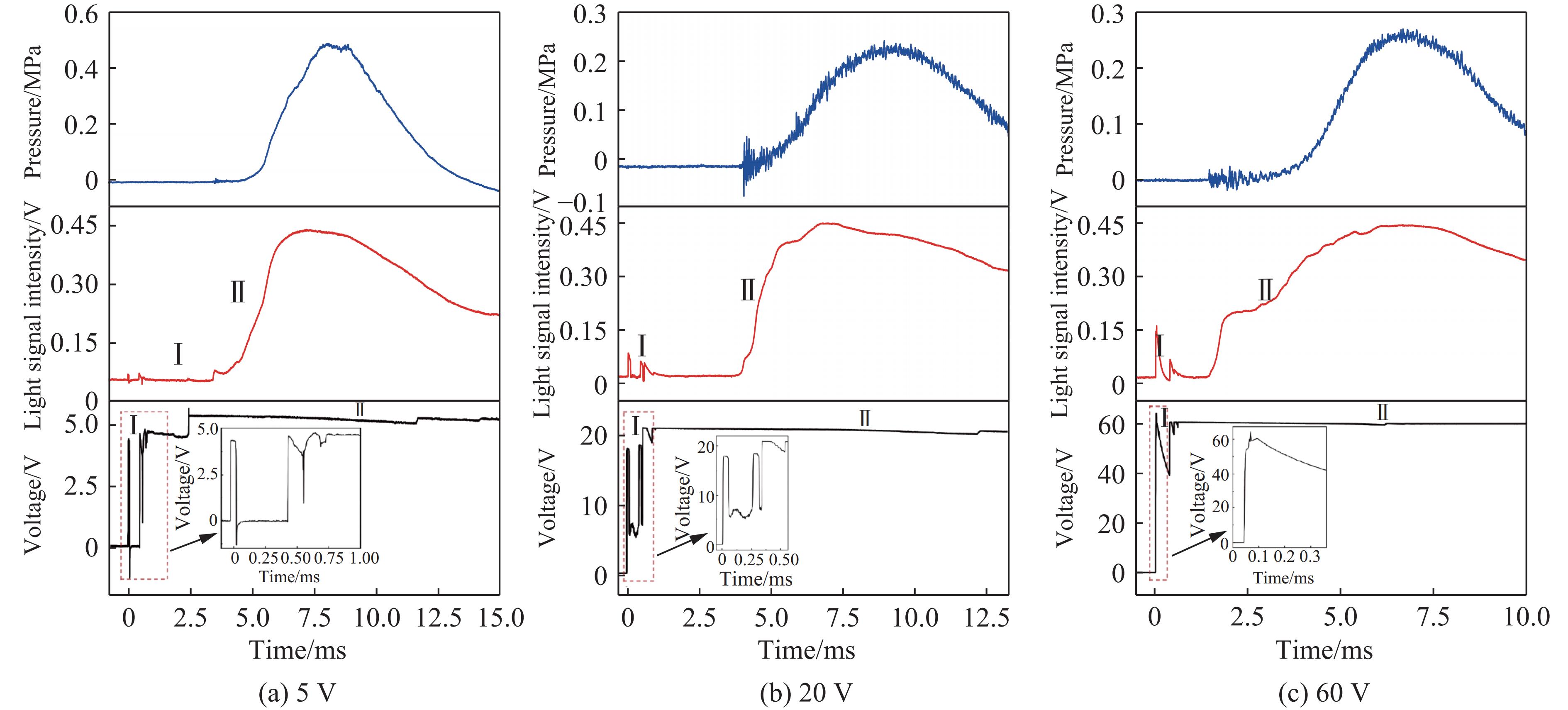 摘要: 桥丝式电点火头作为常用的点火元件,在有限空间内的发火特性是其传爆精确性和可靠性的体现。通过制备测试样品模拟桥丝式电点火头发火的有限空间,设计桥丝式电点火元件发火参数测试系统,测试了电点火元件发火过程的时间结构、有限空间内气体压力以及发火光强等参数;采用高速相机拍摄电点火元件发火的动态过程,建立了电点火元件有限空间内发火动态过程的物理模型。研究表明:随着点火电压的增大,桥丝的相变时间缩短,等离子体阶段的持续时间增加,随后趋于稳定,电点火头的发火时间在5.6 ms左右波动,发火压力时间及发火光强时间在3.0~5.0 ms范围内有界波动。点火电压达到20 V后,发火特性参数趋于稳定,能够可靠输出均匀的点火能量,用于点燃下一序列装药。在气室有限空间内,电点火元件发火动态过程可分为桥丝升温加热药剂、药剂发火、热流扩散和冲击波反射4个阶段。Abstract: As a common ignition element, the ignition characteristic in limited space of a bridgewire electric ignition element (EIE) is the internal embodiment of its precision and reliability as an explosion-transfer sequence. The limited space environment of bridgewire electric fusehead ignition is simulated by preparing test samples and the test system of the ignition parameter is designed to test the time structure of the ignition process, the gas pressure, ignition light intensity and other parameters in limited space; using the high-speed camera to test the dynamic ignition process of the EIE, a physical model of ignition in the limited space of EIE is established. The research shows that with the increase of the ignition voltage, the phase transition time of the bridgewire is shortened, the duration of the plasma stage increases, and then tends to stabilize. The ignition time of the electric fusehead fluctuates at about 5.6 ms, and the ignition pressure time and the ignition light intensity time are maintained in the 3.0–5.0 ms range. After the ignition voltage reaches 20 V, the ignition characteristic parameters tend to be stable, and it can reliably output uniform ignition energy for igniting the next sequence of charging. In the limited space of the air chamber, the dynamic process of EIE can be divided into four stages: bridgewire heating up and heating fusehead agent, fusehead agent ignition, heat flow diffusion and shock wave reflection.