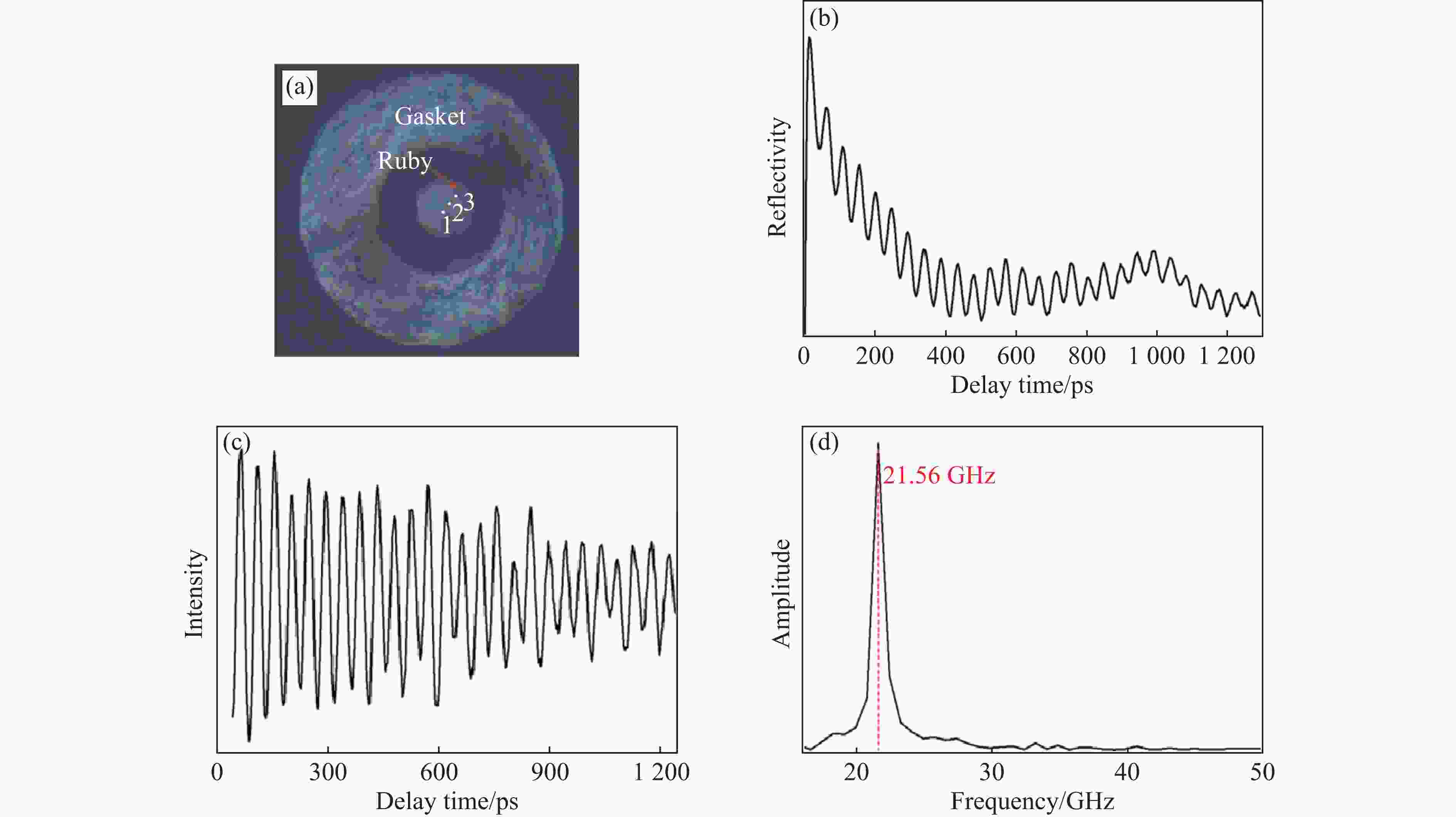图 2 (a) 显微镜下DAC(最外圈的亮色圆环(直径为300 μm)对应金刚石台面,中间的浅色圆片为钨箔,图中标出了测量点1、2和3以及红宝石的位置);(b) 4.1 GPa时点1处采集的超声原始信号;(c) 去除热背底后的布里渊振荡信号;(d) 将(c)进行快速傅里叶变化后得到的频域信号