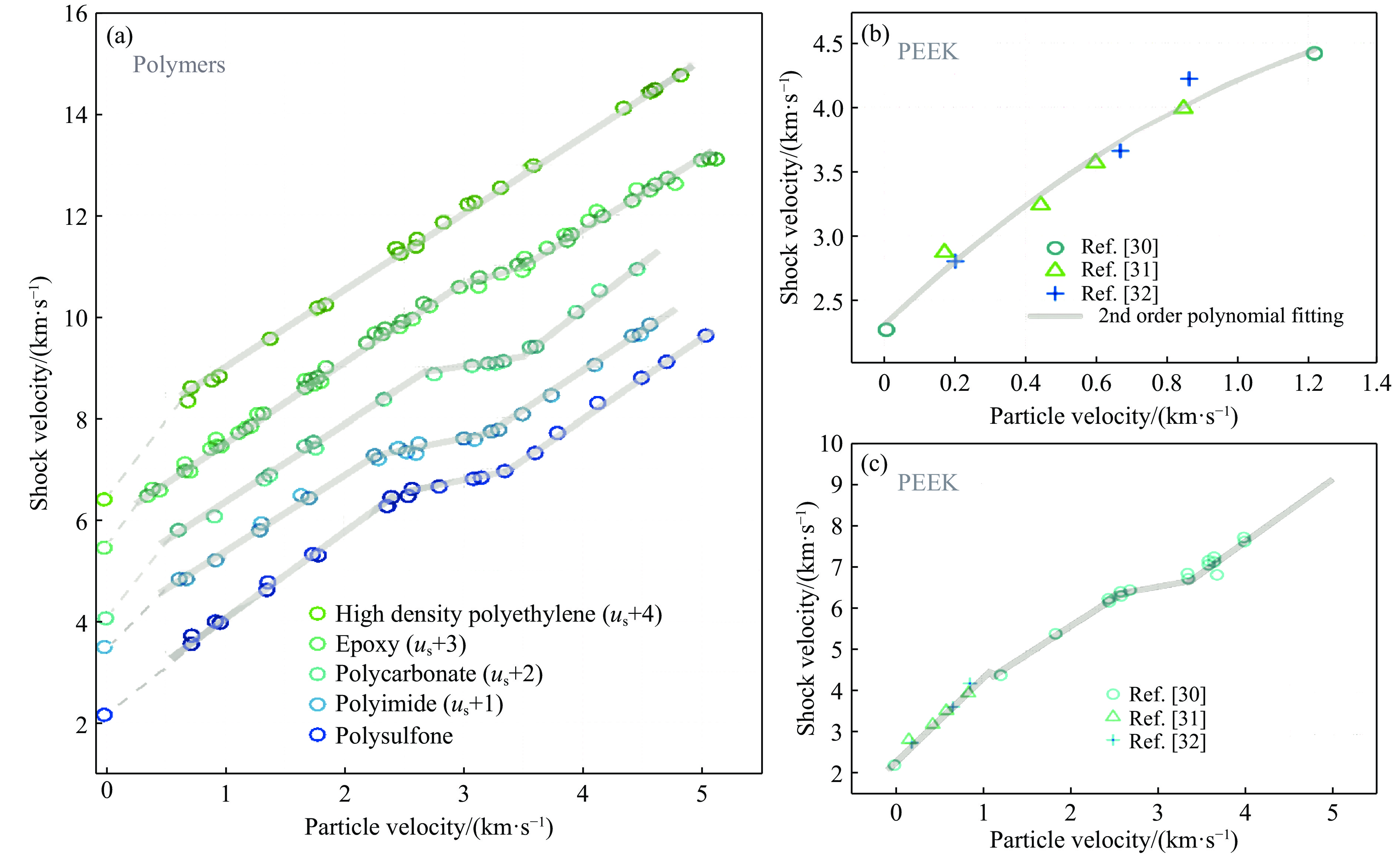 图 3 (a) 聚合物的Hugoniot状态方程[8],(b) PEEK的Hugoniot状态方程在低压段的数据,图中的实线是采用二次函数的拟合结果:us = c0+s1up+$s_2 u_{\mathrm{p}}^2 $,(c) PEEK的Hugoniot状态方程[30–32](图中的实线是一次函数拟合结果,us-up关系需分4段进行拟合)