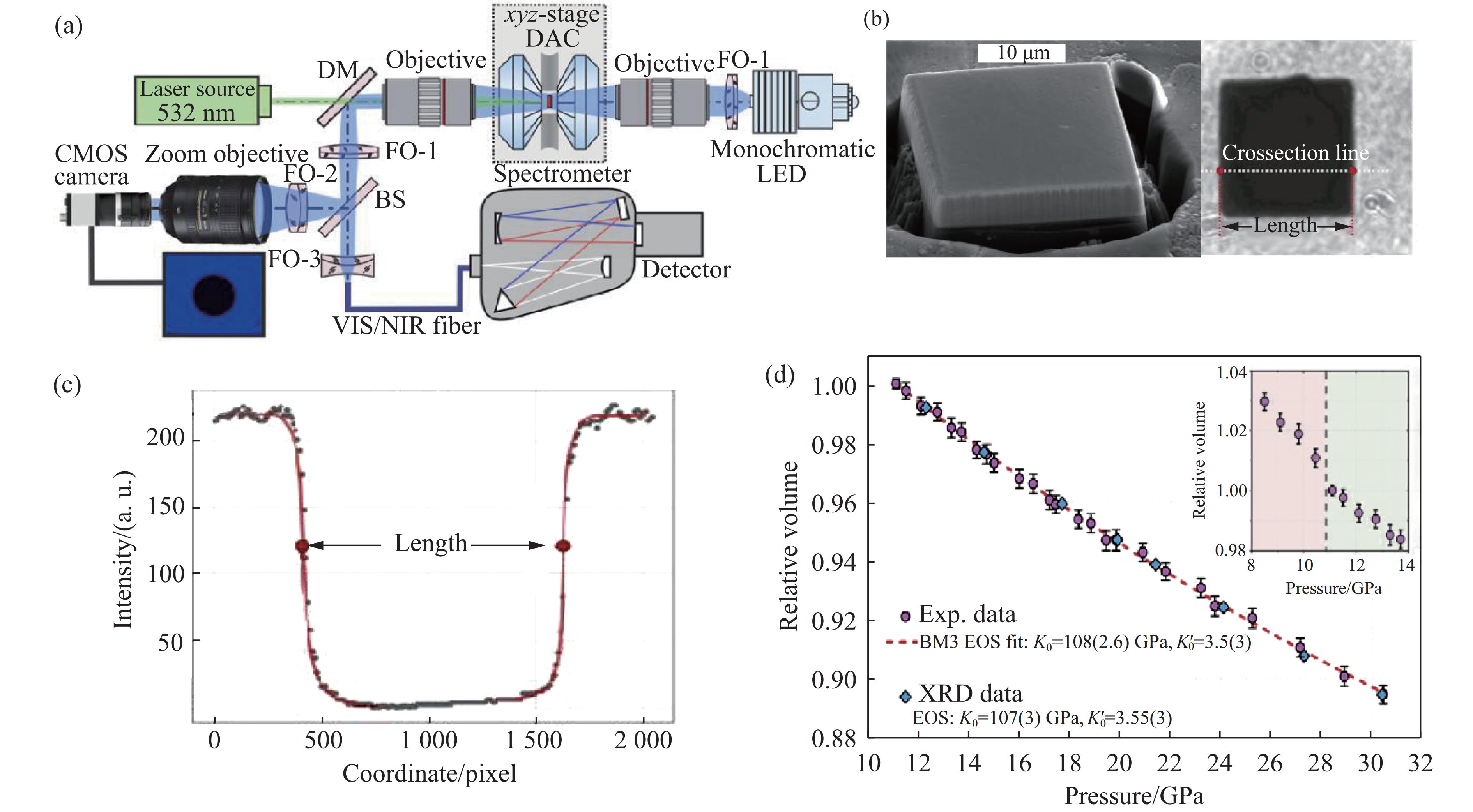 图 5 Fedotenko等[45]发展改进的可见光成像状态方程测量方法:(a) 可见光成像状态方程测量系统(DM(dichroic mirror)为二色镜,FO (focusing optics)为聚焦光学器件,BS为50/50分光镜,CMOS是用于图像观察的相机,VIS(visible)表示可见光,NIR(near-infrared)表示近红外光),(b) 利用FIB聚焦离子束切割的规则形状的样品,(c) 样品尺寸的判读方法,(d) 可见光成像测量获得的金属Ti的状态方程与X射线衍射实验测量结果的对比,其中,${K_0} $和${{{K}}_0 '} $分别为体积模量及体积模量在环境压力下的压力导数