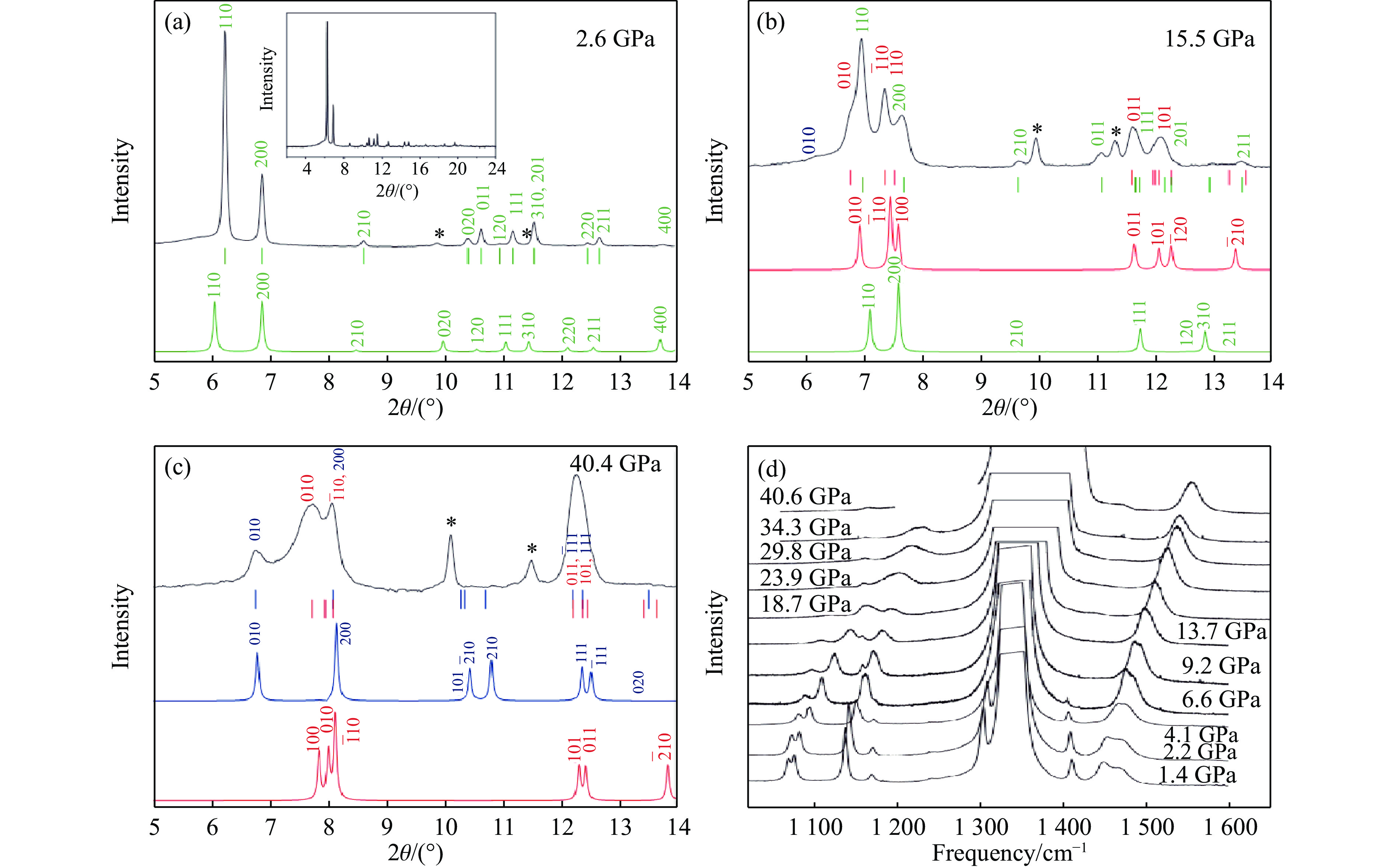 图 7 (a)~(c)不同压力下PE的典型衍射谱[47](绿色为理论模拟的正交的Pnma结构的衍射谱,红色为单斜的P21/m结构的衍射谱,蓝色为单斜的A2/m结构的衍射谱),(d)不同压力下PE的拉曼谱[48](