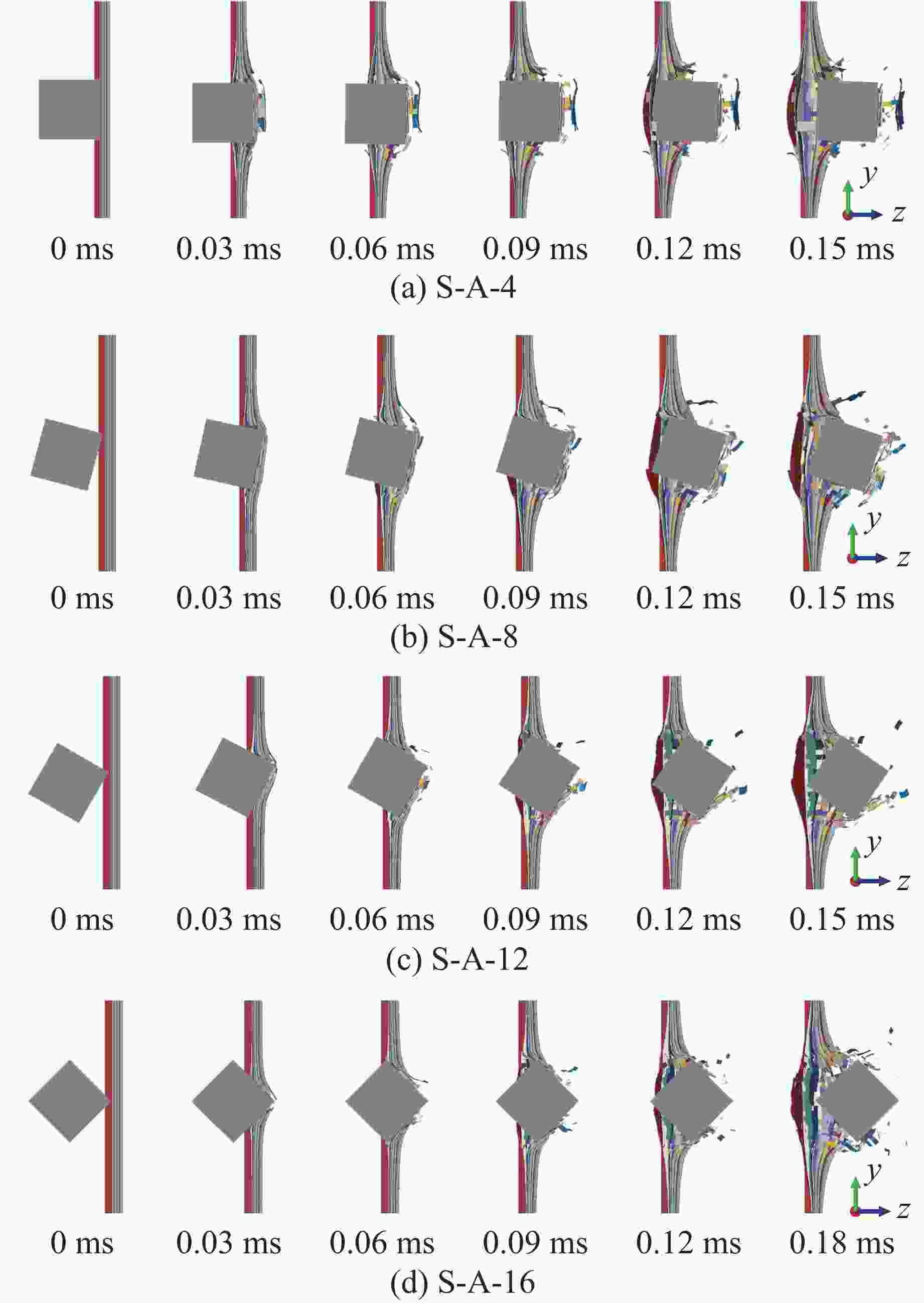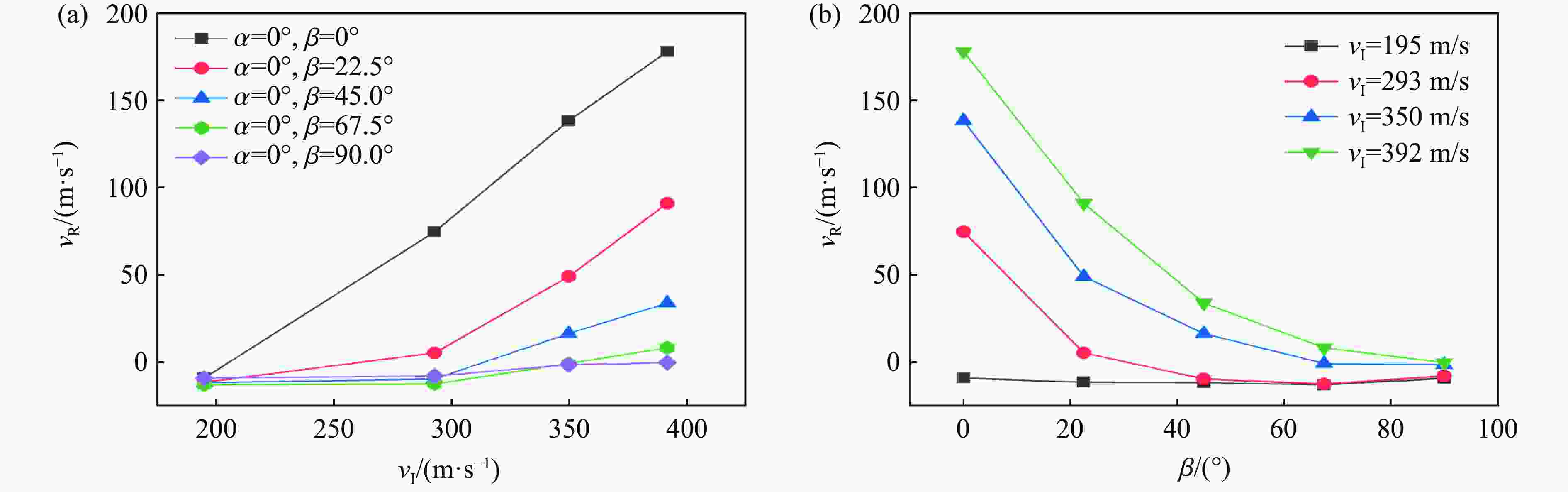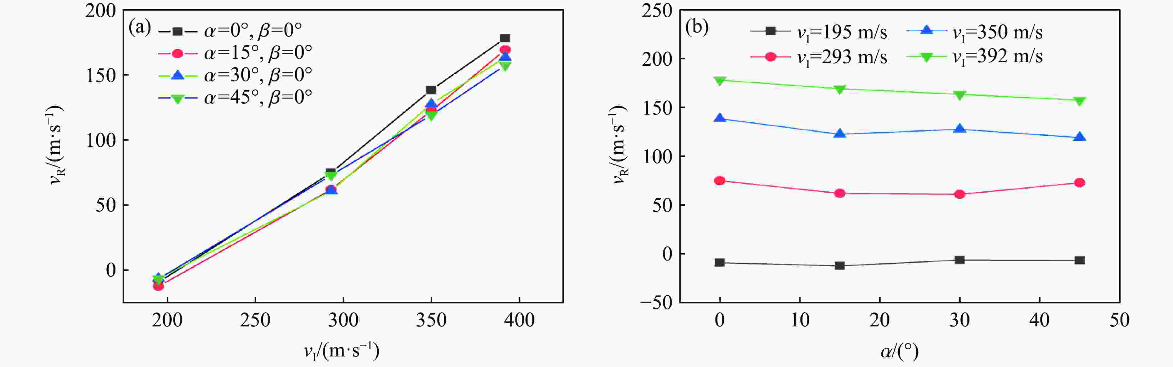 Specimens α/(°) β/(°) vI/(m·s−1) vR/(m·s−1) S-A-1/S-B-1 0 0 195 −9.13 S-A-2/S-B-2 0 0 293 74.79 S-A-3/S-B-3 0 0 350 138.44 S-A-4/S-B-4 0 0 392 178.14 S-A-5 15 0 195 −12.46 S-A-6 15 0 293 61.87 S-A-7 15 0 350 122.46 S-A-8 15 0 392 169.24 S-A-9 30 0 195 −6.42 S-A-10 30 0 293 60.83 S-A-11 30 0 350 127.58 S-A-12 30 0 392 163.38 S-A-13 45 0 195 −6.75 S-A-14 45 0 293 72.79 S-A-15 45 0 350 119.09 S-A-16 45 0 392 157.46 S-B-5 0 22.5 195 −11.57 S-B-6 0 22.5 293 5.18 S-B-7 0 22.5 350 48.98 S-B-8 0 22.5 392 91.04 S-B-9 0 45.0 195 −11.90 S-B-10 0 45.0 293 −9.70 S-B-11 0 45.0 350 16.25 S-B-12 0 45.0 392 33.90 S-B-13 0 67.5 195 −13.18 S-B-14 0 67.5 293 −12.56 S-B-15 0 67.5 350 −0.87 S-B-16 0 67.5 392 8.13 S-B-17 0 90.0 195 −9.32 S-B-18 0 90.0 293 −8.03 S-B-19 0 90.0 350 −1.54 S-B-20 0 90.0 392 −0.45 -