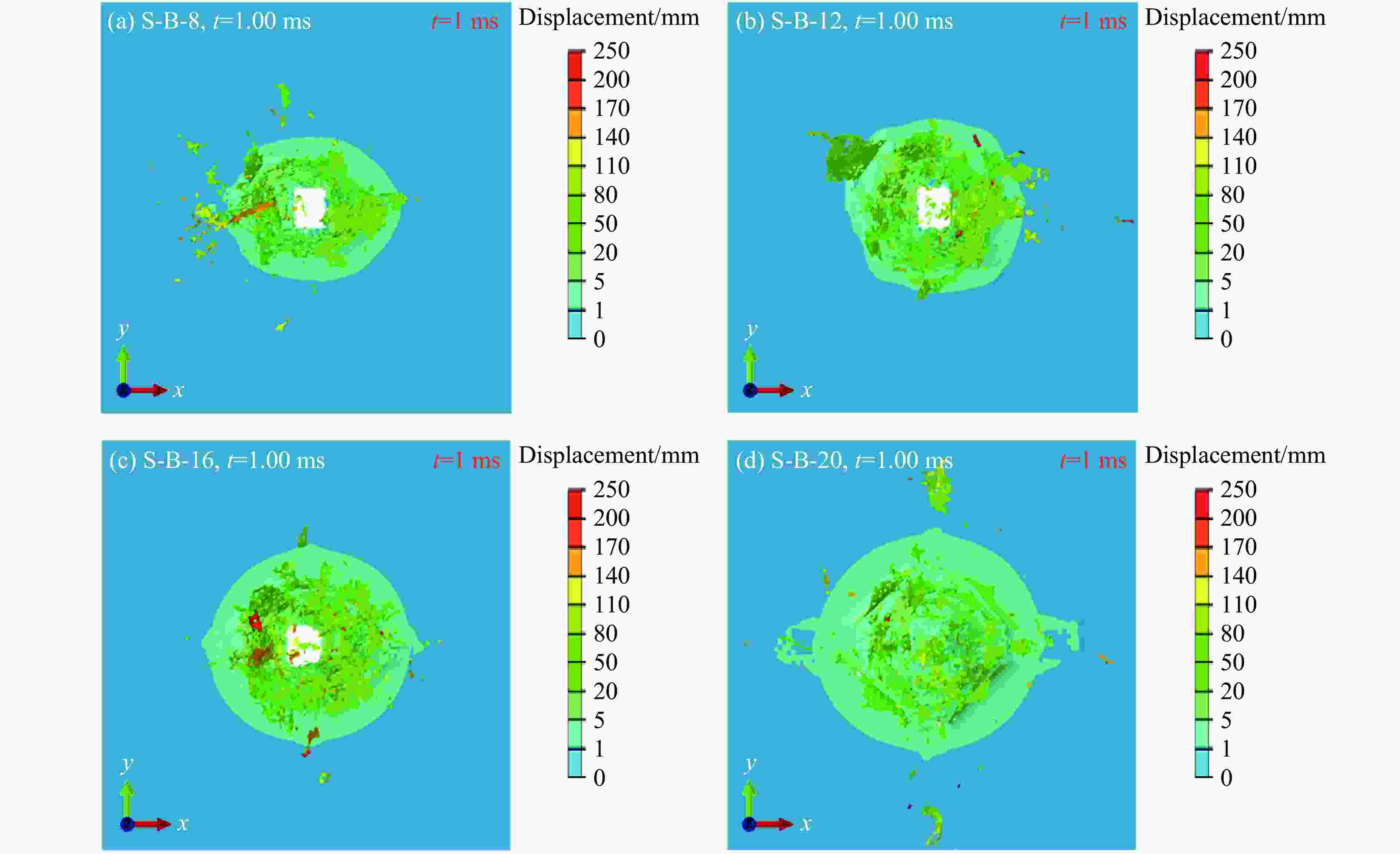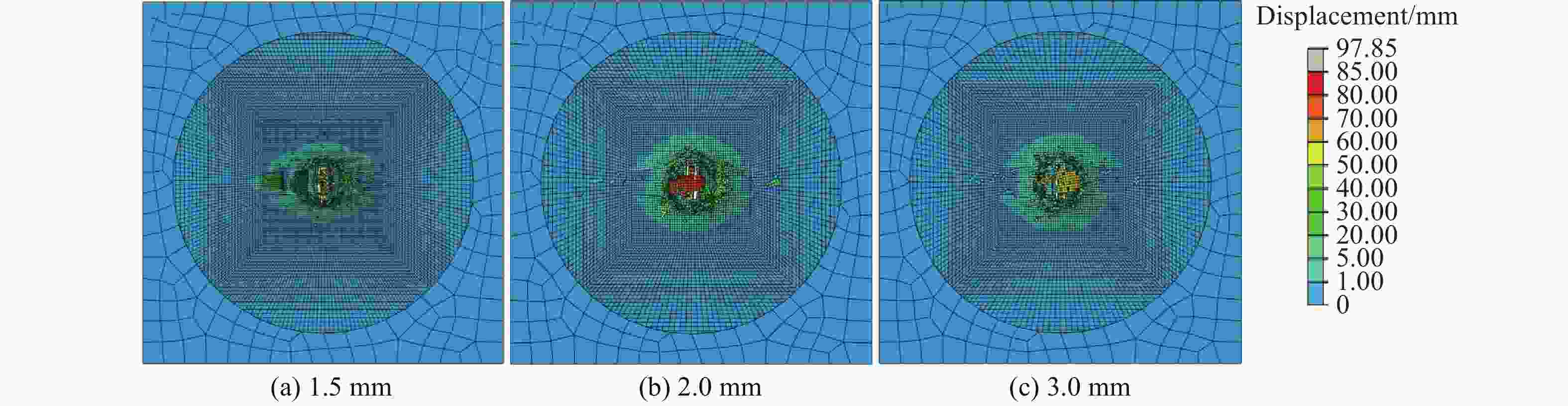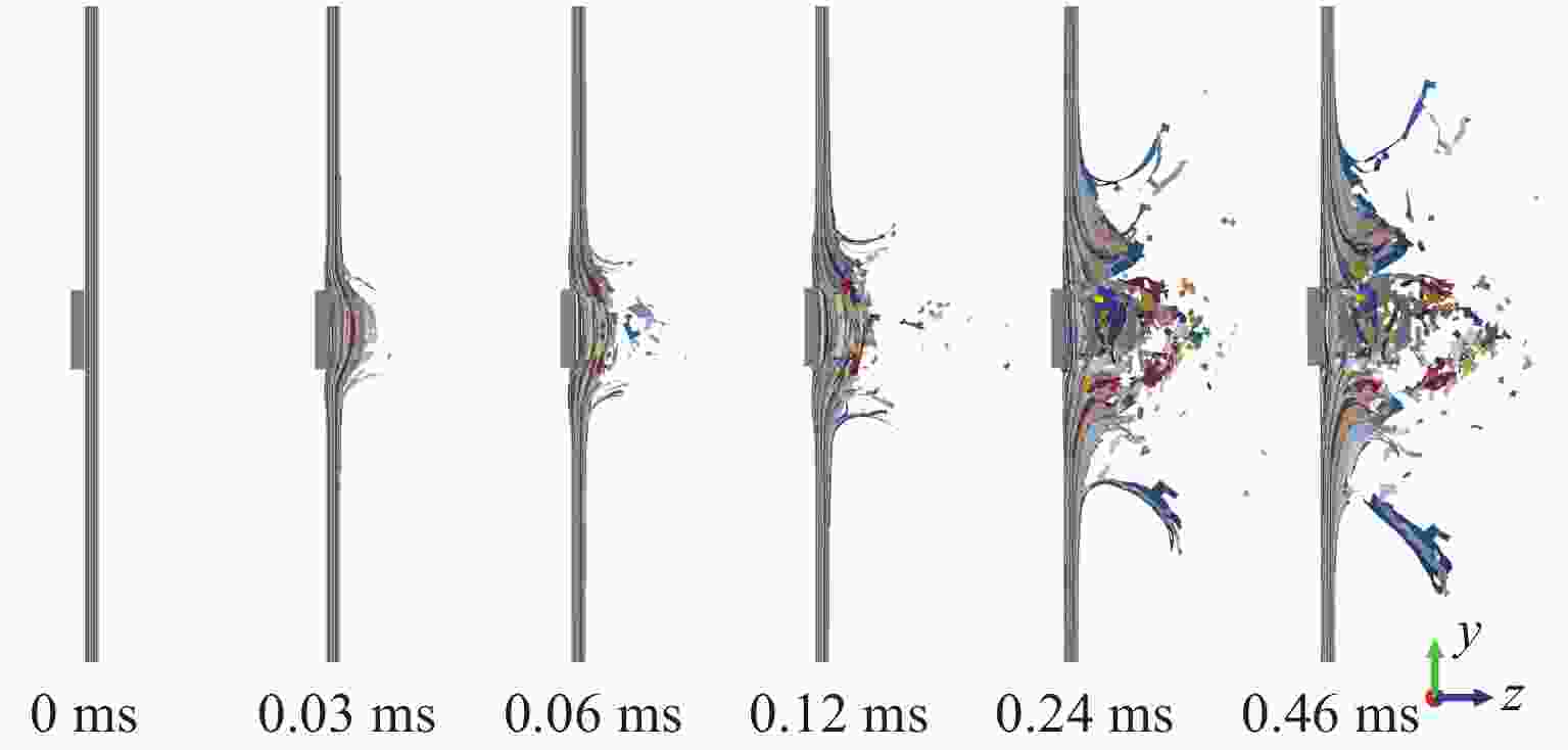 摘要: 碳纤维增强聚合物(carbon fibre-reinforced polymer, CFRP)复合材料在破片冲击作用下的复杂侵彻行为和失效机制尚不明确,这一现状制约了其在防护领域的应用。针对实验手段在获取侵彻历程信息时面临的监测难度大、成本高昂等问题,构建了CFRP复合材料破片冲击有限元分析(finite element analysis, FEA)模型,采用基于应变的三维 Hashin 失效准则,并引入强度的速率依赖性关系。通过与实验结果对比,验证了FEA模型的有效性。模拟结果表明,在不同TNT当量和破片距爆点距离的条件下,破片的初速度和撞击倾角存在显著差异。将破片相对于靶板上不同平面间的倾角分别定义为α和β。固定冲击速度仅改变倾角α时,试样的吸能效果和冲击速度敏感性未表现出明显差异,而改变倾角β时试样的吸能效果和冲击速度敏感性差异显著。当β=0°时,CFRP复合材料在195~392 m/s的速度范围内表现出明显的冲击速度敏感性。当α=0°时,CFRP复合材料在195~392 m/s的冲击速度范围内的冲击速度敏感性随着β的增大而逐渐减弱。可视化的侵彻过程和破坏区域表明,接触面积、接触时间和变形程度是导致CFRP复合材料吸能效果和冲击速度敏感性差异的重要因素。