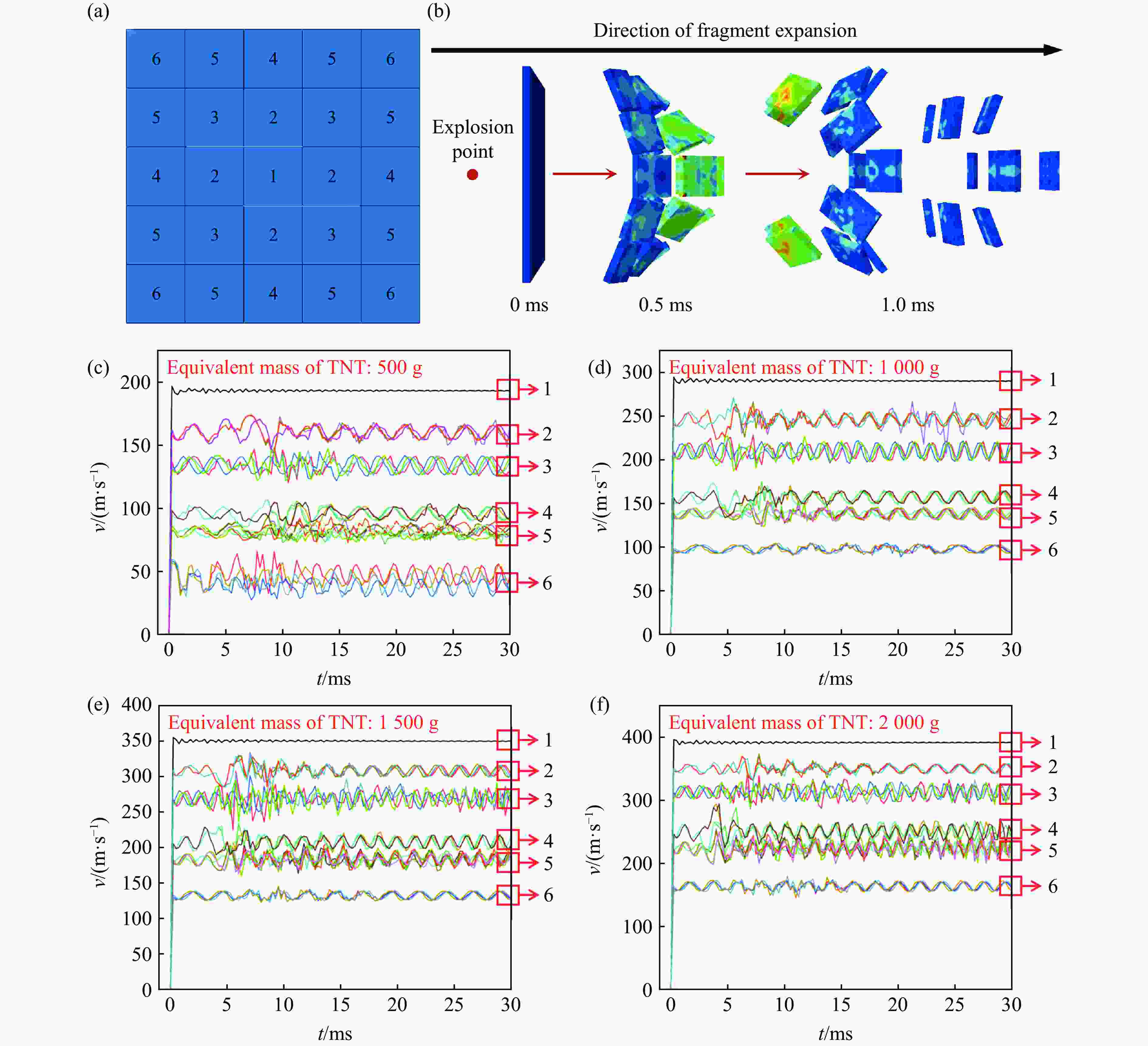 Figure 6. (a) Prefabricated fragment group and fragment location marking (from position 1 to position 6, the distance between fragment and explosion point increases); (b) the flight attitude of fragments at different locations under explosive loading; (c)−(f) is the curve of the impact velocity of each fragment in the fragment group with the TNT equivalent of 500, 1 000, 1 500 and 2 000 g, respectively, indicating the impact velocity distribution of fragments at positions 1 to 6