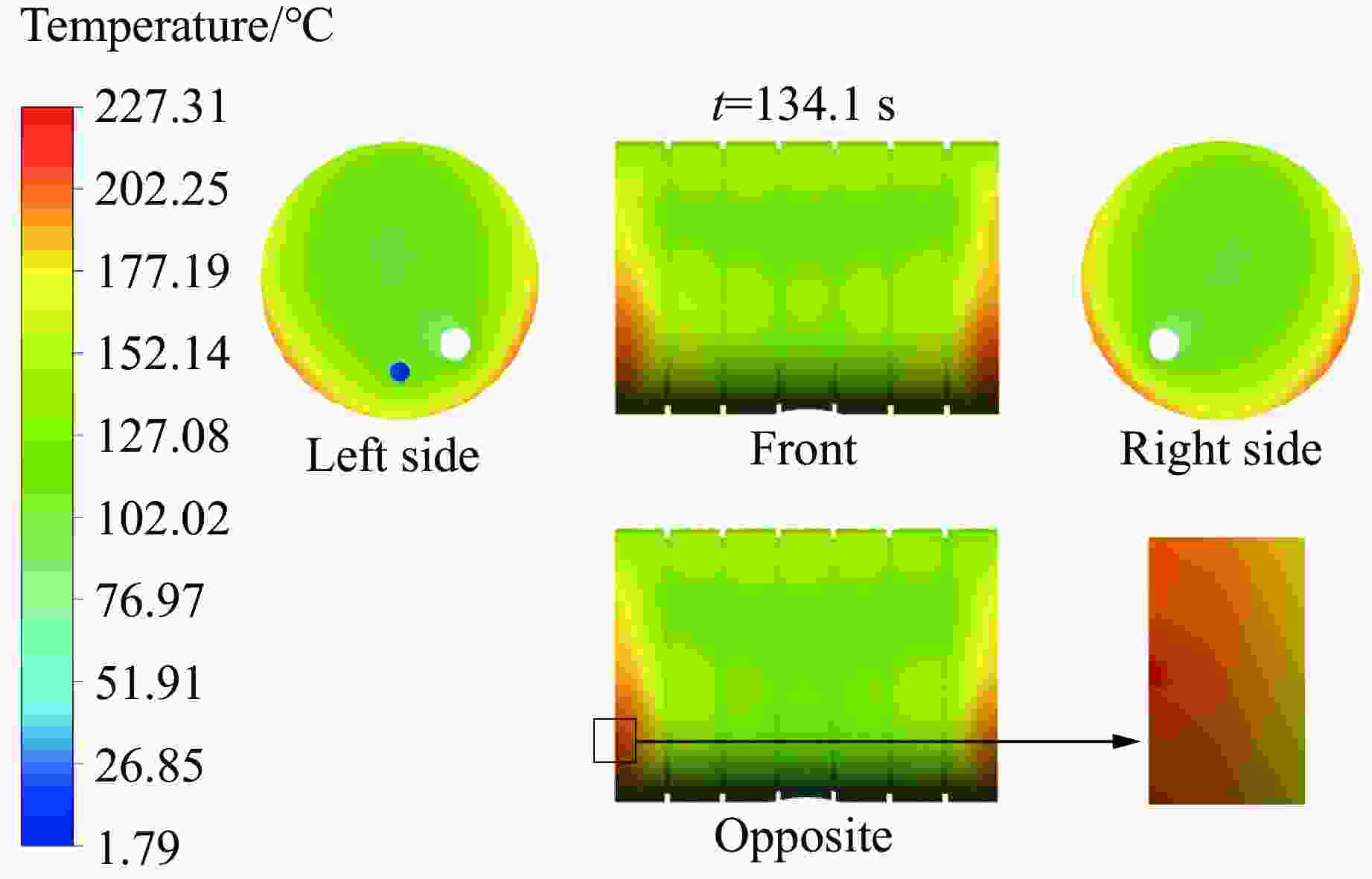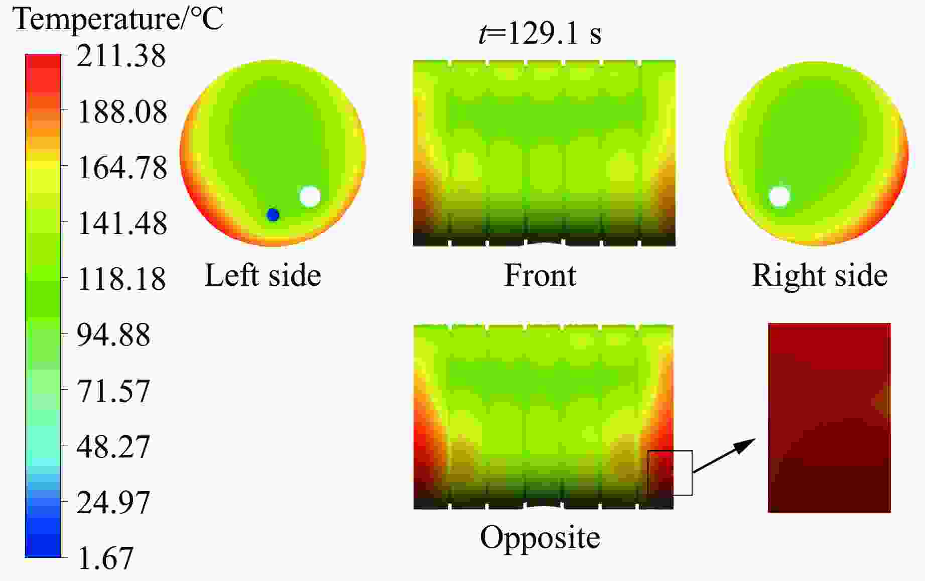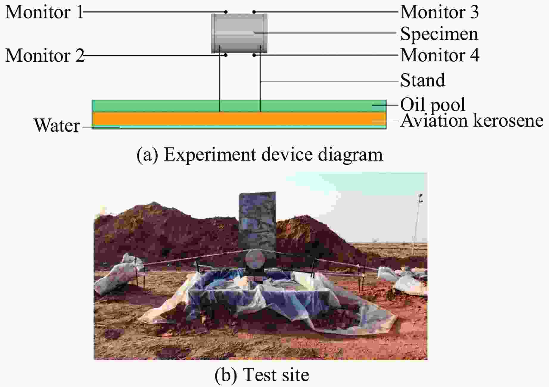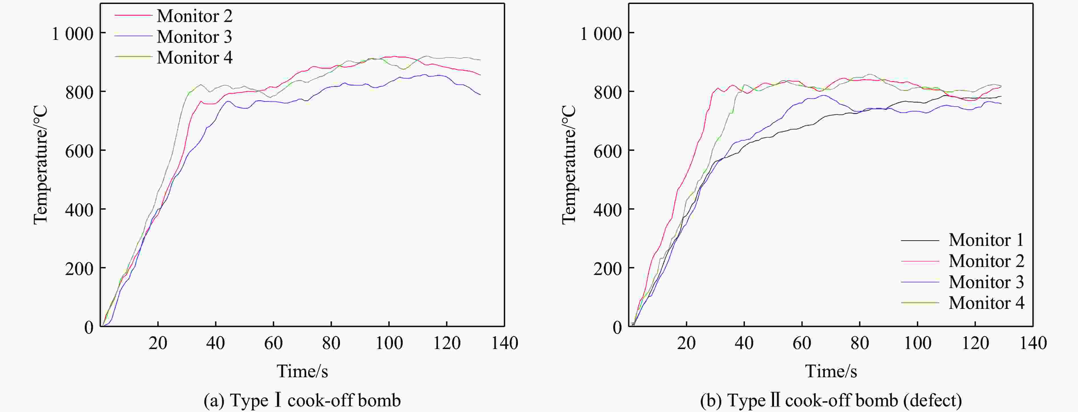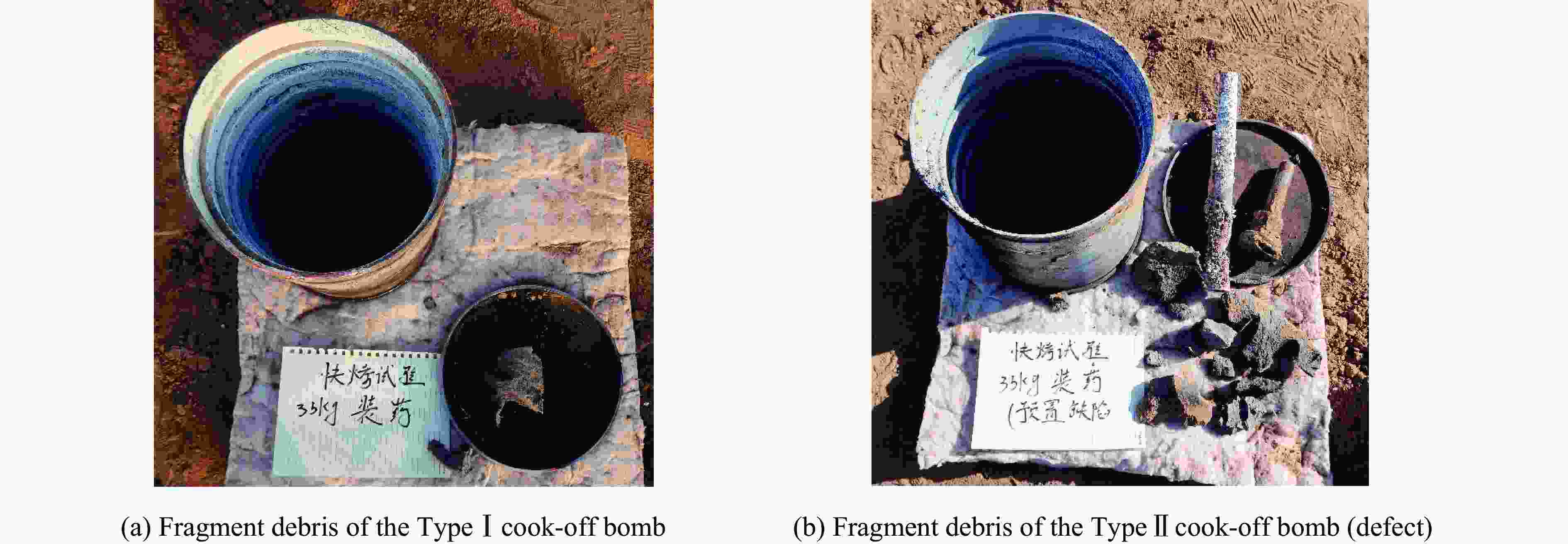 摘要: 为研究炸药装药缺陷对快速烤燃响应特性的影响,对Ⅰ型烤燃弹(无缺陷装药)和Ⅱ型烤燃弹(含缺陷装药)进行了快速烤燃试验。Ⅱ型烤燃弹的响应时间(128 s)短于Ⅰ型烤燃弹(132 s),且在5 m处的最大冲击波超压峰值(62.7 kPa)高于Ⅰ型烤燃弹(12.5 kPa)。试验结果表明,点火后Ⅱ型烤燃弹的响应较无缺陷的Ⅰ型烤燃弹更为剧烈,但二者的响应等级仍为燃烧反应。在此基础上,通过Fluent软件建立了池火与烤燃试件相互耦合的计算模型,模拟了试件在火焰中的受热情况。研究发现,缺陷越靠近装药表面,缺陷处的局部温度越高,但对装药的响应时间无明显影响。Abstract: To study the effect of explosive charge defects on fast cook-off response characteristics, fast cook-off tests were conducted on type Ⅰ cook-off bomb (with defect-free charges) and type Ⅱ cook-off bomb (with defective charges). The results showed that the response time of type Ⅱ cook-off bomb (128 s) is shorter than that of type Ⅰ cook-off bomb (132 s), and the maximum shock wave overpressure at 5 m (62.7 kPa) is higher than that of type Ⅰ cook-off bomb (12.5 kPa). This indicates that the combustion of the type Ⅱ cook-off bomb was more intense than the defect-free type Ⅰ cook-off bomb after ignition, although both of them exhibit the same response level of burning reaction. Furthermore, a coupled computational model of pool fire and cook-off specimen was established to simulate the heating of the specimen in the flame using Fluent software. It is found that the closer the defect is to the charge surface, the higher local temperature at the defect, but it does not significantly affect the response time of explosive charges.