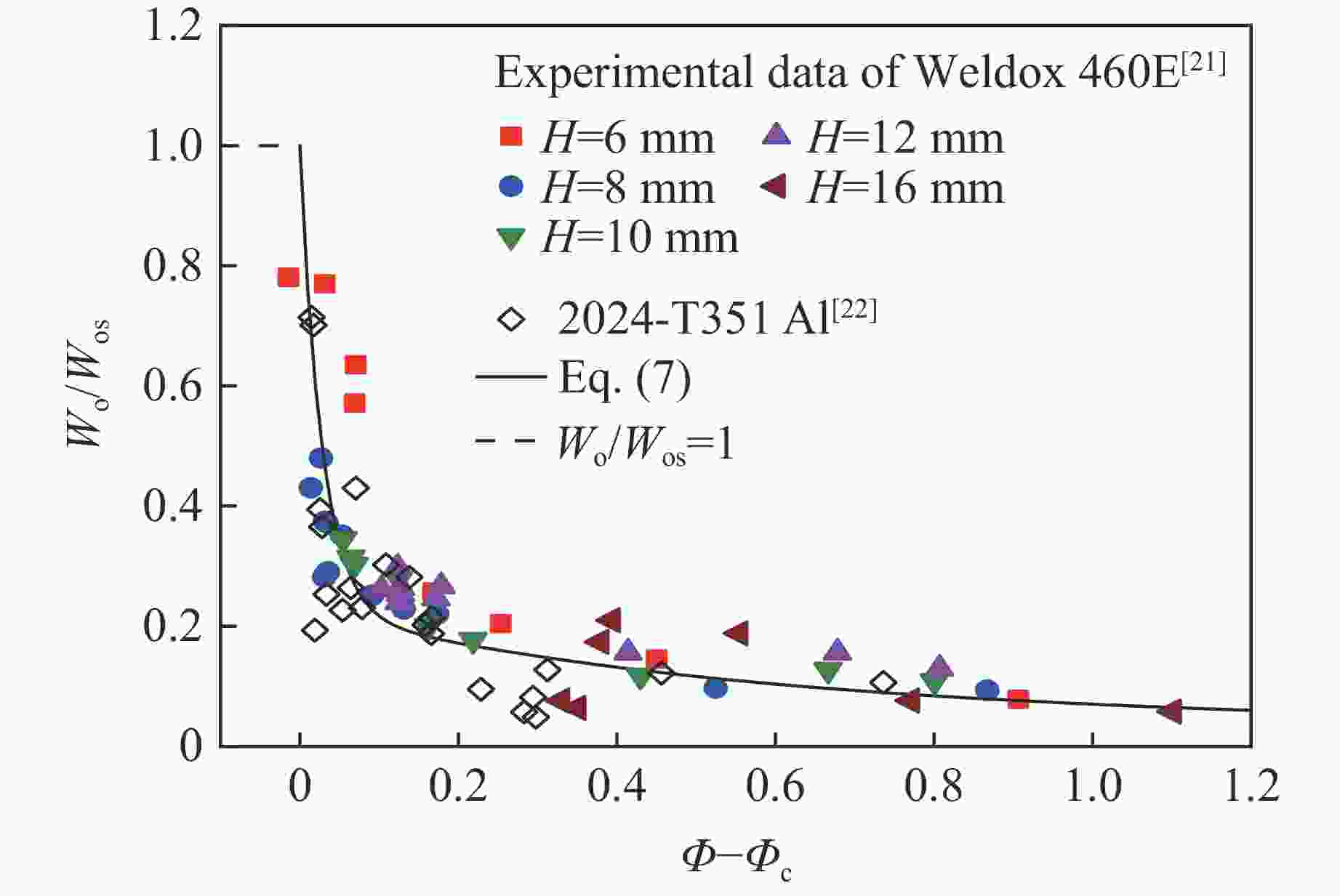 Figure 1. Comparison of Eq. (7) with the experimental data of Wo/Wos versus Φ−Φc[21] for the Weldox 460E steel plates perforated by a flat-nosed projectile
