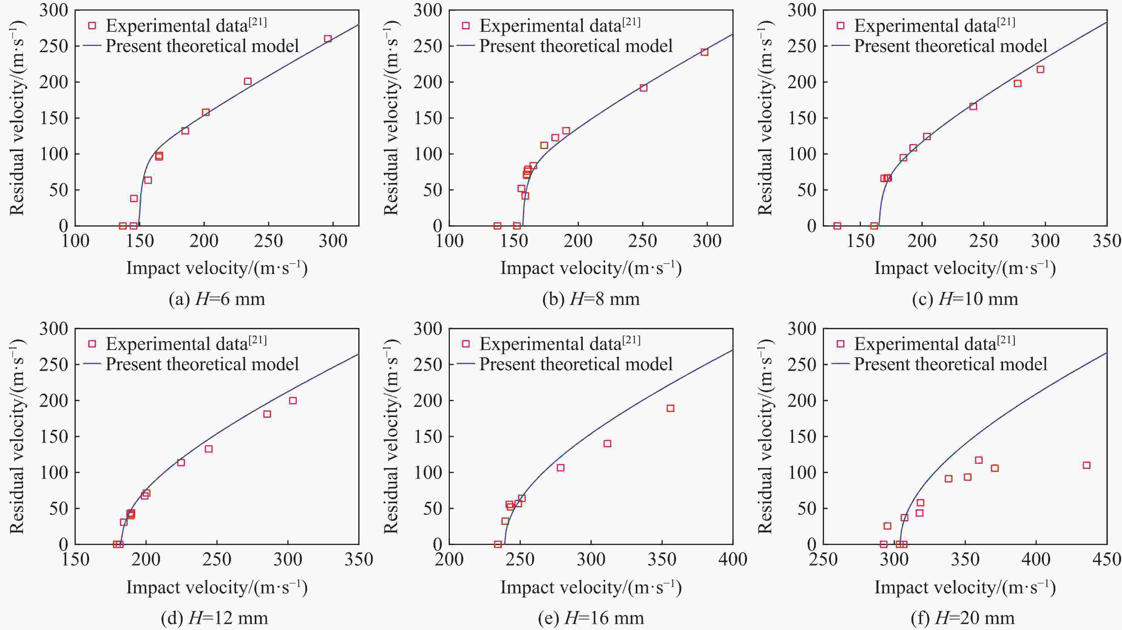 摘要: 利用先前提出的统一框架内平头弹穿透有限金属靶板的理论模型,对平头弹撞击下Weldox 460E钢板的穿透问题进行了研究。该模型包含一个无量纲半经验方程,考虑了整体变形吸能随撞击速度的变化,由此讨论了Weldox 460E钢板的能量吸收机理,解释了“平台”现象(随着板厚的增大,弹道极限的提高有限),并将Weldox 460E钢板结果与先前研究的2024-T351铝板结果进行了对比。结果表明:模型预测的Weldox 460E钢板在平头弹撞击下的整体变形与撞击速度之间的关系、弹道极限、残余速度以及破坏模式临界转化条件等均与实验结果吻合得很好;模型也能很好地预测中厚板范围内的“平台”现象。与2024-T351铝板相比,被平头弹贯穿的Weldox 460E钢板的压入吸能在总吸能中的占比明显更大,这是两种靶板材料的不同特性所导致的。Abstract: A theoretical analysis on the perforation of Weldox 460E steel plates struck by flat-nosed projectiles is presented using a previously developed model within a unified framework. This model contains a dimensionless empirical equation to describe the variation of energy absorbed through global deformation as a function of impact velocity. The study further investigates the energy absorption mechanisms of Weldox 460E steel plates, with particular focus on the “plateau” phenomenon, i. e., limited increase in ballistic limit with increasing plate thickness. This phenomenon is explained and compared with results from previously studied 2024-T351 aluminium plates. The model predictions agree well with experimental data for Weldox 460E steel plates impacted by flat-nosed projectiles, including: relationship between global deformation and impact velocity, ballistic limit, residual velocity, and critical conditions for the transition of failure modes. Moreover, the model effectively predicts the “plateau” phenomenon observed in intermediate plate thickness range. It is also found that the indentation absorption energy contributes a significantly larger fraction of the total absorption energy in Weldox 460E steel plates perforated by flat-nosed projectiles than in 2024-T351 aluminium plates, due to the differences in material properties.