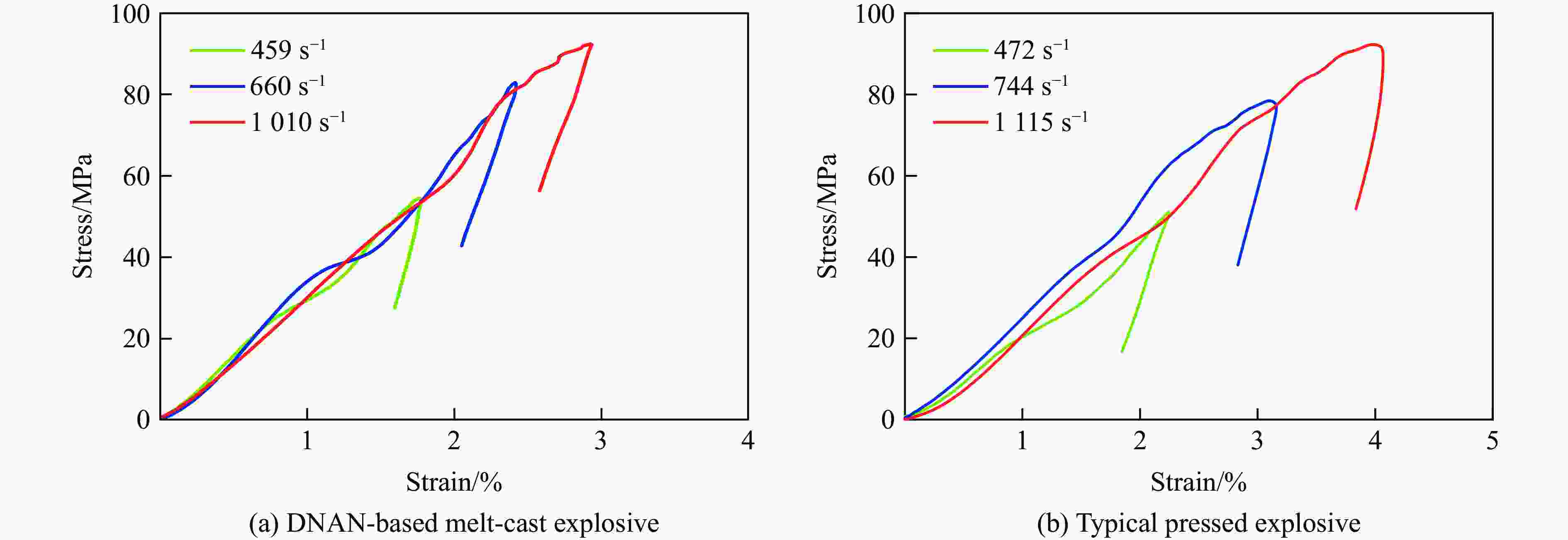 Explosives Strain rate/s−1 σm/MPa Strain at σm/% DNAN-based melt-cast explosive 459 54.46 1.76 660 82.88 2.40 1010 92.38 2.93 Typical pressed explosive 472 51.05 2.24 744 78.46 3.10 1115 92.28 3.98 表 3 落锤冲击加载试验结果