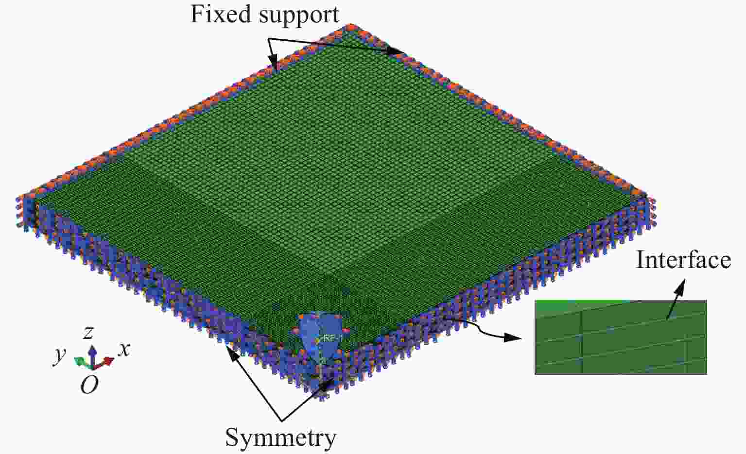 Method Tension strength/MPa Compressive strength/MPa Shear strength/MPa Xt Yt Zt Xc Yc Zc S12 S13 S23 Simulation 2865.11 72.72 72.72 1938.67 208.44 208.44 64.50 64.50 52.26 Equation 2835.34 74.39 74.39 1983.94 224.09 224.09 Error/% 1.05 −2.24 −2.24 −2.28 −6.99 −6.99 表 6 宏观等效力学参数对比
