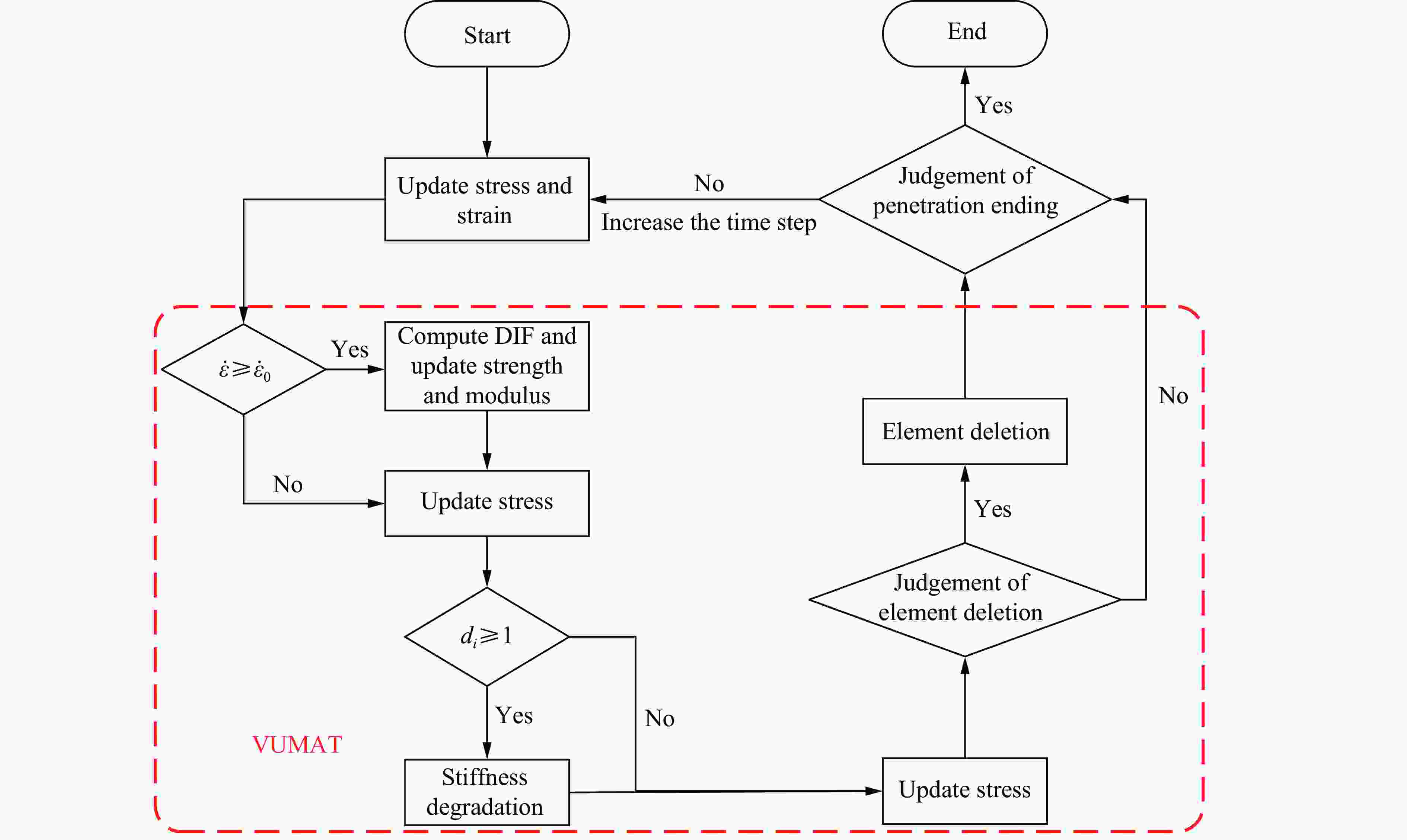 摘要: 针对纤维增强复合材料层合板结构设计和抗侵彻数值仿真需要大量材料参数和动态试验数据的问题,以碳纤维增强复合材料层合板为研究对象,采用多尺度模拟方法,实现了纤维丝-纤维束-层合板的微观-介观-宏观力学性能和抗侵彻能力的全流程数值仿真预测。首先,建立微观代表性体积单元(representative volume elements,RVE),基于最大应力准则,预测出纤维束的力学性能;然后,根据编织结构的空间特征建立介观RVE模型,采用Hashin和Hou的失效准则,预测出宏观等效力学性能;最后,根据已发表的试验数据,建立了宏观弹道侵彻数值模型,提出了一种考虑材料应变率效应的改进Hashin失效准则,进而研究了弹道侵彻作用下纤维增强复合材料层合板的剩余速度和损伤特征。结果表明:试验与仿真得到的剩余速度的相对误差在5%以内,宏观数值模型准确捕捉到了纤维断裂、层间分层等损伤模式,验证了多尺度模拟方法的合理性和准确性;拟合得到了弹道极限速度随板厚变化的关系式,两者呈线性关系,且相关系数达0.97以上。研究结果有助于实现纤维增强复合材料层合板抗侵彻的低成本、短周期结构设计,对纤维增强复合材料层合板的正向性能预测和逆向结构设计均具有重要的科学和工程应用价值。Abstract: Aiming at the problem that a large number of material parameters and required for the structural design and numerical simulation of penetration resistance of fiber reinforced composite laminates, this article takes carbon fiber reinforced composite laminates as the research object, and adopts multi-scale simulation method to realize the whole process numerical simulation prediction of micro-, meso-, and macro-scale mechanical properties and penetration resistance of fiber-bundle-laminates. Firstly, microscopic representative volume elements (RVE) were established to predict the mechanical properties of fiber bundles based on the maximum stress criterion. Then, based on Hashin and Hou’s failure criteria, the macroscopic equivalent mechanical properties were predicted by the mesoscopic RVE models established according to the spatial characteristics of braided structures. Finally, an improved Hashin failure criterion considering the strain rate effect was proposed, and the numerical model of ballistic penetration was established based on the literature tests to study the residual velocities and damage characteristics. The results show that the errors of residual velocity results are less than 5%, and the macroscopic numerical models can accurately simulate the damage modes such as fiber fracture as well as interlayer delamination, which verifies the rationality and accuracy of multi-scale simulation method in this article. The relationship between the ballistic limit velocity and the thickness of the plate is linear and the correlation coefficient is above 0.97. The findings of this paper can help to realize the design of low-cost and short-period fiber reinforced composite laminates, which has important scientific and engineering application values for property prediction and inverse structural design of fiber reinforced composite laminates.