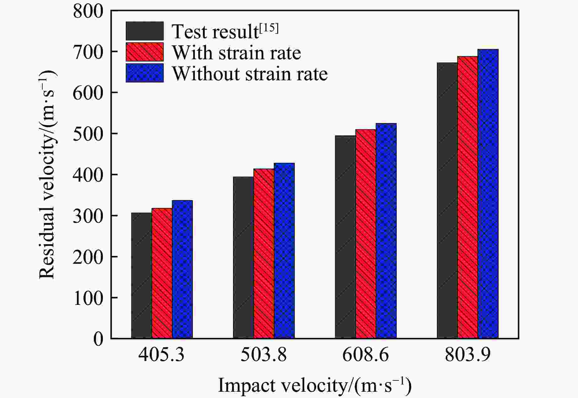 Method E1/GPa E2/GPa E3/GPa G12/GPa G13/GPa G23/GPa Xt/MPa Simulation 56.50 56.50 7.90 3.59 2.51 2.51 740.37 Test[15] 57.94 57.94 3.59 726 Error/% −2.49 −2.49 0 1.98 Method Yt/MPa Xc/MPa Yc/MPa S12/MPa S13 /MPa S23/MPa Simulation 740.37 630.34 630.34 64.95 62.88 62.88 Test[15] 726 113.29 65.82 65.82 Error/% 1.98 −42.67 −4.47 −4.47 $ {t}_{\mathrm{n}}^{0} $/MPa $ {t}_{\mathrm{s}}^{0} $/MPa $ {t}_{\mathrm{t}}^{0} $/MPa $ {G}_{\mathrm{c}}^{{Ⅰ}} $/(kJ·m−2) $ {G}_{\mathrm{c}}^{{Ⅱ}} $/(kJ·m−2) $ {G}_{\mathrm{c}}^{{Ⅲ}} $/(kJ·m−2) 50 90 90 0.52 0.92 0.92 表 8 仿真与试验得到的剩余速度和单位面密度吸能的对比