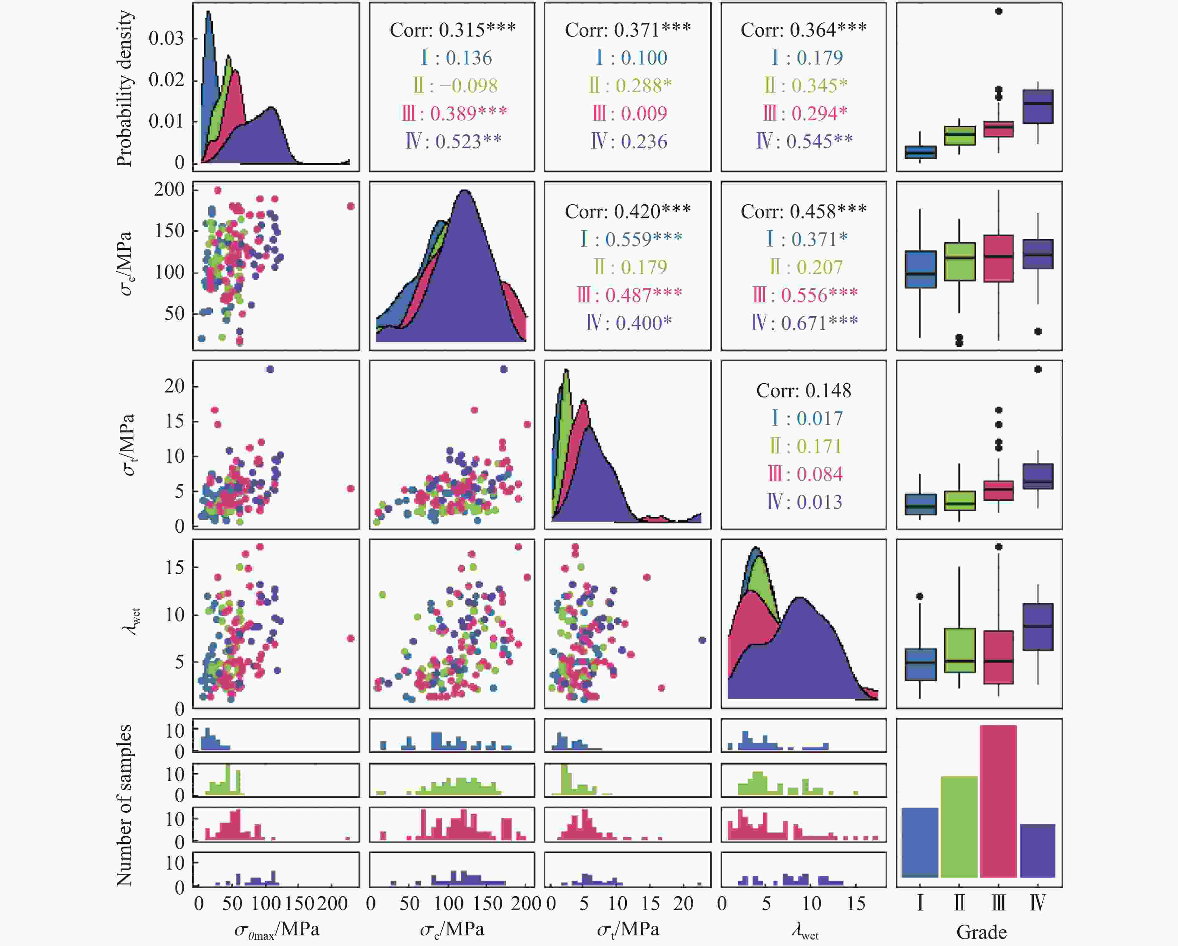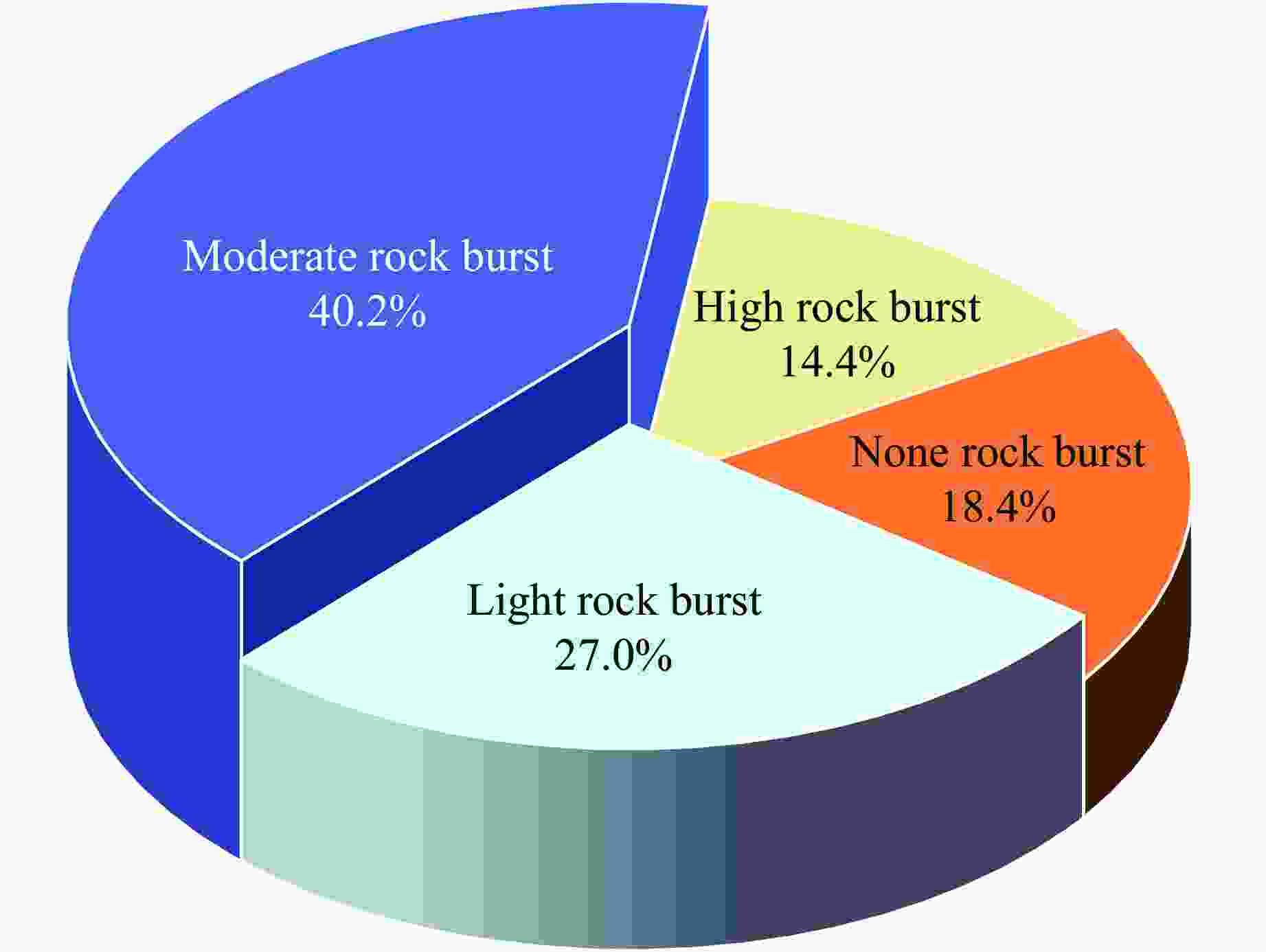 Rock burst grade Rock burst evaluation index σθmax/MPa σc/MPa σt/MPa λwet Ⅰ 0–24 0–80 0–5 0–2.0 Ⅱ 24–60 80–120 5–7 2.0–3.5 Ⅲ 60–126 120–180 7–9 3.5–5.0 Ⅳ 126–200 180–320 9–30 5.0–20.0 表 4 数据集统计参数