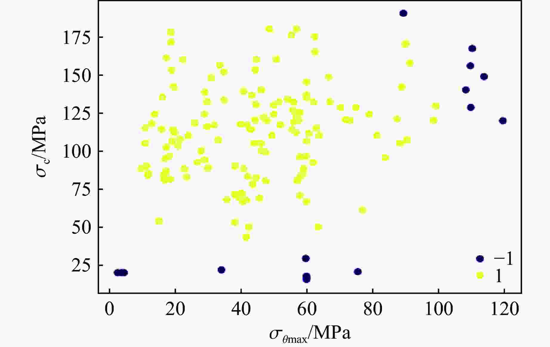 Rock burst index σθmax/MPa σc/MPa σt/MPa λwet Maximum value 221.00 200.72 22.60 17.13 Minimum value 3.80 15.50 0.70 0.88 Mean value 50.42 113.68 4.94 6.16 Standard deviation 29.42 38.51 2.88 3.57 Sample size 174 174 174 174 表 5 剔除离群样本