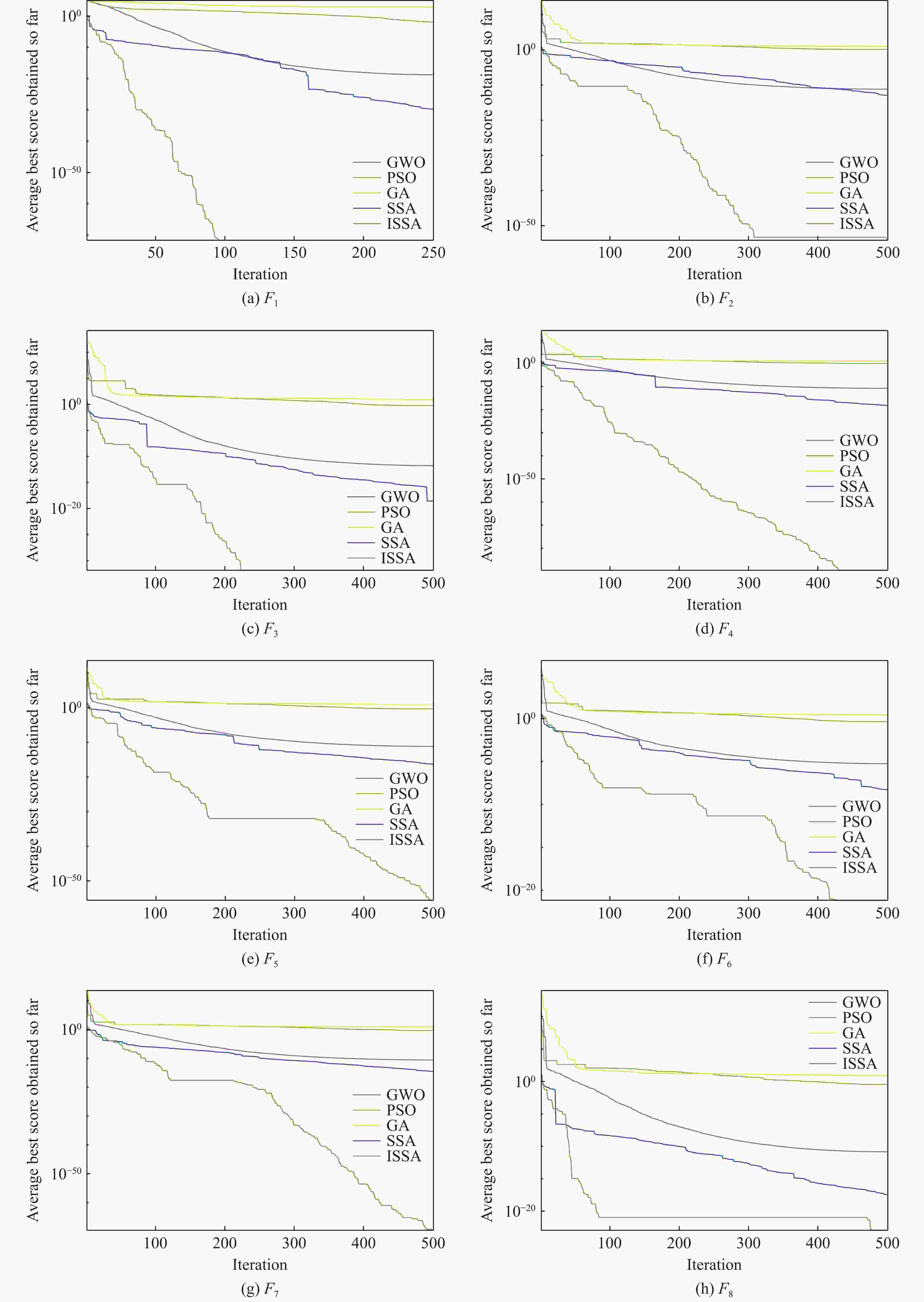 Function Type Value range Optimal solution F1 Sphere [–100, 100] 0 F2 Schwefel′2.22 [–10, 10] 0 F3 Schwefel′1.2 [–100, 100] 0 F4 Quartic [–1.28, 1.28] 0 F5 Rastrigrin [–5.12, 5.12] 0 F6 Ackley [–32, 32] 0 F7 Griewing [–600, 600] 0 F8 Foxholes [–65, 65] 1 表 8 ISSA与经典算法实验结果的对比