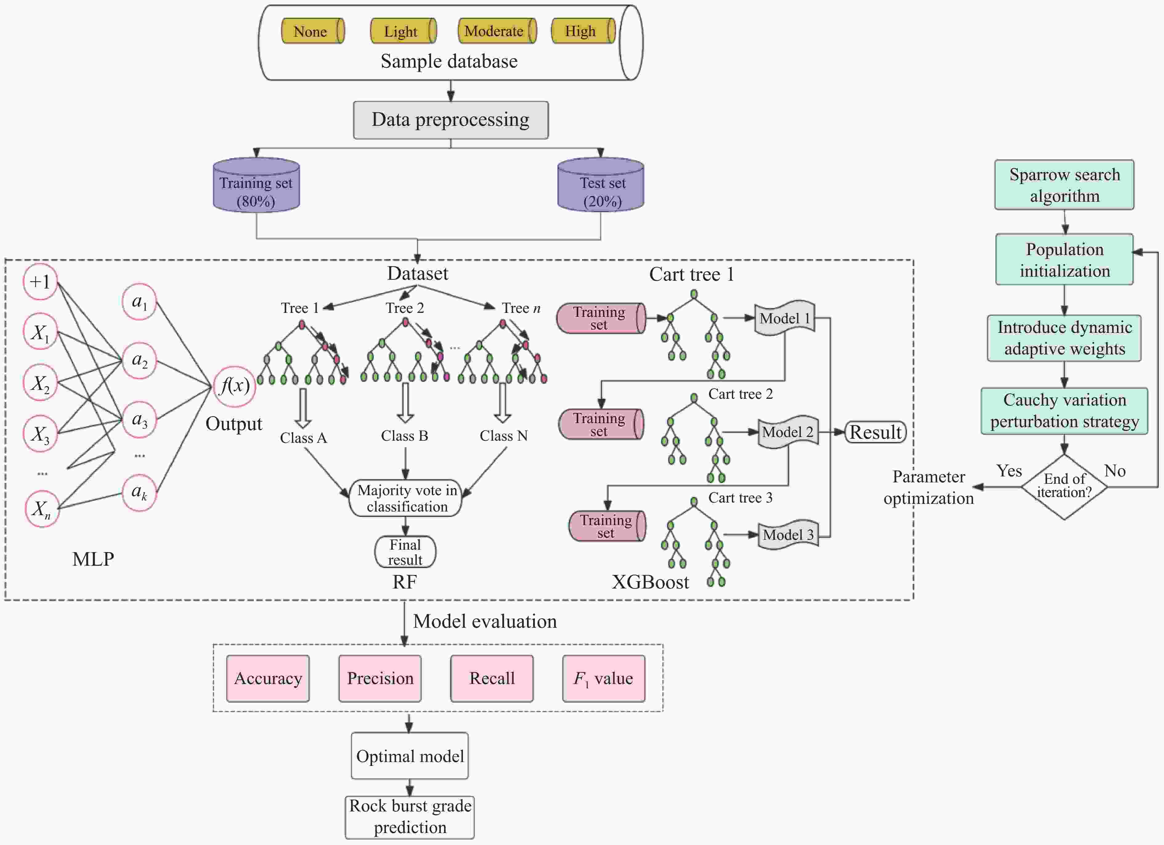 [1] 田睿. 基于机器学习的岩爆烈度等级预测模型研究与应用 [D]. 包头: 内蒙古科技大学, 2020.TIAN R. Research and application of rockburst intensity classification prediction model based on machine learning algorithms [D]. Baotou: Inner Mongolia University of Science and Technology, 2020. [2] 刘剑, 周宗红, 刘军, 等. 基于主成分分析和改进Bayes判别的岩爆等级预测 [J]. 采矿与岩层控制工程学报, 2022, 4(5): 053014. doi: 10.13532/j.jmsce.cn10-1638/td.2022.05.004LIU J, ZHOU Z H, LIU J, et al. Prediction of rockburst grade based on principal component analysis and improved Bayesian discriminant analysis [J]. Journal of Mining and Strata Control Engineering, 2022, 4(5): 053014. doi: 10.13532/j.jmsce.cn10-1638/td.2022.05.004 [3] 孙飞跃, 刘希亮, 郭佳奇, 等. 岩爆预测评估方法的动力数值分析 [J]. 应用力学学报, 2022, 39(1): 26–34. doi: 10.11776/j.issn.1000-4939.2022.01.004SUN F Y, LIU X L, GUO J Q, et al. Dynamic numerical calculation analysis of rockburst prediction assessment methods [J]. Chinese Journal of Applied Mechanics, 2022, 39(1): 26–34. doi: 10.11776/j.issn.1000-4939.2022.01.004 [4] 曲宏略, 刘哲言, 杨龙, 等. 基于应力判据的隧道岩爆预测评估研究 [J]. 地下空间与工程学报, 2020, 16(Suppl 2): 934–938,956.QU H L, LIU Z Y, YANG L, et al. Prediction and evaluation of rock burst in tunnel based on stress criterion [J]. Chinese Journal of Underground Space and Engineering, 2020, 16(Suppl 2): 934–938,956. [5] DOU L M, CAI W, CAO A Y, et al. Comprehensive early warning of rock burst utilizing microseismic multi-parameter indices [J]. International Journal of Mining Science and Technology, 2018, 28(5): 767–774. doi: 10.1016/j.ijmst.2018.08.007 [6] CAO A Y, JING G C, DING Y L, et al. Mining-induced static and dynamic loading rate effect on rock damage and acoustic emission characteristic under uniaxial compression [J]. Safety Science, 2019, 116: 86–96. doi: 10.1016/j.ssci.2019.03.003 [7] 温廷新, 陈依琳. 基于海林格距离和AHDPSO-ELM的岩爆烈度等级预测模型 [J]. 中国安全科学学报, 2022, 32(11): 38–46. doi: 10.16265/j.cnki.issn1003-3033.2022.11.1915WEN T X, CHEN Y L. Prediction model of rockburst intensity grade based on Hellinger distance and AHDPSO-ELM [J]. China Safety Science Journal, 2022, 32(11): 38–46. doi: 10.16265/j.cnki.issn1003-3033.2022.11.1915 [8] 李明亮, 李克钢, 秦庆词, 等. 岩爆烈度等级预测的机器学习算法模型探讨及选择 [J]. 岩石力学与工程学报, 2021, 40(Suppl 1): 2806−2816.LI M L, LI K G, QIN Q C, et al. Discussion and selection of machine learning algorithm model for rockburst intensity grade prediction [J]. Chinese Journal of Rock Mechanics and Engineering, 201, 40(Suppl 1): 2806−2816. [9] 侯克鹏, 包广拓, 孙华芬. 改进的MVO-GRNN神经网络岩爆预测模型研究 [J]. 安全与环境学报, 2024, 24(3): 923–932. doi: 10.13637/j.issn.1009-6094.2023.0341HOU K P, BAO G T, SUN H F. Research on improved MVO-GRNN neural network rockburst prediction model [J]. Journal of Safety and Environment, 2024, 24(3): 923–932. doi: 10.13637/j.issn.1009-6094.2023.0341 [10] 满轲, 武立文, 刘晓丽, 等. 基于灰色关联分析和SSA-RF模型的岩爆等级预测 [J]. 金属矿山, 2023(5): 202–212. doi: 10.19614/j.cnki.jsks.202305021MAN K, WU L W, LIU X L, et al. Rockburst grade prediction based on grey correlation analysis and SSA-RF model [J]. Metal Mine, 2023(5): 202–212. doi: 10.19614/j.cnki.jsks.202305021 [11] 高梅, 张成良, 张华超, 等. 基于SMOTEENN-CGAN-Stacking的岩爆烈度等级预测研究 [J]. 工程地质学报, 2024, 32(6): 2264–2276. doi: 10.13544/j.cnki.jeg.2024-0112GAO M, ZHANG C L, ZHANG H C, et al. Rockburst intensity level prediction based on SMOTEENN-CGAN-Stakcing [J]. Journal of Engineering Geology, 2024, 32(6): 2264–2276. doi: 10.13544/j.cnki.jeg.2024-0112 [12] 苏焕博. 数据缺失和不均衡下的IDPSO-ELM岩爆烈度等级预测模型研究 [D]. 阜新: 辽宁工程技术大学, 2022.SU H B. Research on IDPSO-ELM rockburst intensity grade prediction model with missing and unbalanced data [D]. Fuxin: Liaoning Technical University, 2022. [13] ZHOU J, LI X, MITRI H S. Classification of rockburst in underground projects: comparison of ten supervised learning methods [J]. Journal of Computing in Civil Engineering, 2016, 30(5): 04016003. doi: 10.1061/(ASCE)CP.1943-5487.0000553 [14] 武立文. 基于SSA-RF模型的岩爆预测方法及应用研究 [D]. 北京: 北方工业大学, 2024.WU L W. Research on rockburst prediction method and application based on SSA-RF model [D]. Beijing: North China University of Technology, 2024. [15] 刘晓悦, 杨伟, 张雪梅. 基于改进层次法与CRITIC法的多维云模型岩爆预测 [J]. 湖南大学学报(自然科学版), 2021, 48(2): 118–124. doi: 10.16339/j.cnki.hdxbzkb.2021.02.015LIU X Y, YANG W, ZHANG X M. Rockburst prediction of multi-dimensional cloud model based on improved hierarchical analytic method and critic method [J]. Journal of Hunan University (Natural Sciences), 2021, 48(2): 118–124. doi: 10.16339/j.cnki.hdxbzkb.2021.02.015 [16] 谭文侃, 叶义成, 胡南燕, 等. LOF与改进SMOTE算法组合的强烈岩爆预测 [J]. 岩石力学与工程学报, 2021, 40(6): 1186–1194. doi: 10.13722/j.cnki.jrme.2020.1035TAN W K, YE Y C, HU N Y, et al. Severe rock burst prediction based on the combination of LOF and improved SMOTE algorithm [J]. Chinese Journal of Rock Mechanics and Engineering, 2021, 40(6): 1186–1194. doi: 10.13722/j.cnki.jrme.2020.1035 [17] 王宇航, 周宗红, 李国才, 等. 基于数据预处理的岩爆等级预测模型及精度优化 [J]. 矿业研究与开发, 2024, 44(11): 101–109. doi: 10.13827/j.cnki.kyyk.2024.11.009WANG Y H, ZHOU Z H, LI G C, et al. Prediction model and accuracy optimization of rockburst grade based on data preprocessing [J]. Mining Research