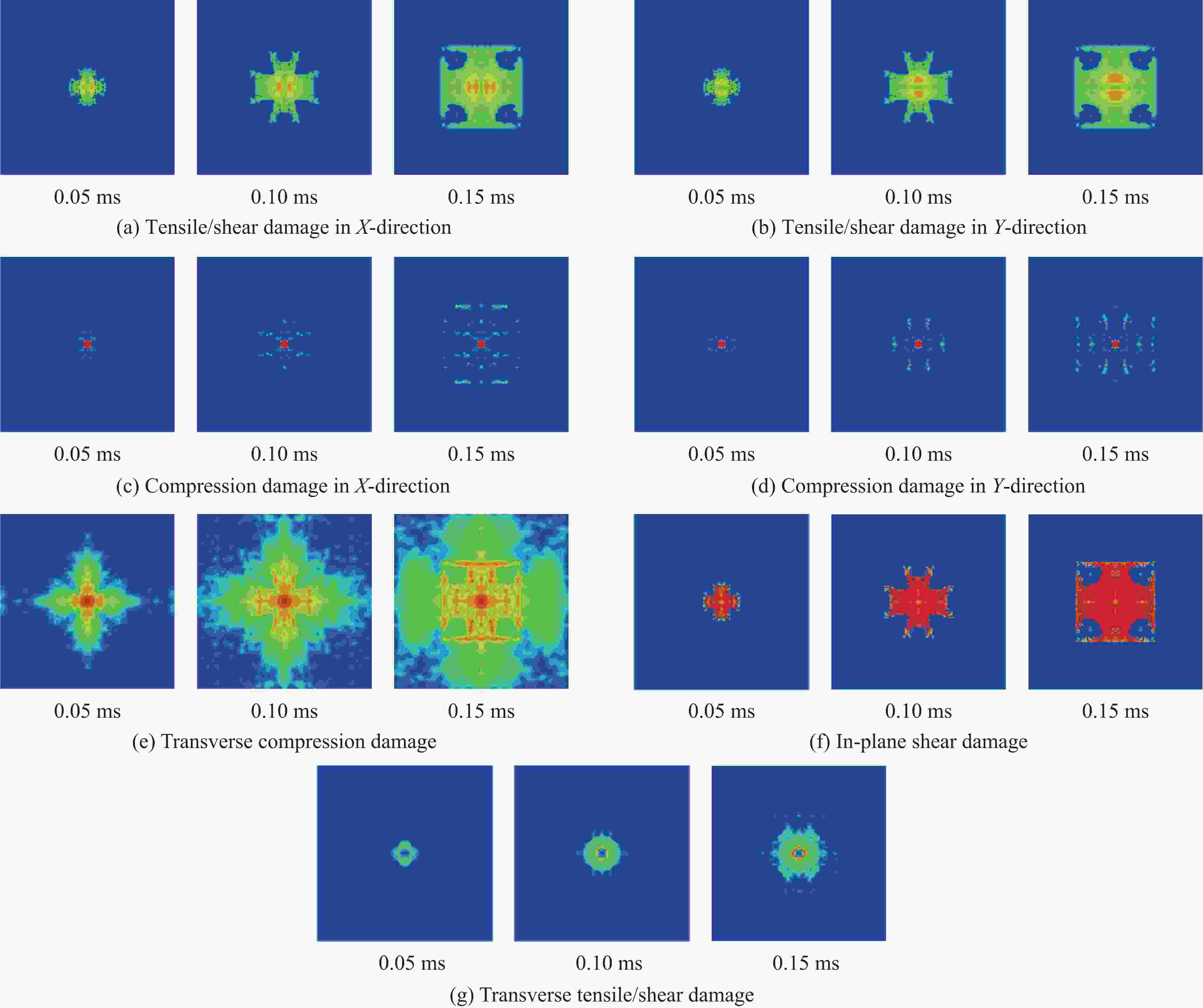 Damage mode ${\delta _{j,{\rm{eq}}}}$ ${\sigma _{j,{\rm{eq}}}}$ Tensile/shear damage in X-direction ${L_{\rm{c}}}\sqrt {{{\left\langle {{\varepsilon _{11}}} \right\rangle }^2}+{{{{\gamma _{12}^2}} }}+{{ {{\gamma _{31}^2}} }}} $ ${L_{\rm{c}}}\left( {{E_{11}}{{\left\langle {{\varepsilon _{11}}} \right\rangle }^2}+{G_{12}}{{{{\gamma _{12}^2}} }}+{G_{31}}{{{{\gamma _{31}^2}} }}} \right)/{\delta _{\rm{1,eq}}}$ Tensile/shear damage in Y-direction ${L_{\rm{c}}}\sqrt {{{\left\langle {{\varepsilon _{22}}} \right\rangle }^2}+{{ {{\gamma _{12}^2}} }}+{{ {{\gamma _{23}^2}} }}} $ ${L_{\rm{c}}}\left( {{E_{22}}{{\left\langle {{\varepsilon _{22}}} \right\rangle }^2}+{G_{12}}{{ {{\gamma _{12}^2}} }}+{G_{23}}{{{{\gamma _{23}^2}}}}} \right)/{\delta _{\rm{2,eq}}}$ Compression damage in X-direction ${L_{\rm{c}}}\sqrt {{{\left\langle {{{\varepsilon }_{11}'}} \right\rangle }^2}} $ ${L_{\rm{c}}}\left( {{E_{11}}{{\left\langle {{{\varepsilon}_{11} '}} \right\rangle }^2}} \right)/{\delta _{\rm{3,eq}}}$ Compression damage in Y-direction ${L_{\rm{c}}}\sqrt {{{\left\langle {{{\varepsilon }_{22}'}} \right\rangle }^2}} $ ${L_{\rm{c}}}\left( {{E_{22}}{{\left\langle {{{\varepsilon }_{22}'}} \right\rangle }^2}} \right)/{\delta _{\rm{4,eq}}}$ Transverse compression damage ${L_{\rm{c}}}\sqrt {{{\left\langle {{{\varepsilon }_{33}'}} \right\rangle }^2}} $ ${L_{\rm{c}}}\left( {{E_{33}}{{\left\langle {{{\varepsilon }_{33}'}} \right\rangle }^2}} \right)/{\delta _{\rm{5,eq}}}$ In-plane shear damage ${L_{\rm{c}}}\sqrt {{{{{\gamma _{12}^2}} }}} $ ${L_{\rm{c}}}\left( {{G_{12}}{{ {{\gamma _{12}^2}} }}} \right)/{\delta _{\rm{6,eq}}}$ Transverse tensile/shear damage ${L_{\rm{c}}}\sqrt {{{\left\langle {{\varepsilon _{33}}} \right\rangle }^2}+{{{{\gamma _{23}^2}} }}+{{{{\gamma _{31}^2}} }}} $ ${L_{\rm{c}}}\left( {{E_{33}}{{\left\langle {{\varepsilon _{33}}} \right\rangle }^2}+{G_{23}}{{ {{\gamma _{23}^2}} }}+{G_{31}}{{ {{\gamma _{31}^2}} }}} \right)/{\delta _{\rm{7,eq}}}$ 表 2 数值模拟中STF浸渍Kevlar织物的材料参数[23, 28–34]