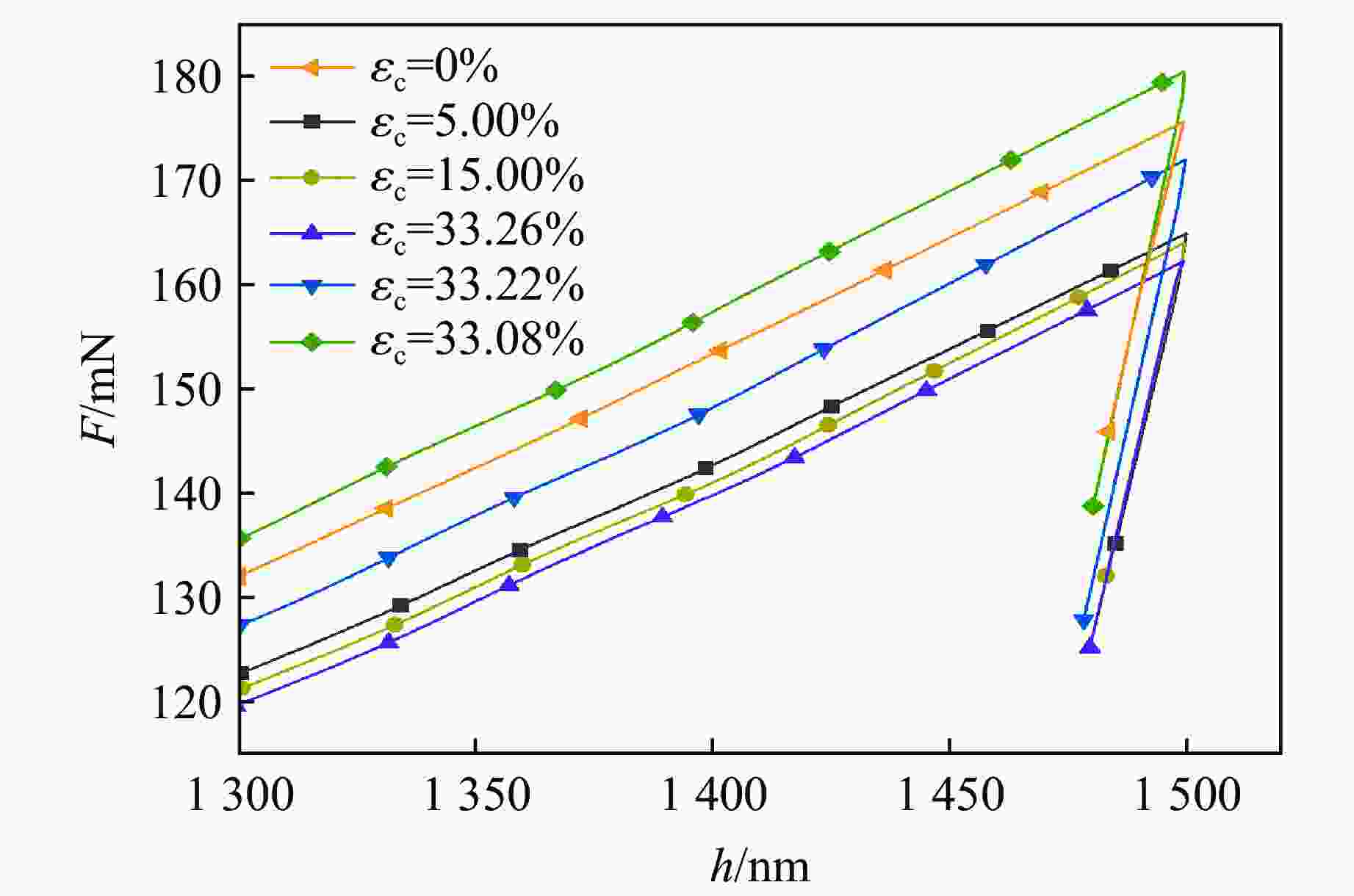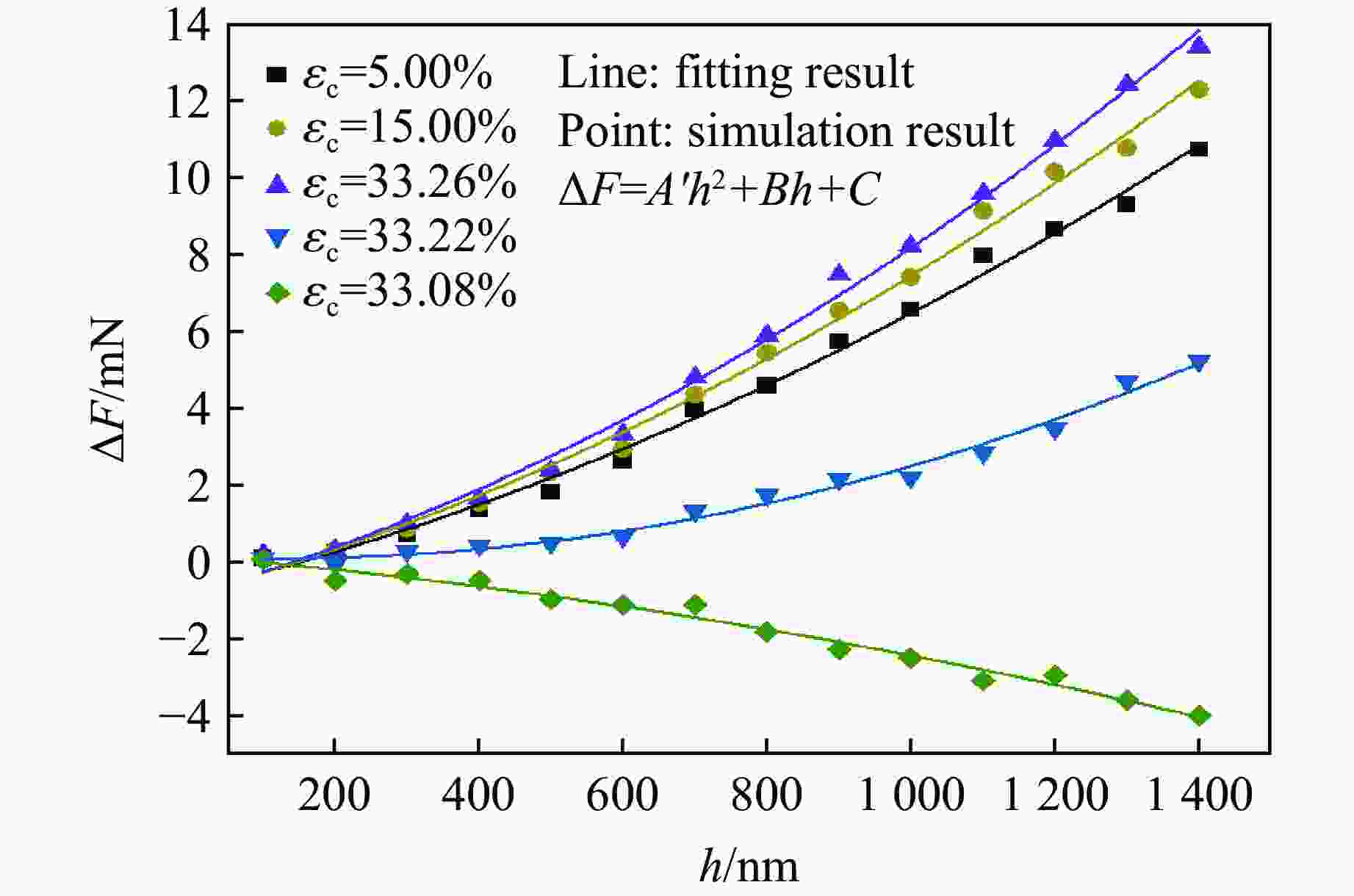 εc/% A'/(mN·nm−2) B/(mN·nm−1) C/mN R2 ${\bar \sigma _{\max }}$/MPa 5.00 2.656×10−6 0.0046 − 0.7647 0.9946 318.4 15.00 3.159×10−6 0.0051 − 0.8223 0.9954 333.2 33.26 3.654×10−6 0.0054 − 0.8409 0.9961 345.6 33.22 3.103×10−6 − 0.0008 0.1249 0.9874 212.5 33.08 −1.003×10−6 − 0.0016 0.1498 0.9813 18.6 -