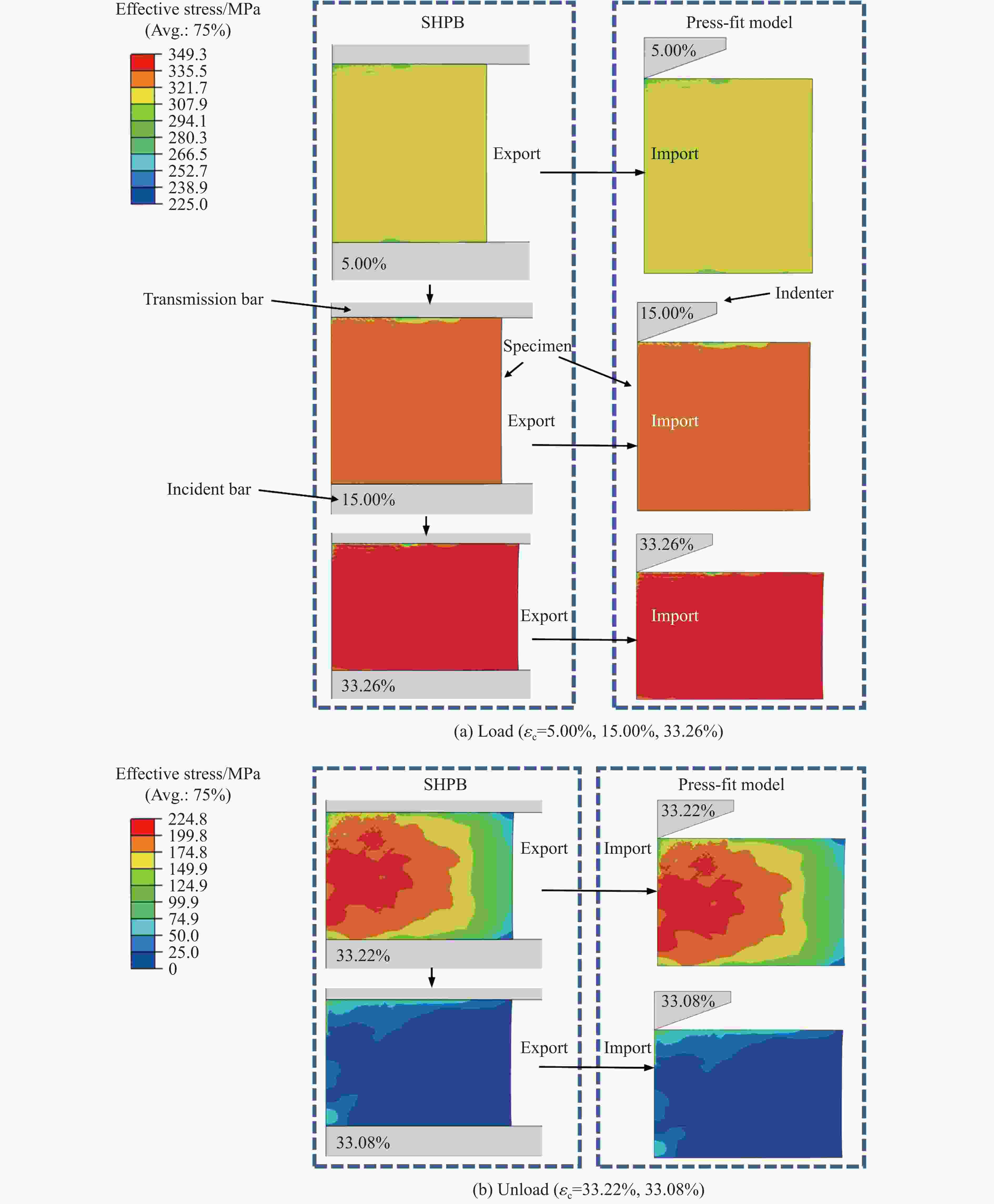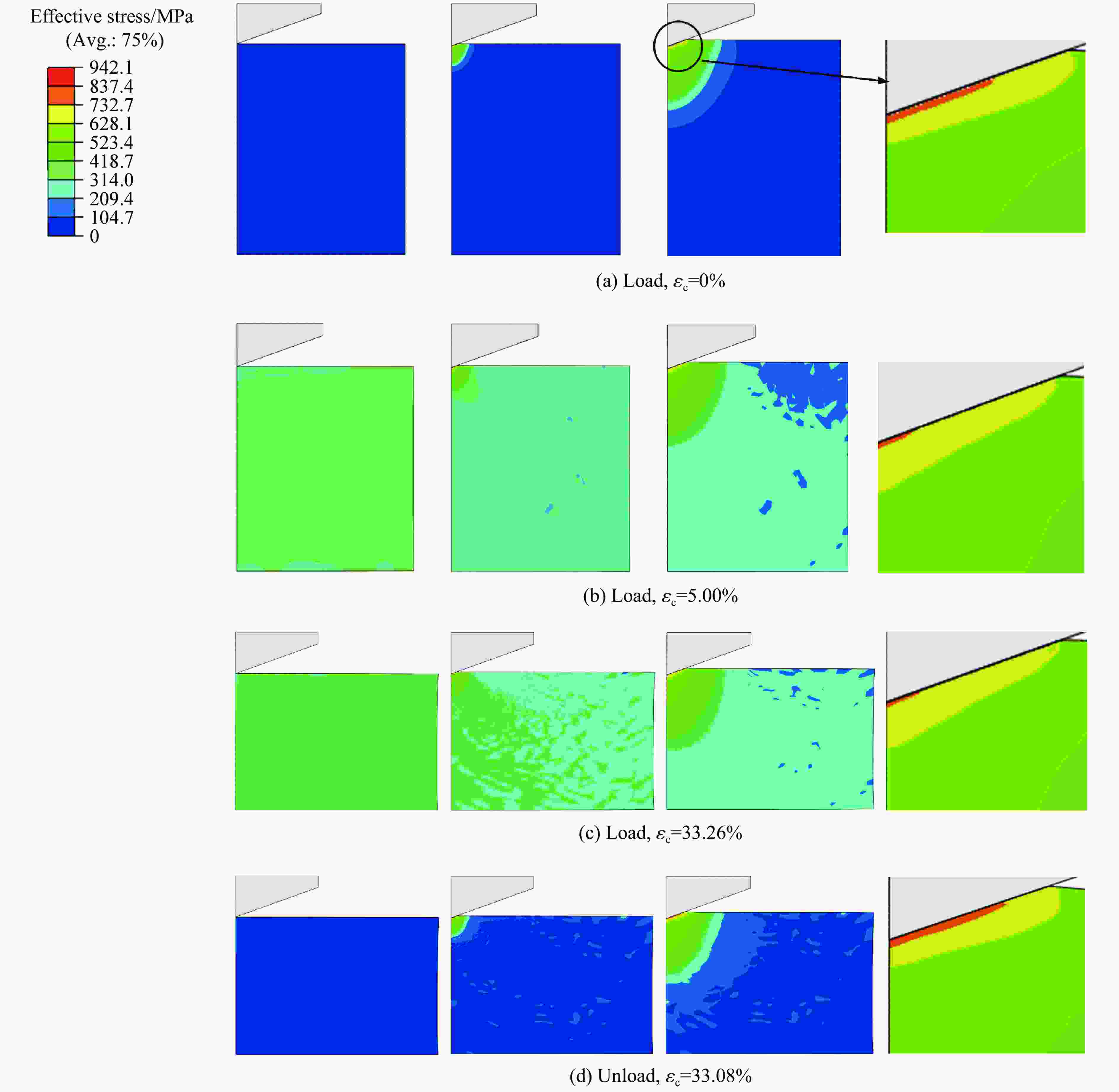 摘要: 为解决材料或结构在服役环境中的内部应力难以评估的问题,提出了一种有限元与微压入测试相结合的方法。以CoCrFeNiMn高熵合金为例,分别在不同加载速度下开展了压缩、剪切和微压入测试,并基于非对称初始屈服函数、Swift硬化与关联流动法则,构建了该材料的弹塑性本构模型。利用应力积分算法将该本构模型程序化,并接入ABAQUS有限元软件中,通过对比分离式霍普金森压杆与压入模型的有限元模拟结果和实验结果,验证了模型的可靠性。基于分离式霍普金森压杆模型,进行了动态压缩实验的数值模拟,并将不同动态变形时刻的应力场作为初始应力场(内部应力)导入压入模型中,进行压入模拟分析。结果表明:加载阶段的初始应力场会显著降低相同压入深度下的压入载荷,且降低幅度随着初始应力的增加而增大;此外,初始应力场的存在会进一步减弱压入过程中的应力集中。通过对不同压缩量下的载荷-压入位移曲线进行定量分析,揭示了不同初始应力条件下材料的压入响应规律。研究结果为服役条件下材料或结构内部应力的评估提供了参考。Abstract: To address the challenge of evaluating the internal stress of materials or structures in service environments, a method combining finite element analysis and micro-indentation testing is proposed. Taking the CoCrFeNiMn high-entropy alloy as the research object, compression, shear and micro-indentation tests were carried out at various loading speeds respectively. Based on an asymmetric initial yield function, Swift hardening and the associated flow rule, an elastoplastic constitutive model for this material was established. The constitutive model was programmed by using the stress integration algorithm and interfaced with the ABAQUS finite element software. Furthermore, by comparing the finite element simulation results with the experimental results from the split Hopkinson pressure bar (SHPB) tests and the indentation model, the reliability of the model was verified. Using the SHPB model, the numerical simulation of the dynamic compression experiment was carried out, and the stress fields at different dynamic deformation moments were imported into the indentation model as the initial stress (internal stress) fields for indentation simulation analysis. The results indicated that the initial stress field in the loading stage significantly reduces the indentation load at the same indentation depth, and the reduction amplitude increases with the increase of stress. In addition, the existence of the initial stress field will further weaken the stress concentration during the indentation process. Through the quantitative analysis of the load-indentation displacement curves under different compression amounts, the indentation response laws of the materials under different initial stress conditions were revealed. The research results provide a reference for the evaluation of the internal stress of materials or structures under service conditions.