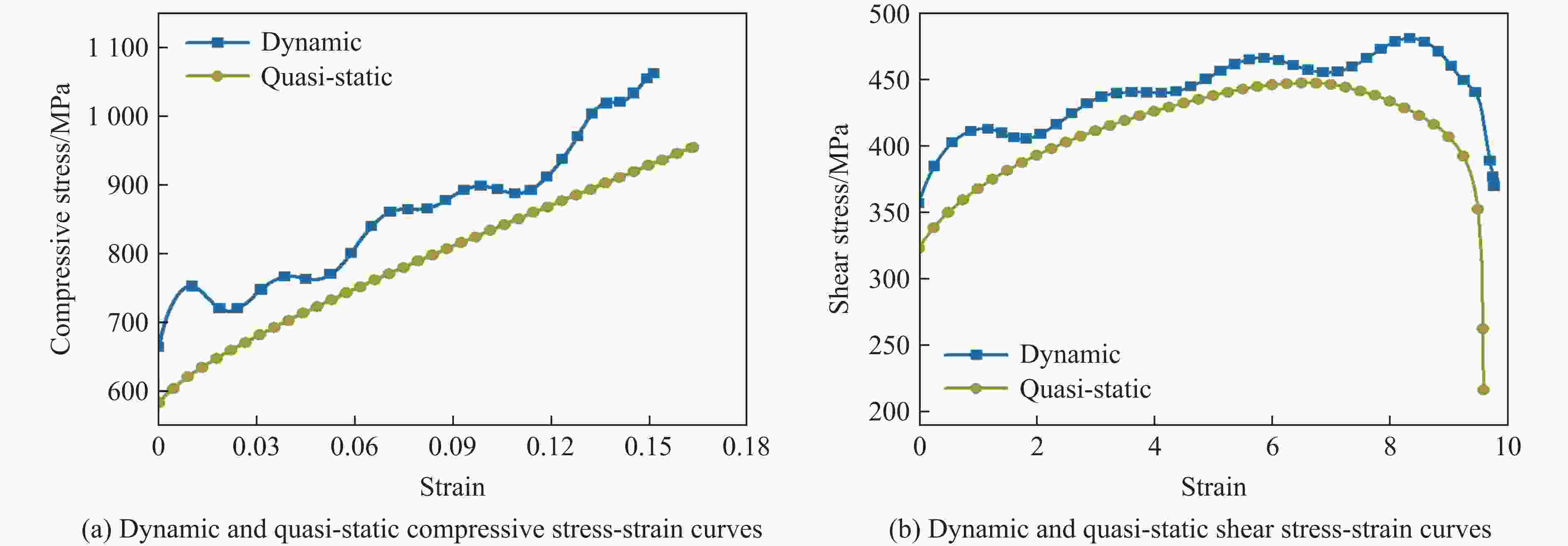 Type c A/MPa ${\varepsilon _{\text{s}}}$ n Quasi-static −0.14 304.67 1.46300 0.18394 Dynamic −0.27 413.16 0.09025 0.06015 表 2 入射杆、透射杆和试件的材料及几何参数