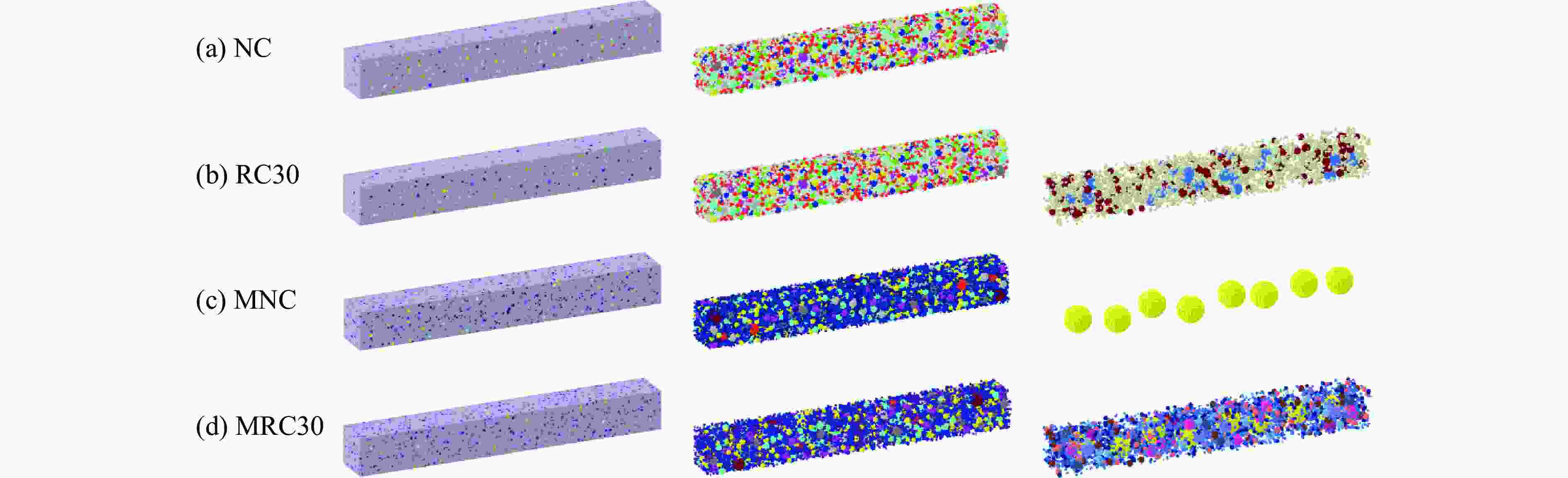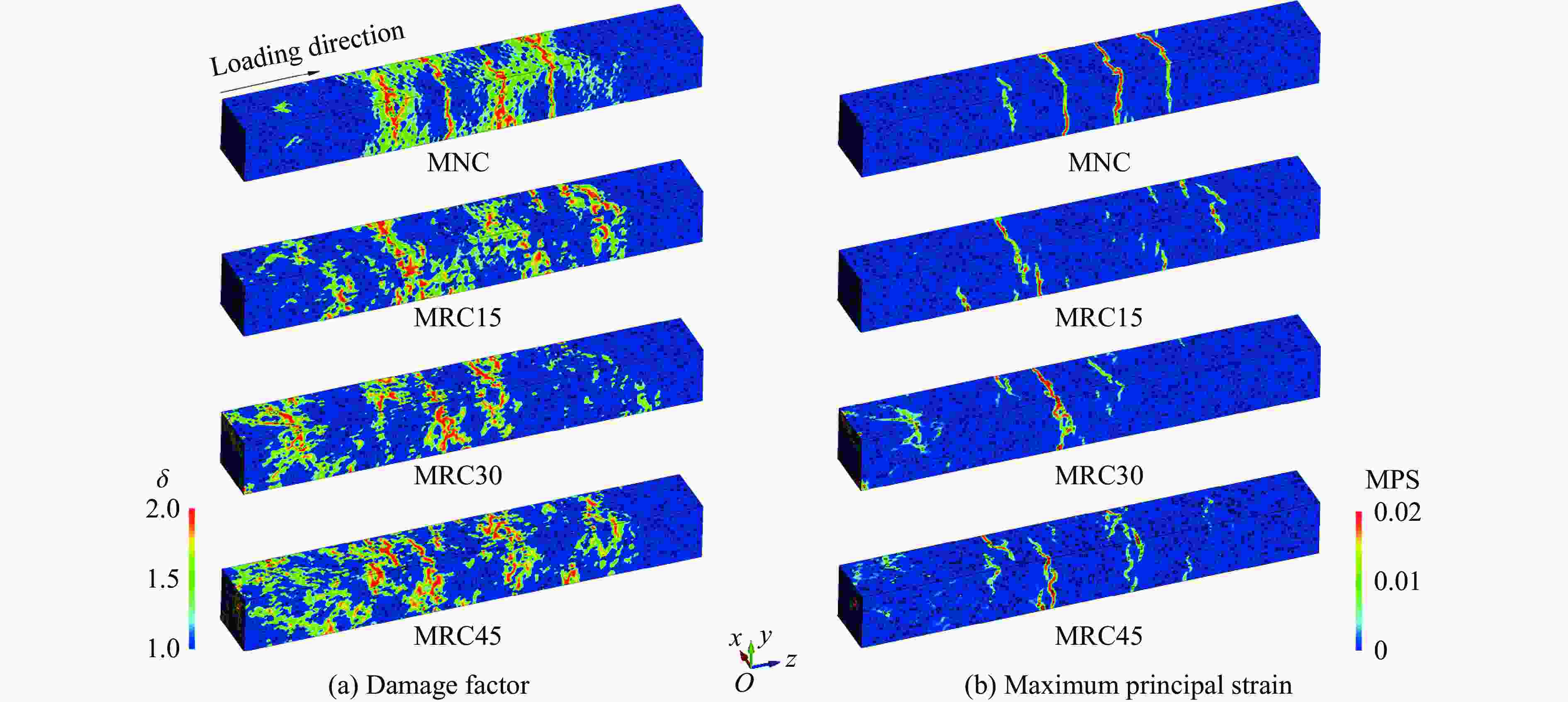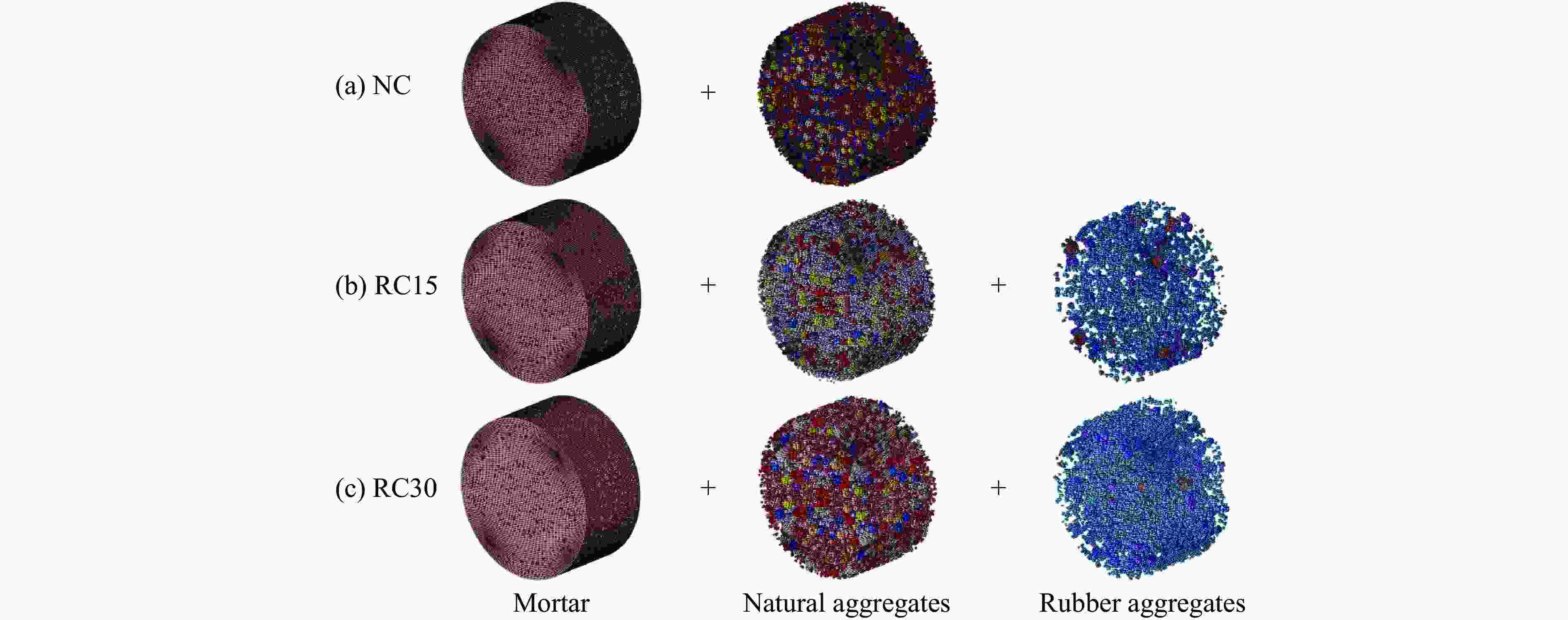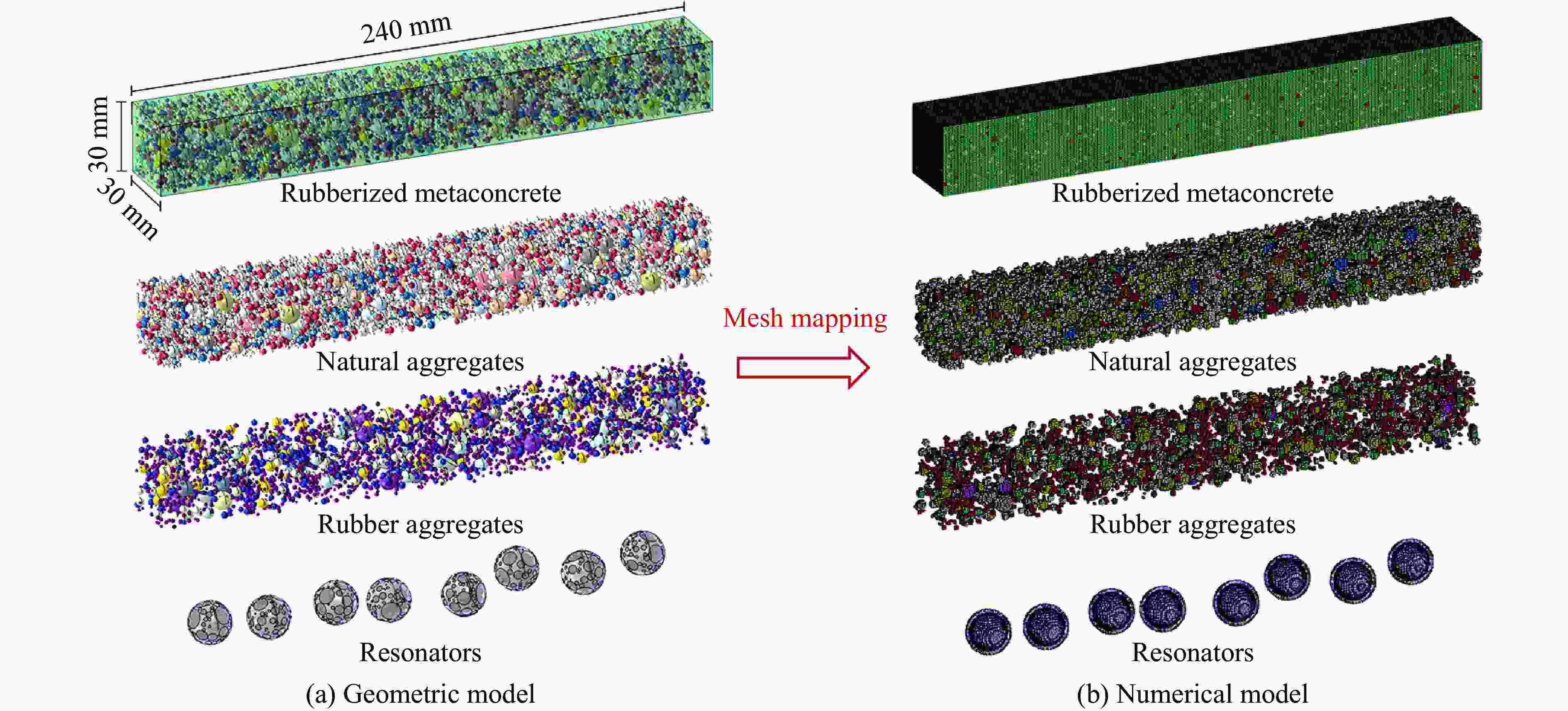 摘要: 为提升现有类混凝土材料的动态性能,在超材料混凝土基质中加入橡胶骨料形成新型抗冲击材料,并对其细观力学模型在冲击荷载作用下的动态响应进行数值模拟。对试件内各组分含量、级配、分布情况及适用材料模型进行系统标定和验证,分析了橡胶超材料混凝土在冲击荷载下的衰波能力及各组分相互作用规律,探讨了橡胶骨料在高幅值荷载下对橡胶超材料混凝土破坏模式、损伤区域及损伤程度的影响,并对橡胶含量及粒径进行了参数分析。数值模拟结果表明:橡胶骨料的加入不仅使混凝土的损伤区域呈现“分散”特征,还能够有效降低试件的损伤程度;橡胶骨料可提升试件韧性,抑制损伤程度的加剧;高橡胶含量对试件强度造成负面影响,形成损伤抑制与损伤加剧之间的矛盾,为确保两者平衡,建议橡胶骨料体积占骨料总体积的15%~30%。以上结果说明,在超材料混凝土中加入橡胶骨料能够有效提升试件的动态性能,为未来抗冲击材料的设计和工程应用提供参考。Abstract: To enhance the dynamic performance of existing concrete-like materials, rubber aggregates were incorporated into a metaconcrete matrix to create a novel impact-resistant material, and the dynamic response of its mesoscopic mechanical model under impact load was simulated. Initially, the content, gradation, distribution, and appropriate material models of the specimen components were systematically calibrated and validated. Subsequently, the wave-damping capacity and the interaction patterns of the components in rubber-based metaconcrete under impact load were analyzed. In particular, the effect of rubber aggregates on the failure modes, damage zones, and extent of damage in metaconcrete under high-amplitude loads was thoroughly examined, and a parameter analysis of the rubber content and particle size was conducted. The numerical results showed that the addition of the rubber aggregates not only makes the damaged area of the concrete show dispersed characteristics, but also effectively reduces the degree of specimen damage. Rubber aggregates enhance the specimen’s toughness and suppress the intensification of damage. However, high rubber content has a detrimental effect on the specimen’s strength, and leads to a trade-off between damage suppression and damage exacerbation. To balance these two effects, it is recommended that rubber aggregates make up 15% to 30% of the total volume of aggregates. These findings demonstrate that incorporating rubber aggregates into metaconcrete can significantly improve its dynamic performance, providing a reference for the design and engineering application of impact-resistant materials in the future.