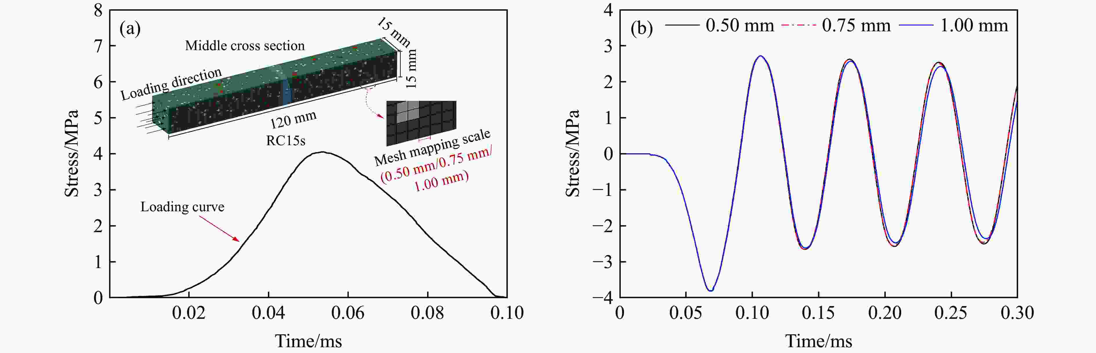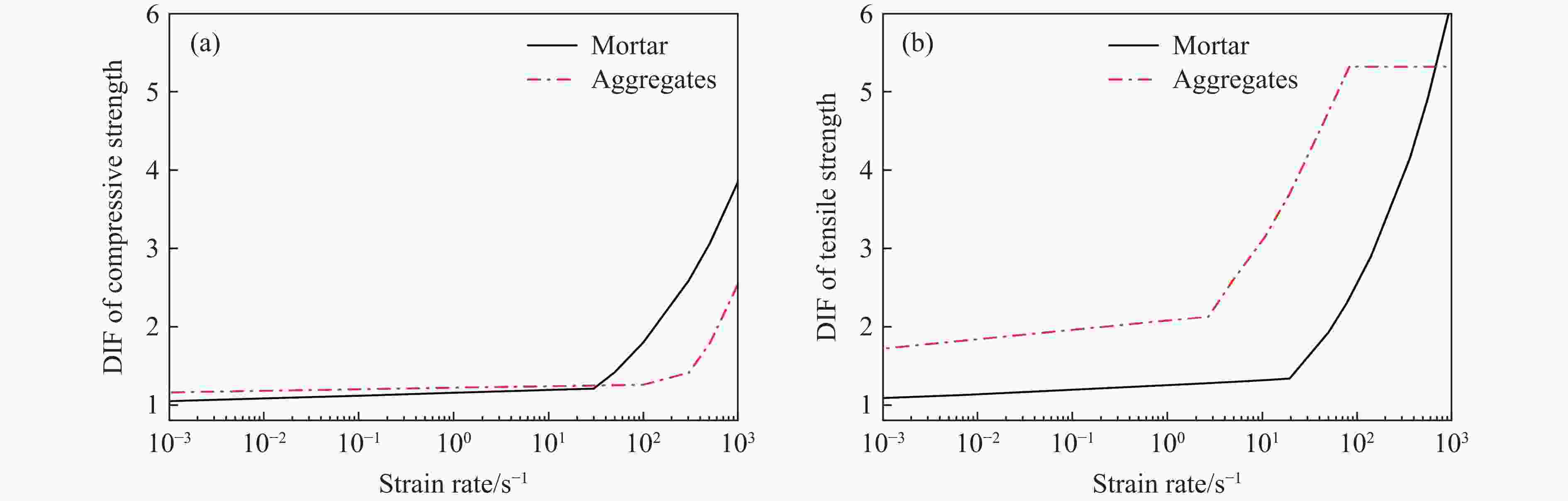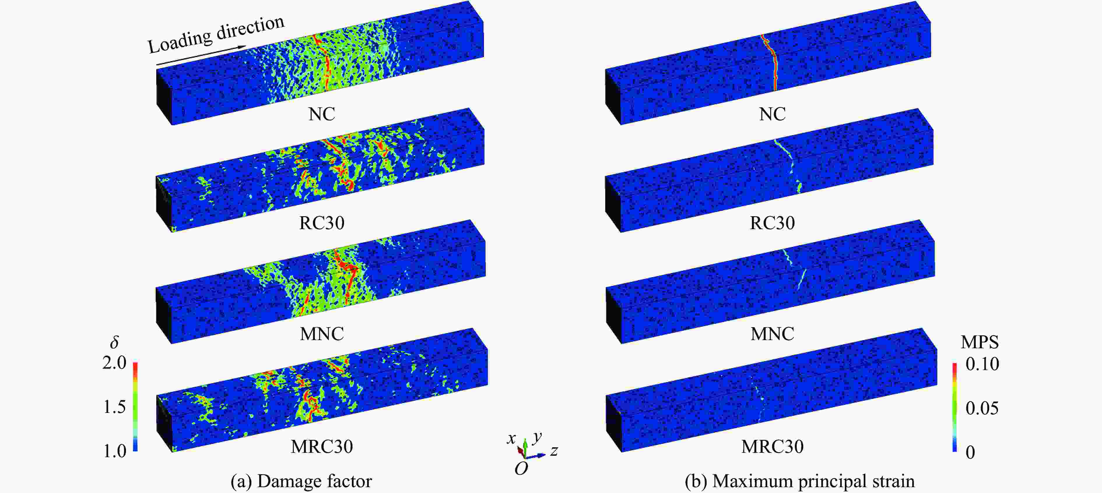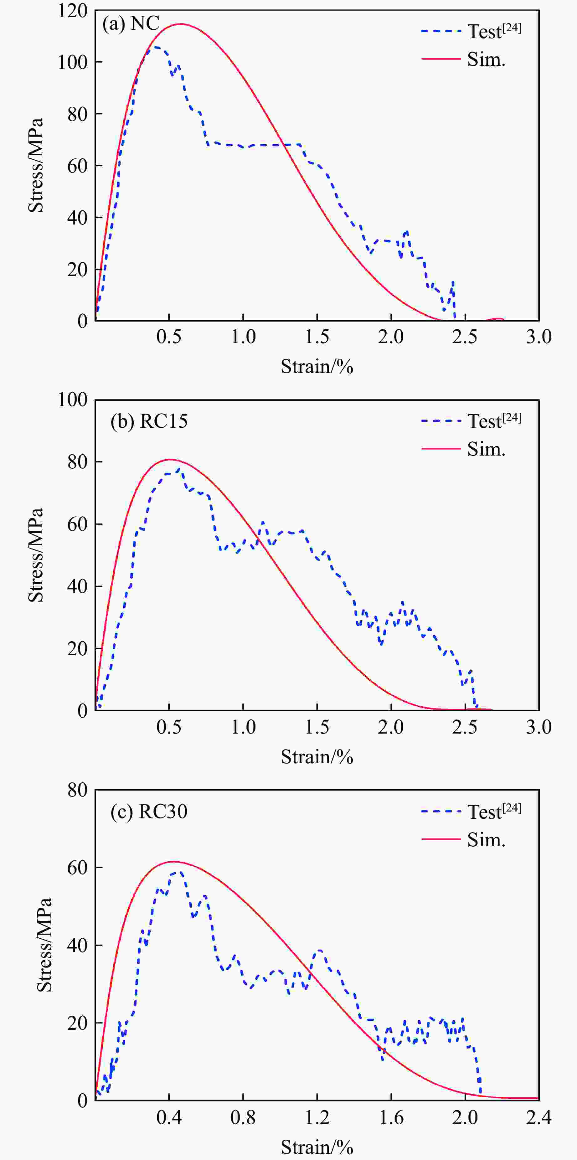 摘要: 为提升现有类混凝土材料的动态性能,在超材料混凝土基质中加入橡胶骨料形成新型抗冲击材料,并对其细观力学模型在冲击荷载作用下的动态响应进行数值模拟。对试件内各组分含量、级配、分布情况及适用材料模型进行系统标定和验证,分析了橡胶超材料混凝土在冲击荷载下的衰波能力及各组分相互作用规律,探讨了橡胶骨料在高幅值荷载下对橡胶超材料混凝土破坏模式、损伤区域及损伤程度的影响,并对橡胶含量及粒径进行了参数分析。数值模拟结果表明:橡胶骨料的加入不仅使混凝土的损伤区域呈现“分散”特征,还能够有效降低试件的损伤程度;橡胶骨料可提升试件韧性,抑制损伤程度的加剧;高橡胶含量对试件强度造成负面影响,形成损伤抑制与损伤加剧之间的矛盾,为确保两者平衡,建议橡胶骨料体积占骨料总体积的15%~30%。以上结果说明,在超材料混凝土中加入橡胶骨料能够有效提升试件的动态性能,为未来抗冲击材料的设计和工程应用提供参考。Abstract: To enhance the dynamic performance of existing concrete-like materials, rubber aggregates were incorporated into a metaconcrete matrix to create a novel impact-resistant material, and the dynamic response of its mesoscopic mechanical model under impact load was simulated. Initially, the content, gradation, distribution, and appropriate material models of the specimen components were systematically calibrated and validated. Subsequently, the wave-damping capacity and the interaction patterns of the components in rubber-based metaconcrete under impact load were analyzed. In particular, the effect of rubber aggregates on the failure modes, damage zones, and extent of damage in metaconcrete under high-amplitude loads was thoroughly examined, and a parameter analysis of the rubber content and particle size was conducted. The numerical results showed that the addition of the rubber aggregates not only makes the damaged area of the concrete show dispersed characteristics, but also effectively reduces the degree of specimen damage. Rubber aggregates enhance the specimen’s toughness and suppress the intensification of damage. However, high rubber content has a detrimental effect on the specimen’s strength, and leads to a trade-off between damage suppression and damage exacerbation. To balance these two effects, it is recommended that rubber aggregates make up 15% to 30% of the total volume of aggregates. These findings demonstrate that incorporating rubber aggregates into metaconcrete can significantly improve its dynamic performance, providing a reference for the design and engineering application of impact-resistant materials in the future.