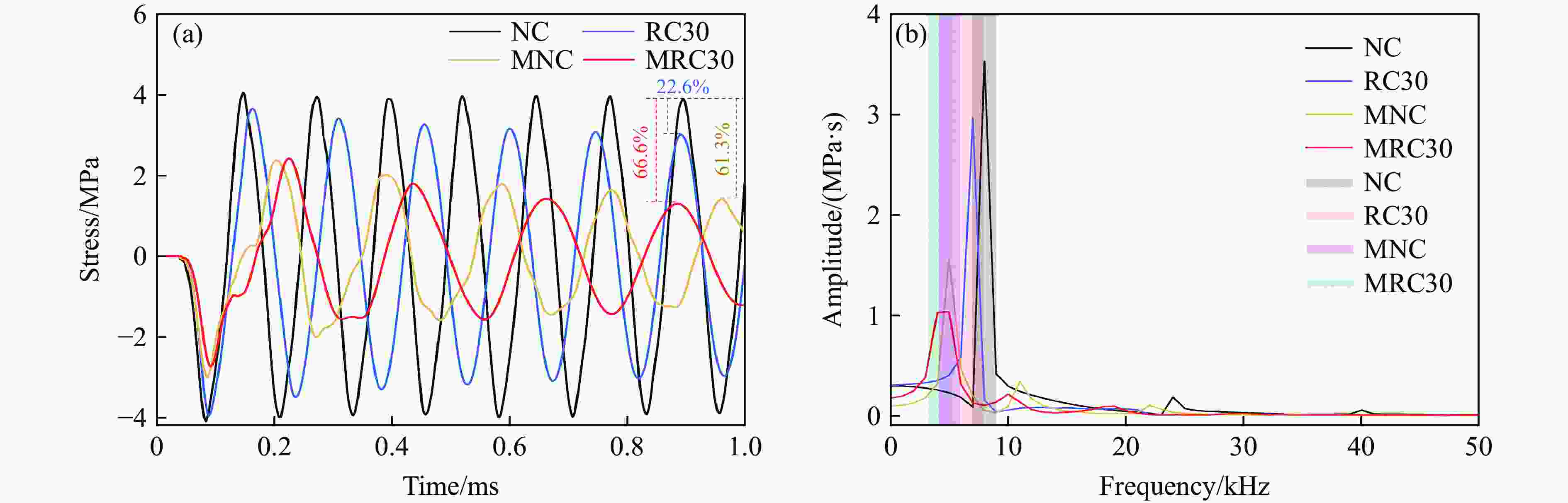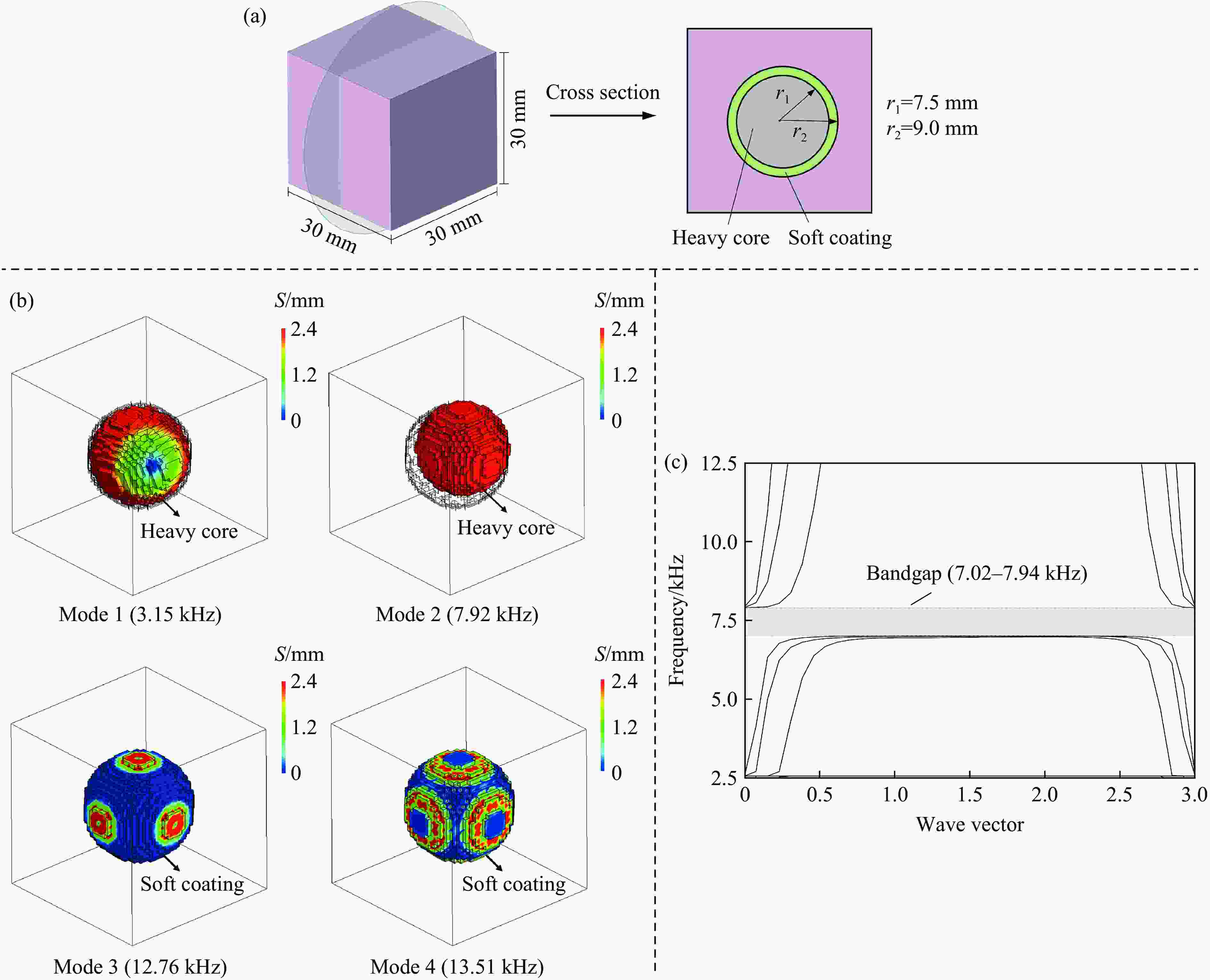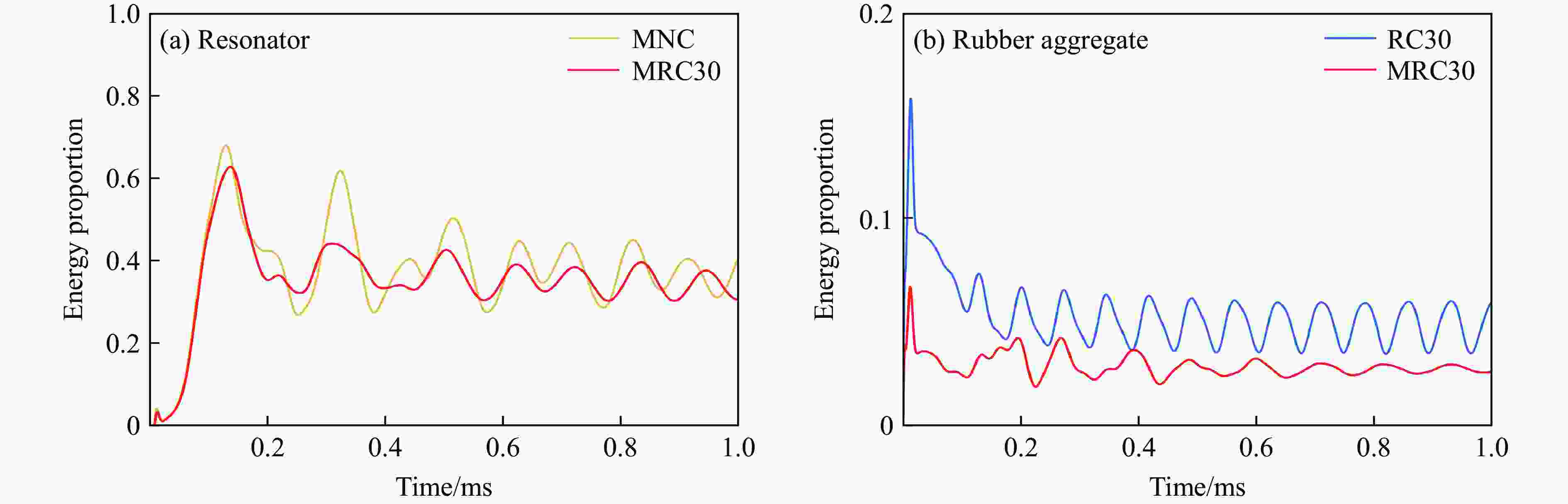 Component Density/(kg·m−3) Poisson’s ratio Strength/MPa C10 C01 Mortar 2100 0.18 35 Natural aggregate 2600 0.14 90 Rubber aggregate 1000 0.492 0.58643 − 0.038942 表 2 谐振器软涂层和内核材料参数