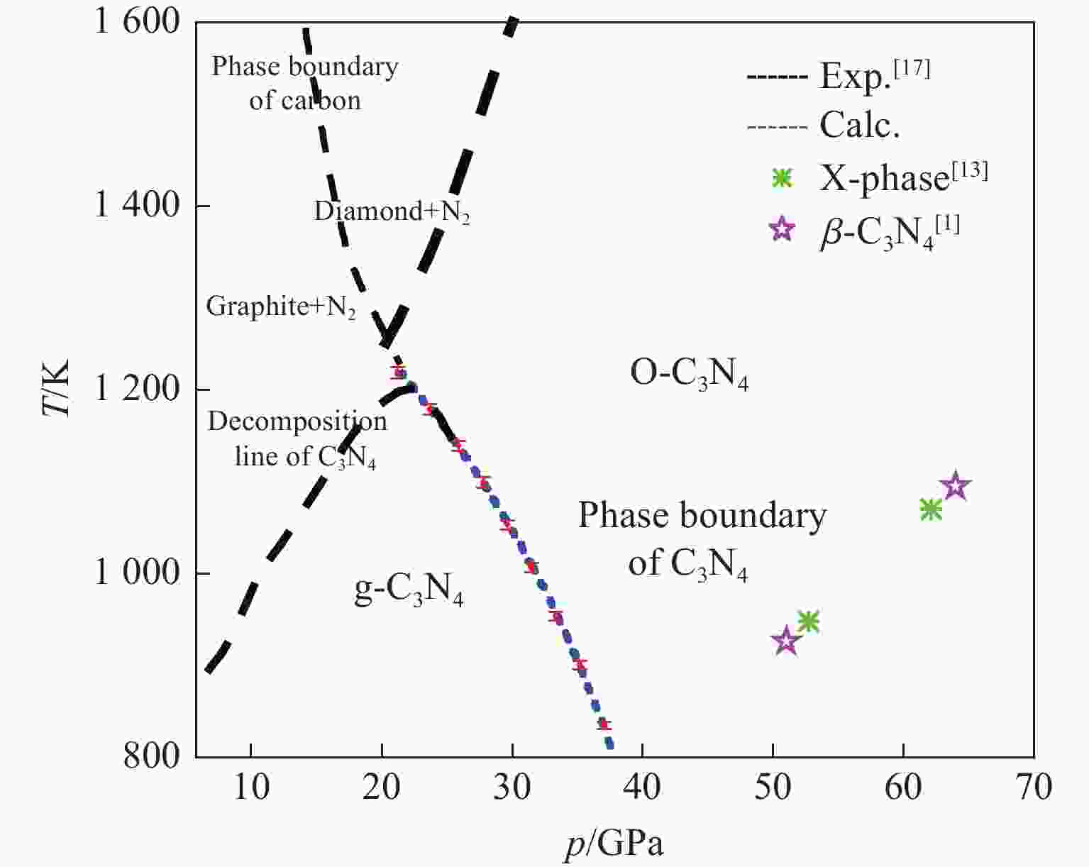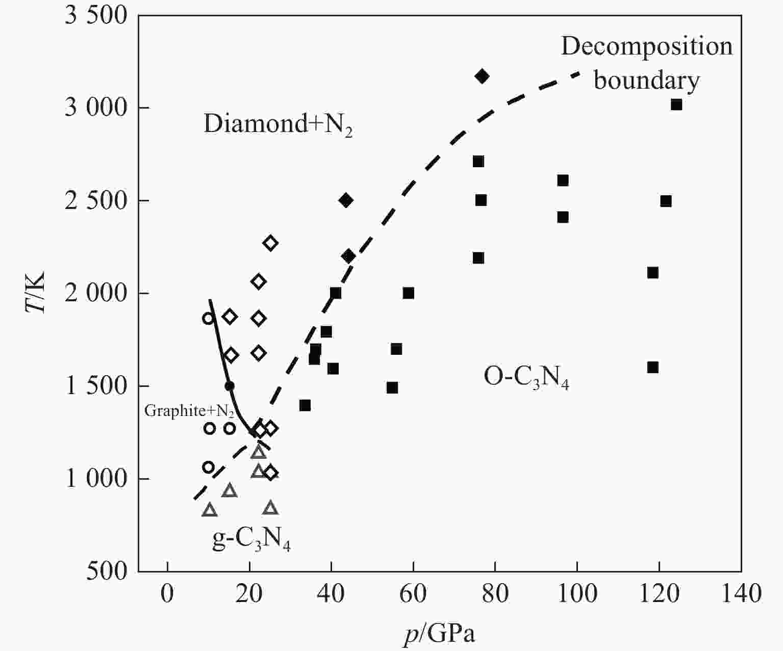 图 1 C3N4的相图[17](圆形、正方形、菱形和三角形分别表示石墨、O-C3N4、金刚石和g-C3N4,实线表示石墨与金刚石的边界,虚线表示C3N4的分解相边界)