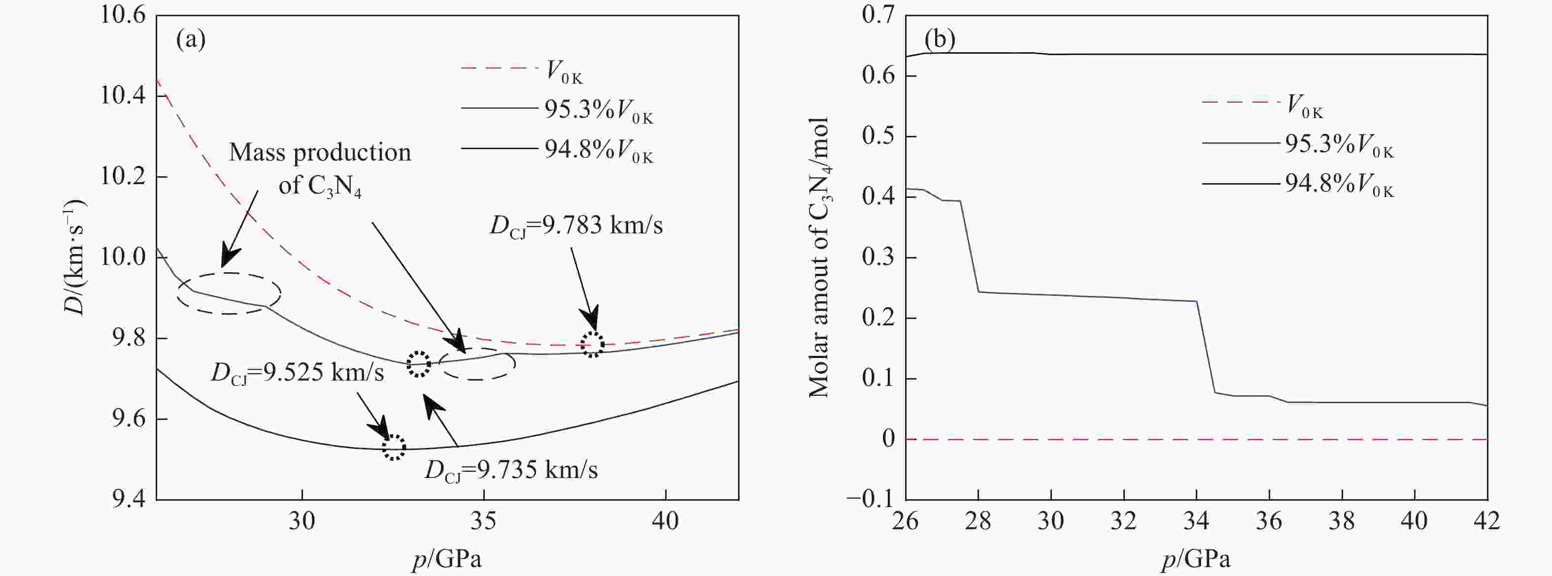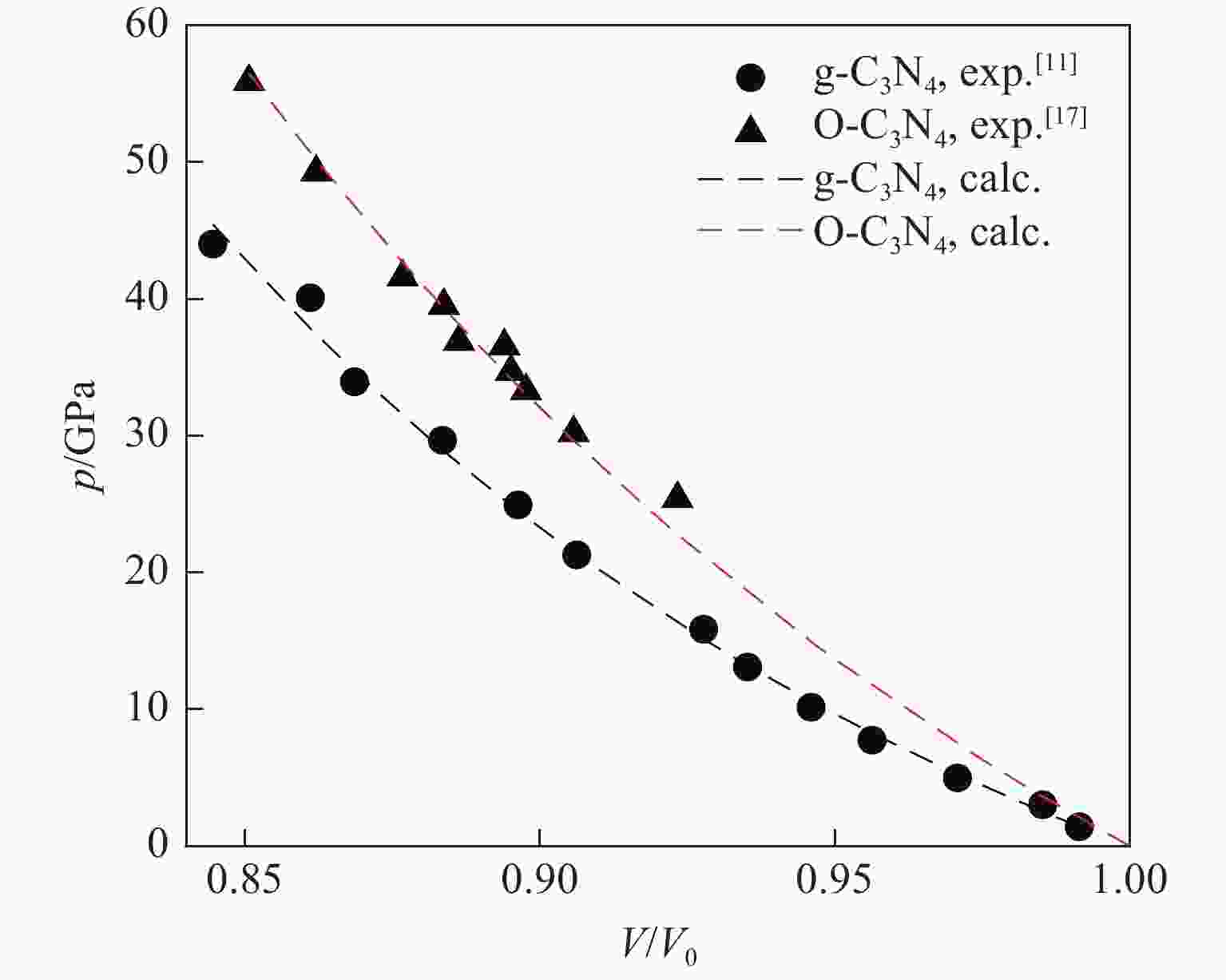 Material B0/GPa B1 $ {V_{{\text{0\,K}}}} $/(cm3·g−1) Eref/(kJ·mol−1) Sref/(kJ·mol−1·K−1) c1/(mm·s−1) c2/(mm·s−1) α/(cm3·g−1·K−1) g-C3N4 163.62 5.40 0.449 89.86 3.40×10−2 1.39 −1.07 4.41×10−6 O-C3N4 244.12 4.08 0.401 111.85 8.76×10−2 1.15 −0.47 4.19×10−6 表 2 实验和计算得到TKX-50炸药的CJ爆轰参数