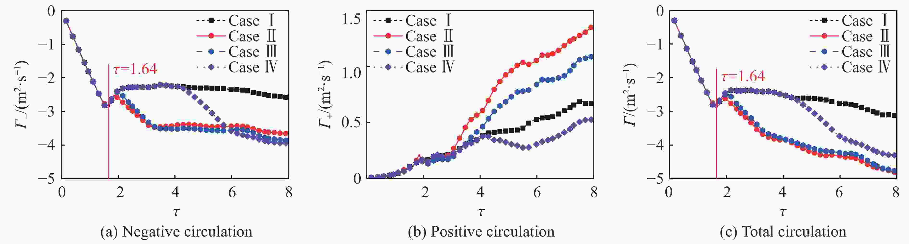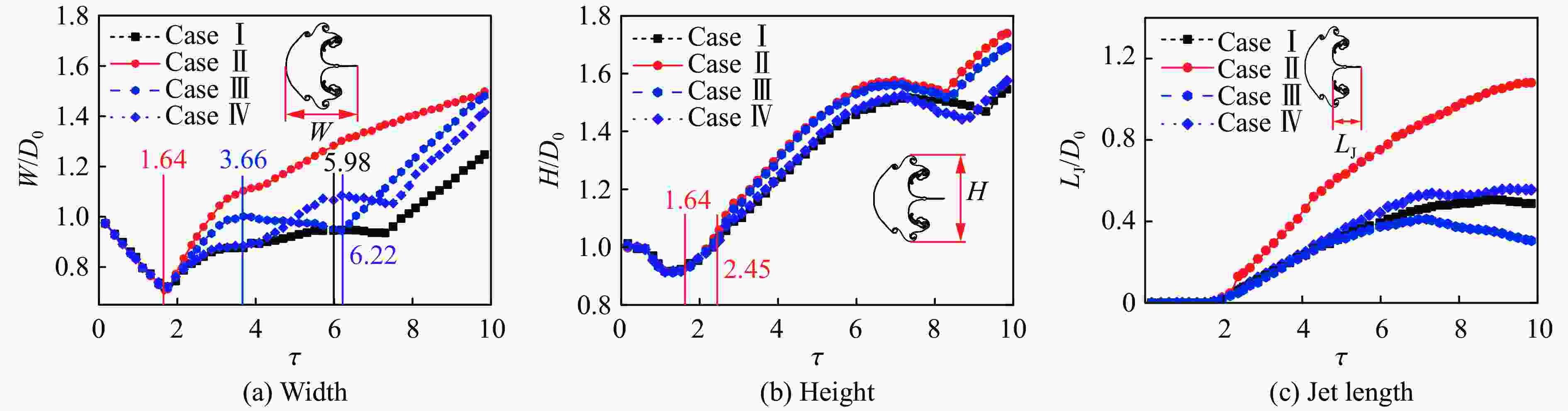 摘要: 针对实际应用中激波与物质近表面杂质及孔洞等相互作用中的界面邻近效应,通过数值模拟开展了下游平面重-轻界面对激波诱导重气柱演化影响的简化机理研究。结果表明,激波冲击气柱形成的衍射和透射波系依次冲击下游界面,在气柱与下游界面之间形成来回反射的波系结构,这些波系不仅影响气柱的界面演化,而且在下游界面诱导产生射流。在不同的界面间距条件下,气柱外部衍射波系在下游界面的反射波系不同,这些反射波系及气柱内部聚焦波系冲击气柱右极点的先后顺序也存在差异。当界面间距较小时,气柱射流可以穿透气柱与下游界面之间的间隙流体,并与下游界面射流耦合,显著促进气柱射流的演化。随着界面间距的增大,射流耦合现象逐渐减弱,重气柱演化涡对抑制了气柱射流的发展。当界面间距进一步增大时,气柱射流又会因下游界面反射稀疏波系的拉伸作用而被促进。此外,在不同的界面间距条件下,下游界面的存在均对气柱界面宽度、高度的发展及环量沉积起到促进作用。Abstract: To uncover the interface proximity effect arising from the interaction between shock wave and near-surface impurity and hole of material in practical applications, a simplified mechanism study on the influence of downstream planar heavy-light interfaces on the evolution of a shock-accelerated heavy gas cylinder was carried out through numerical simulation. The findings reveal that the diffracted and transmitted wave systems formed by the incident shock impacting the heavy gas cylinders successively interact with the downstream planar slow-fast interface, leading to the formation of wave systems that reflect back and forth between the gas cylinder and the downstream planar slow-fast interface. Significantly, these wave systems not only govern the evolution of the gas cylinder interface but also trigger the generation of jets at the downstream planar slow-fast interfaces. Under diverse interfacial spacing conditions, the type of reflected waves originating from the diffracted wave system outside the gas cylinder varies at the downstream interface, and the sequence of the reflected wave system and the focused wave system inside the gas cylinder interacting with the right pole of the gas cylinder is different. When the interfacial distance is narrow, the gas cylinder jet can permeate the gap fluid sandwiched between the gas cylinder and the downstream slow-fast interface and couple with the jet at the downstream planar slow-fast interface, which significantly promotes the evolution of the gas cylinder jet. As the interfacial distance increases, the jet coupling phenomenon progressively wanes, and the gas cylinder jet succumbs to the inhibitory effect of the vortex pair within the gas cylinder. With a further augmentation in interfacial distance, the gas cylinder jet will be promoted by the stretching effect of the reflected rarefaction wave system at the downstream interface. In addition, under different interface spacing conditions, the presence of a downstream planar slow-fast interface invariably augments the development of interfacial width, height, as well as circulation deposition.
