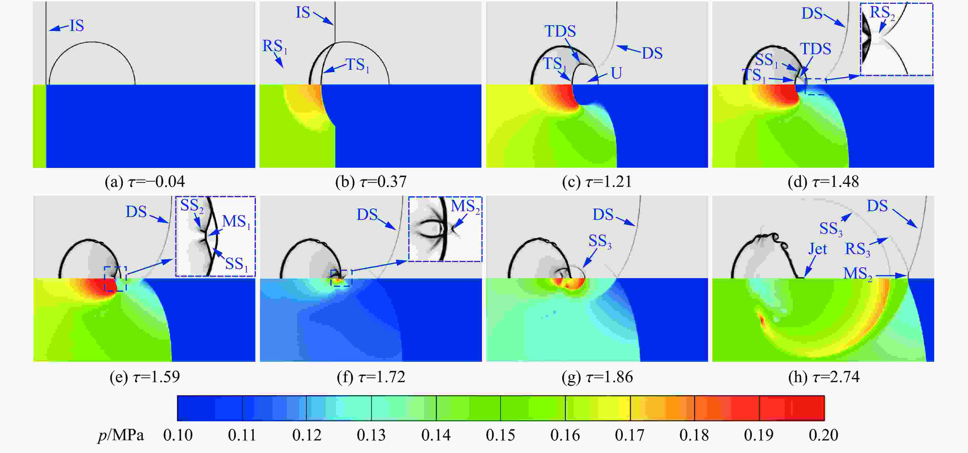 图 4 工况Ⅰ条件下激波与重气柱作用过程的数值纹影图(上)和压力云图(下)(IS、DS、TS1和TDS分别代表入射激波、衍射激波、透射激波和透射衍射激波,RS1和RS2代表反射激波,SS1、SS2和SS3代表流场横波,MS1和MS2代表马赫杆,U代表未扰动区)