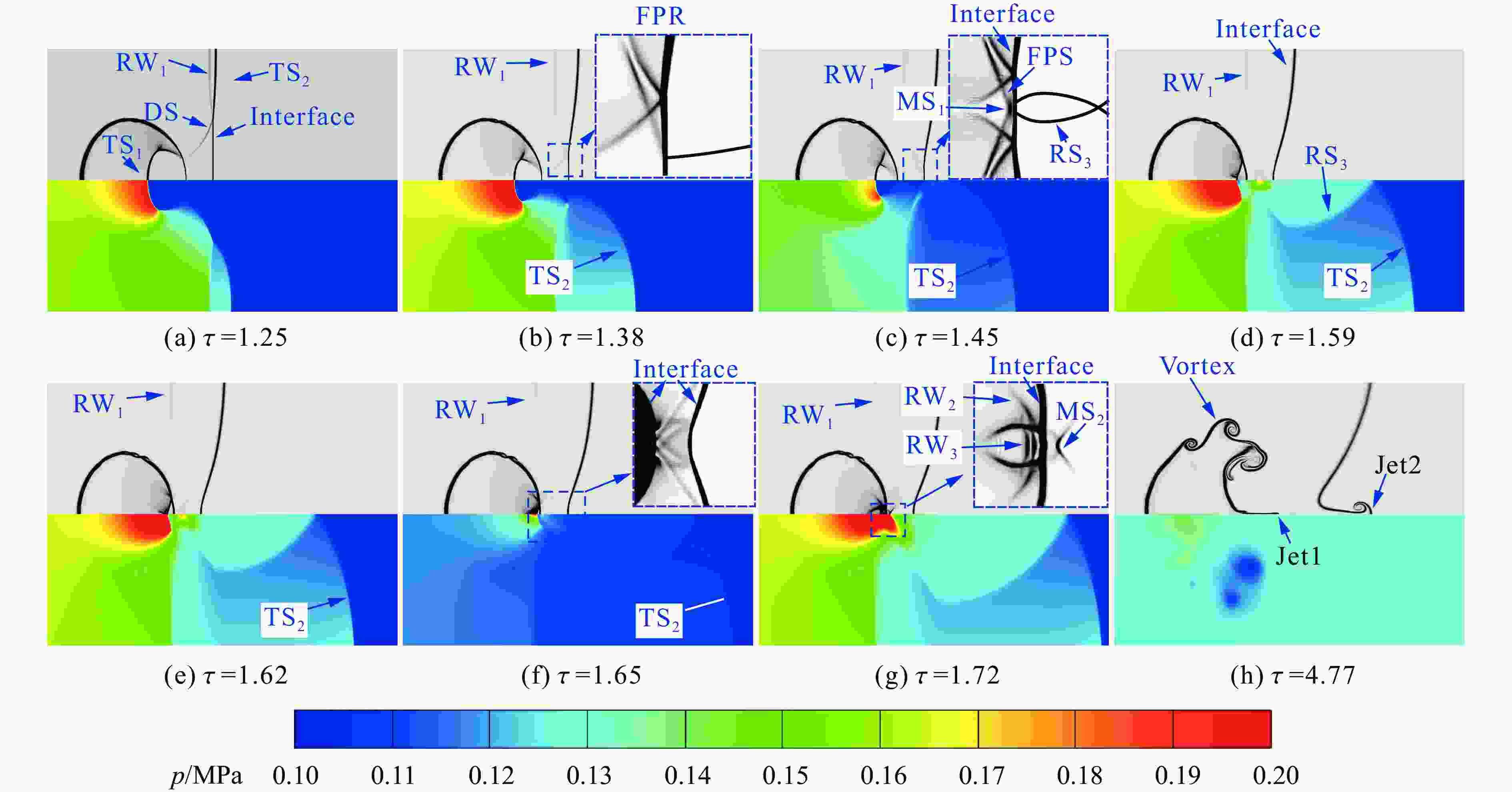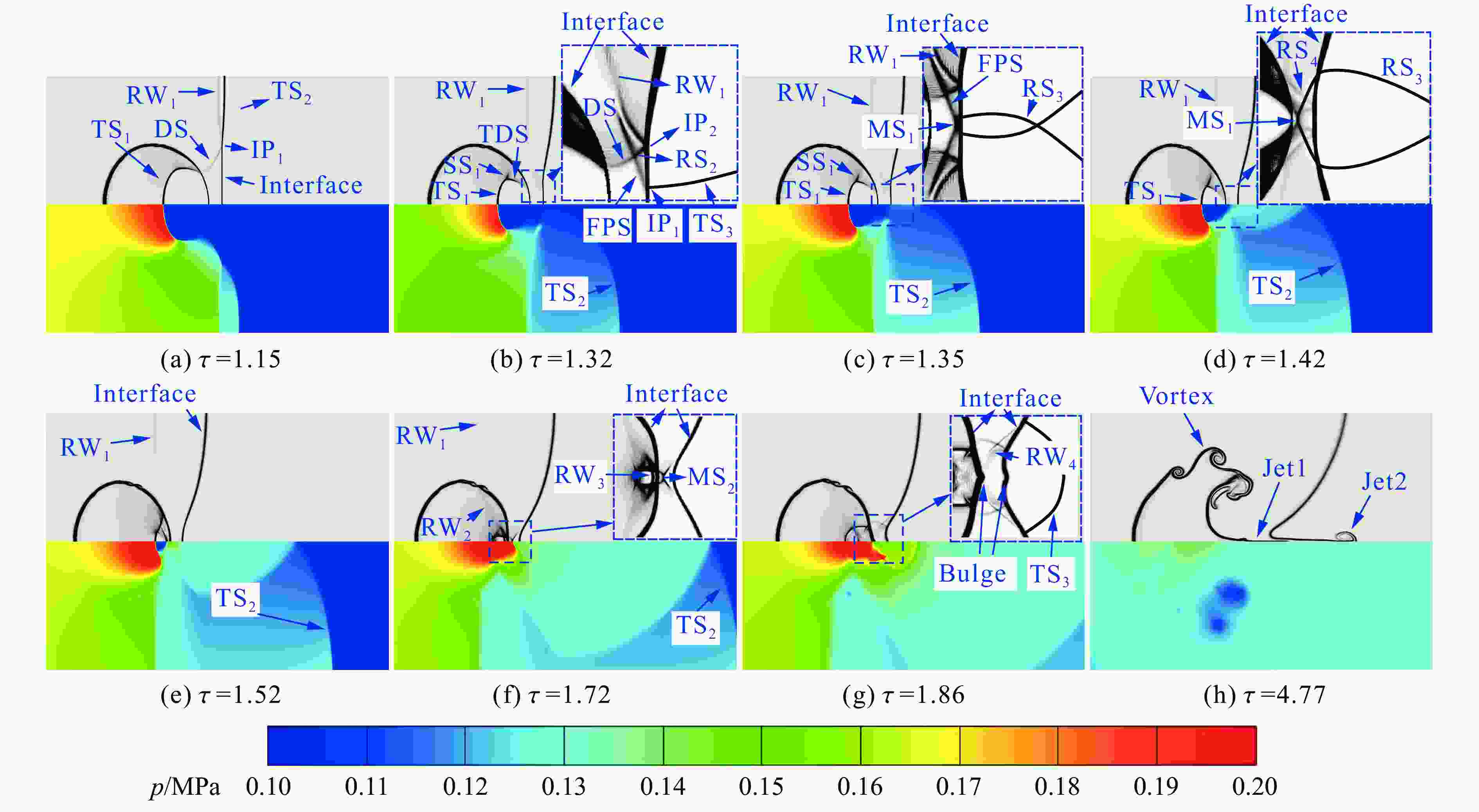 图 5 工况Ⅱ条件下激波与气柱作用过程的数值纹影图(上)和压力云图(下)(TS1、TS2和TS3代表透射激波,RS1、RS2、RS3和RS4代表反射激波,RW1、RW2、RW3和RW4代表反射稀疏波,SS1代表流场横波,FPS代表自由前驱激波,IP1和IP2代表激波与界面交点)
