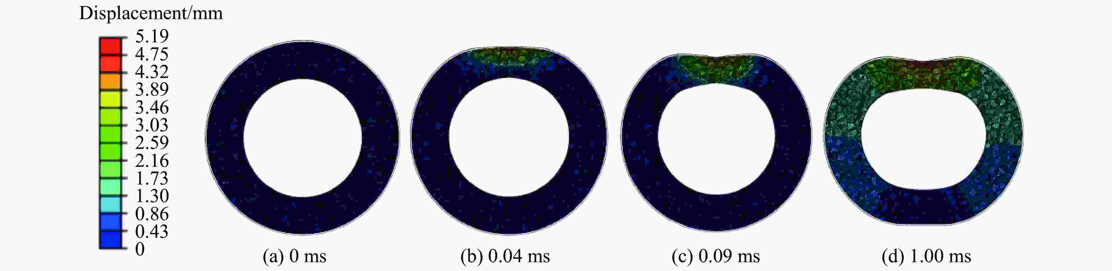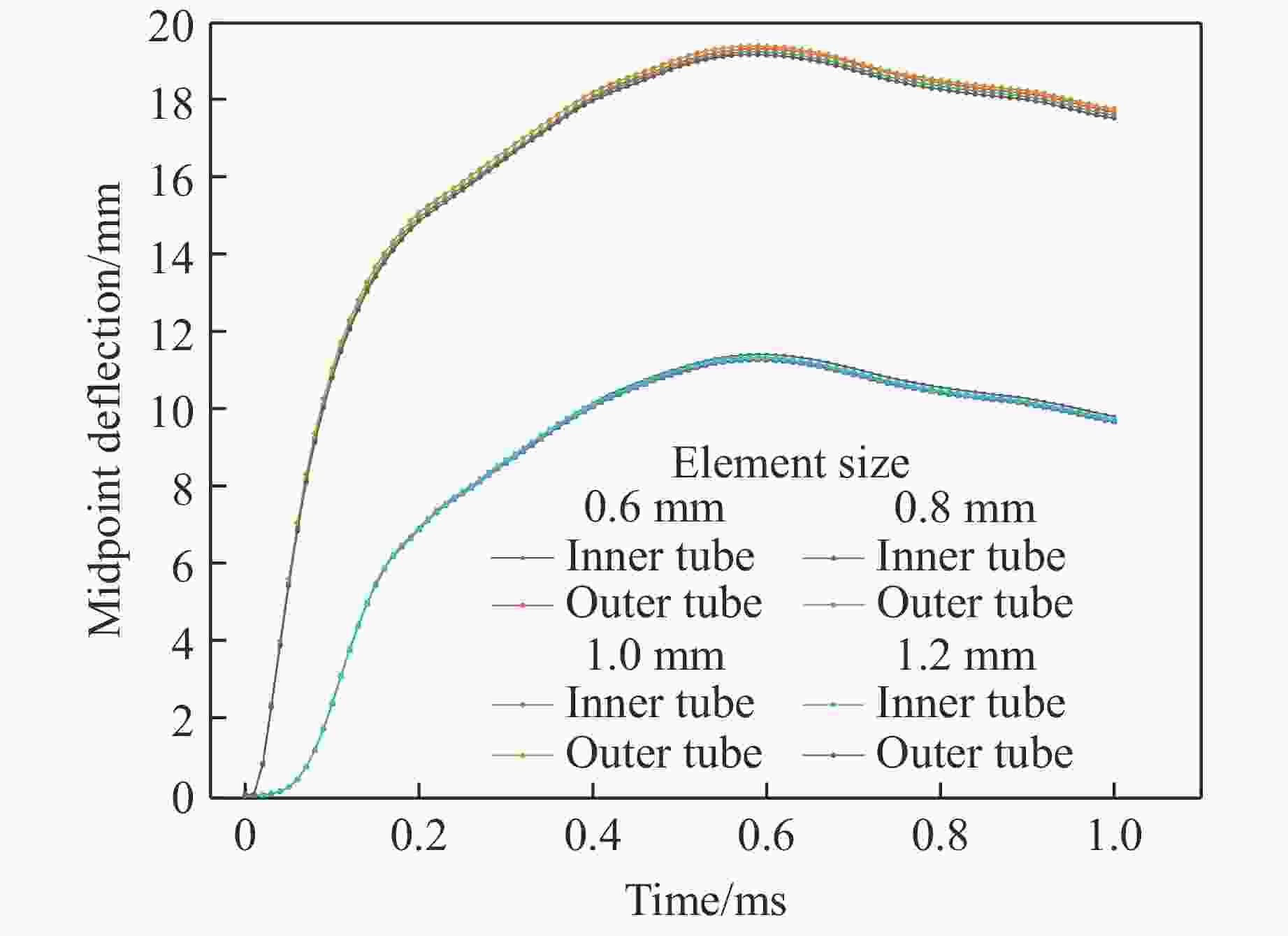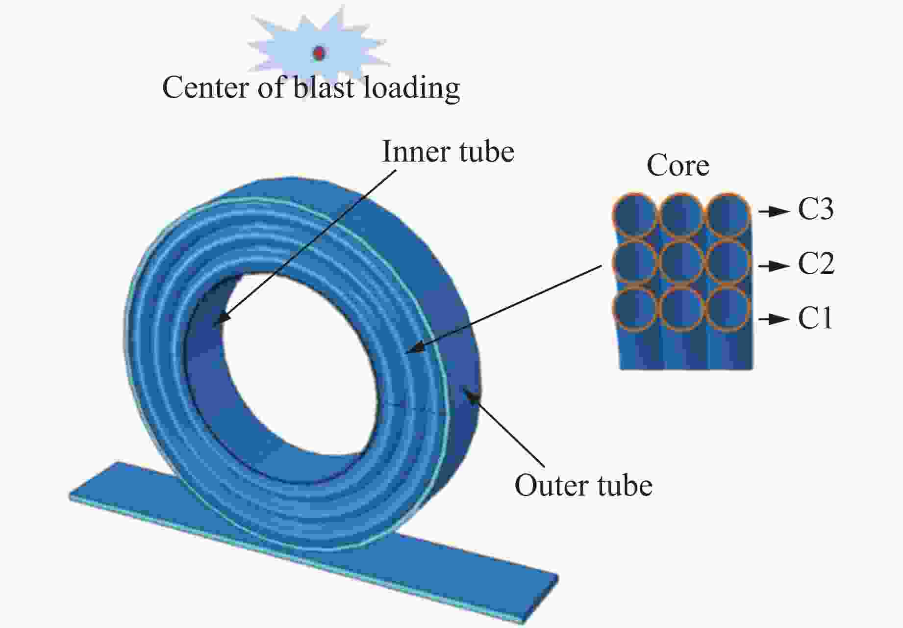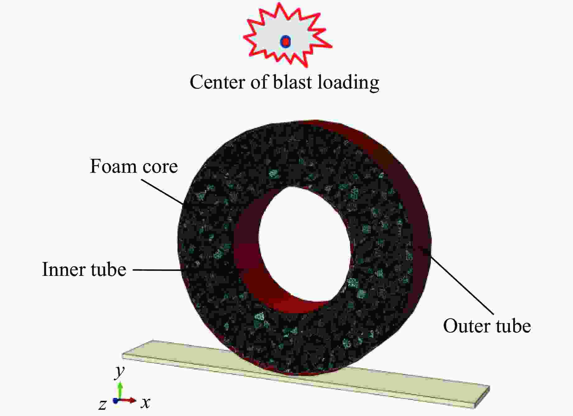 摘要: 结合实验与数值模拟,系统地分析了泡沫铝夹芯管在侧向爆炸载荷下的动态响应和能量吸收性能。通过弹道摆锤系统,开展了一系列侧向爆炸实验,分析了结构的几何参数、泡沫铝的相对密度以及炸药质量对泡沫铝夹芯管变形模态和抗爆性能的影响,获得了泡沫铝夹芯管在爆炸载荷作用下的最终变形模态和挠度。基于实验结果,通过数值模拟进一步比较了泡沫铝夹芯管和空心圆管夹芯管的抗爆性能,对空心圆管夹芯管在梯度与非梯度设计下的表现进行了对比分析。结果显示:在相同条件下,空心圆管夹芯管的最终变形均大于泡沫铝夹芯管,但两者之间的差异并不显著。在梯度空心圆管夹芯管结构中,最外层壁厚最大、中间层最薄的梯度配置在提升抗爆性能方面具有最佳的效果。此外,梯度空心圆管夹芯管的抗爆性能明显优于非梯度结构。Abstract: The dynamic response and energy absorption performance of foam aluminum sandwich tubes under lateral explosive loads were systematically investigated using a combination of experimental research and numerical simulation. A series of lateral explosion experiments were conducted using a ballistic pendulum system to analyze the effects of structural geometric parameters, foam aluminum density, and the explosive mass on the deformation mode and blast resistance performance. Based on the experimental results, numerical simulations were performed to further compare the blast resistance performance of foam aluminum sandwich tubes and circular tube core sandwich tubes, comparing gradient and non-gradient designs of circular tube core sandwich tubes. The results show that, the final deformation of circular tube core sandwich tubes is greater than that of foam aluminum sandwich tubes, although the difference is not significant. Among the gradient circular tube core sandwich tubes, the configuration with the largest outer wall thickness and the thinnest middle layer exhibits the best improvement in blast resistance performance. Furthermore, the blast resistance performance of gradient circular tube core sandwich tubes is significantly superior to that of non-gradient structures.