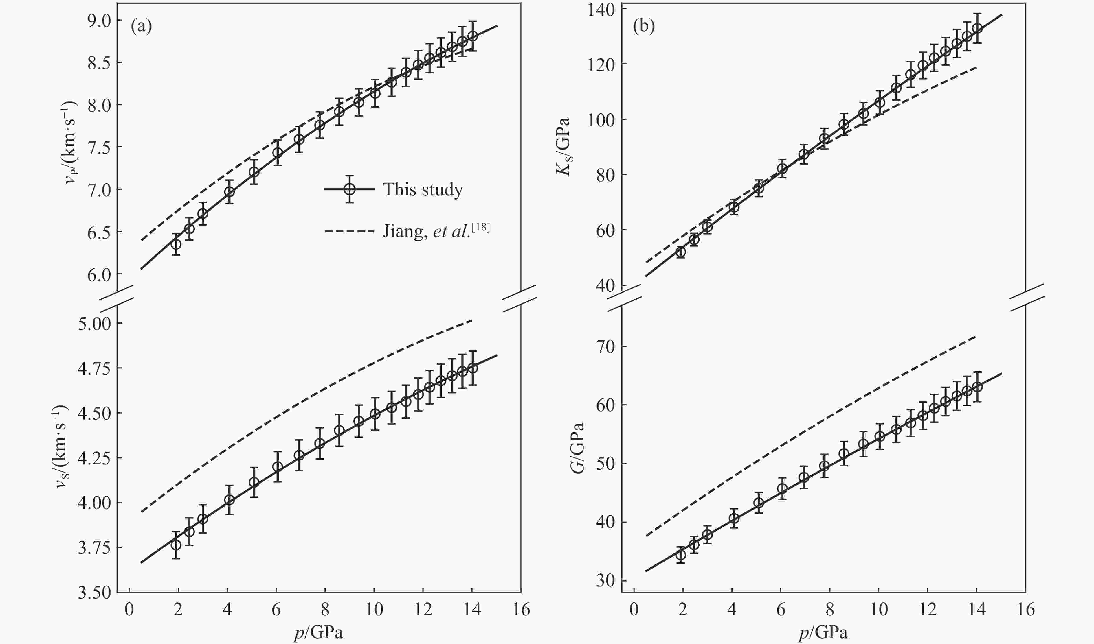 图 3 水镁石的高压弹性波速(a)和模量(b):圆圈为本研究测量数据,实线对应有限应变拟合得到的结果,虚线为Jiang等[18]的单晶布里渊测量结果