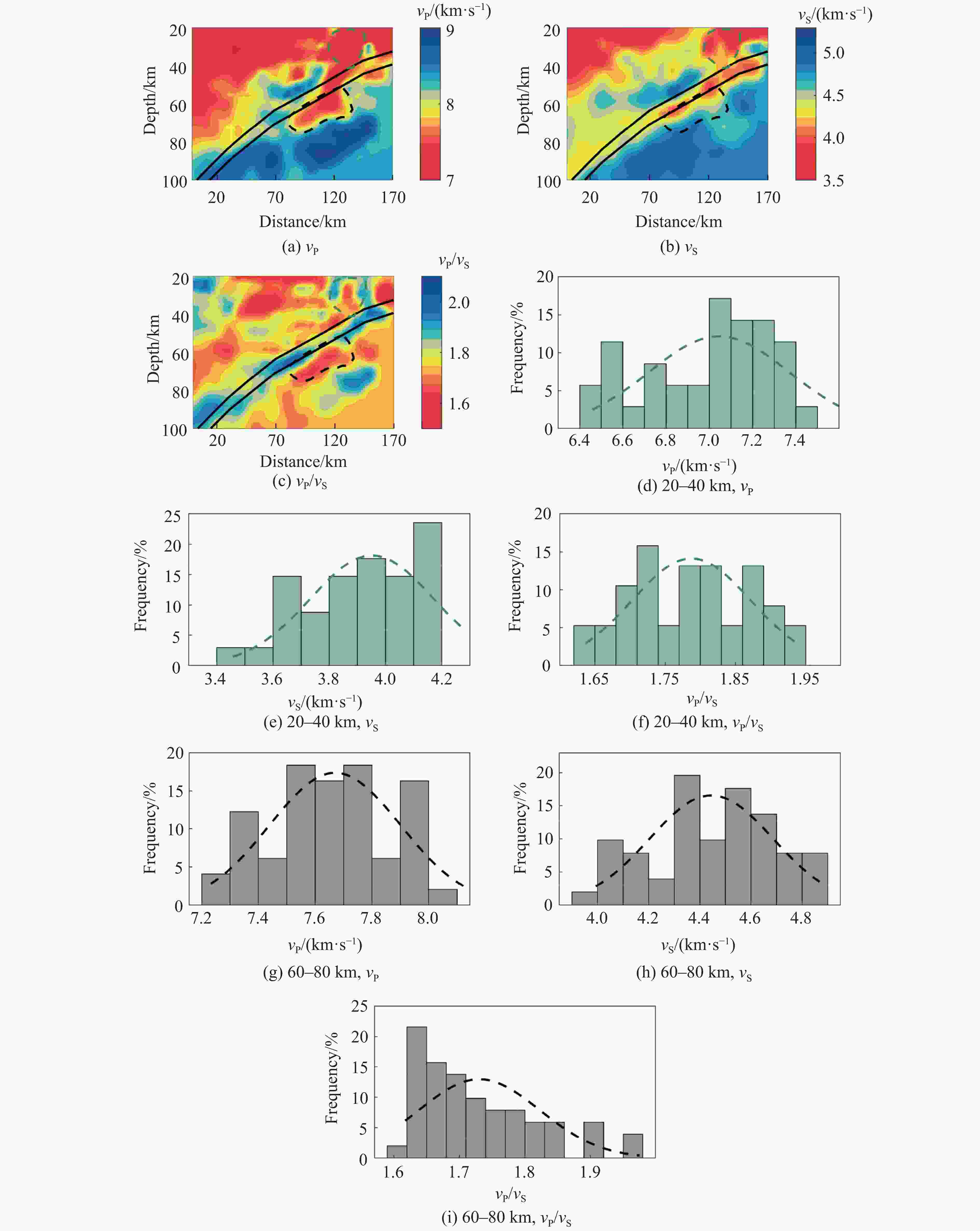 图 5 日本东北俯冲带速度结构:(a)~(c)分别为日本东北俯冲带40°N处地震学层析成像的vP、vS和vP/vS剖面[1](黑色实线为俯冲洋壳,绿色和黑色虚线为20~40 km和60~80 km深度的低波速异常区),(d)~(f) 为20~40 km异常区vP、vS和vP/vS的数据分布,(g)~(i) 为60~80 km异常区vP、vS和vP/vS的数据分布