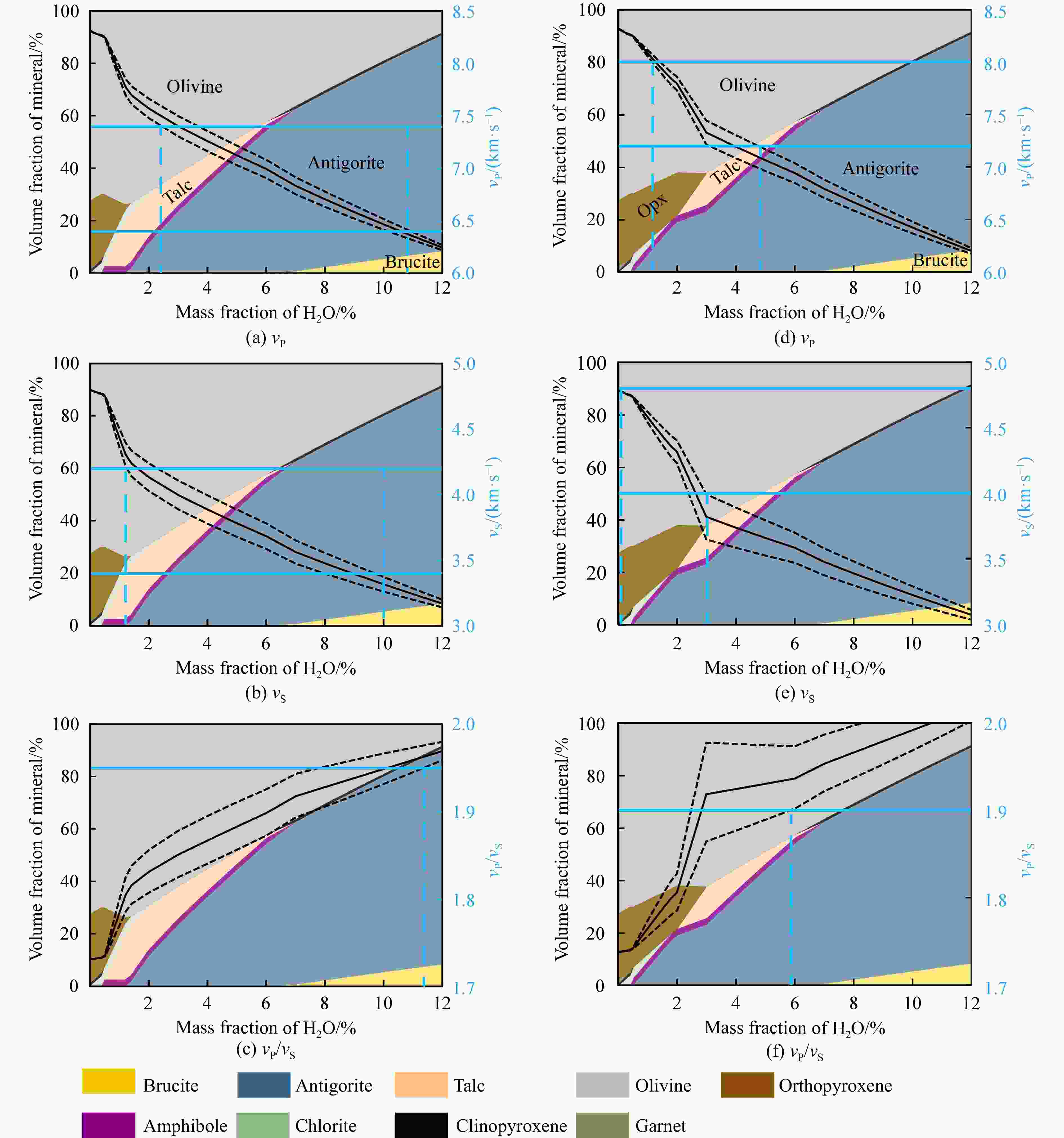 图 6 日本东北俯冲带低速异常区的水含量:(a)~(c)为1.5 GPa和573 K条件下的结果,(e)~(f)为2.0 GPa和673 K条件下的结果(蓝色实线为地震学观测的速度范围,黑色实线和黑色虚线分别为利用VRH平均模型和矿物弹性性质计算的结果,蓝色虚线为地震学观测速度和矿物学计算速度共同约束得到的水含量)