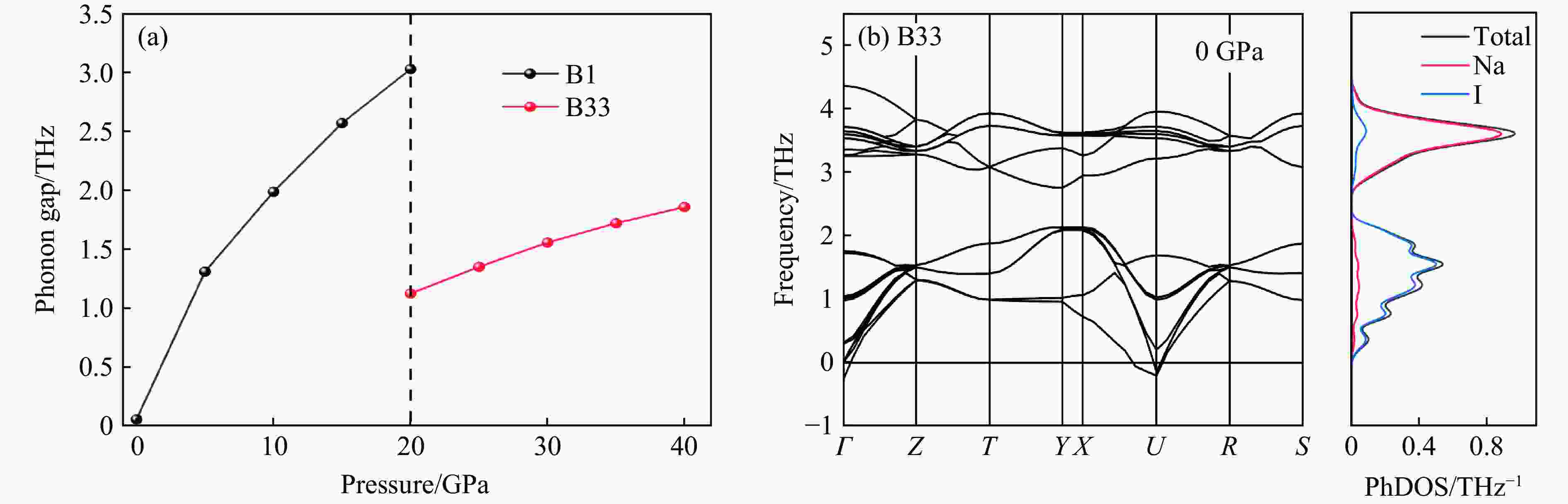 Figure  11.  (a) Pressure dependence of phonon gap in both phases of NaI; (b) phonon dispersion and PhDOS of B33 phase in NaI at 0 GPa