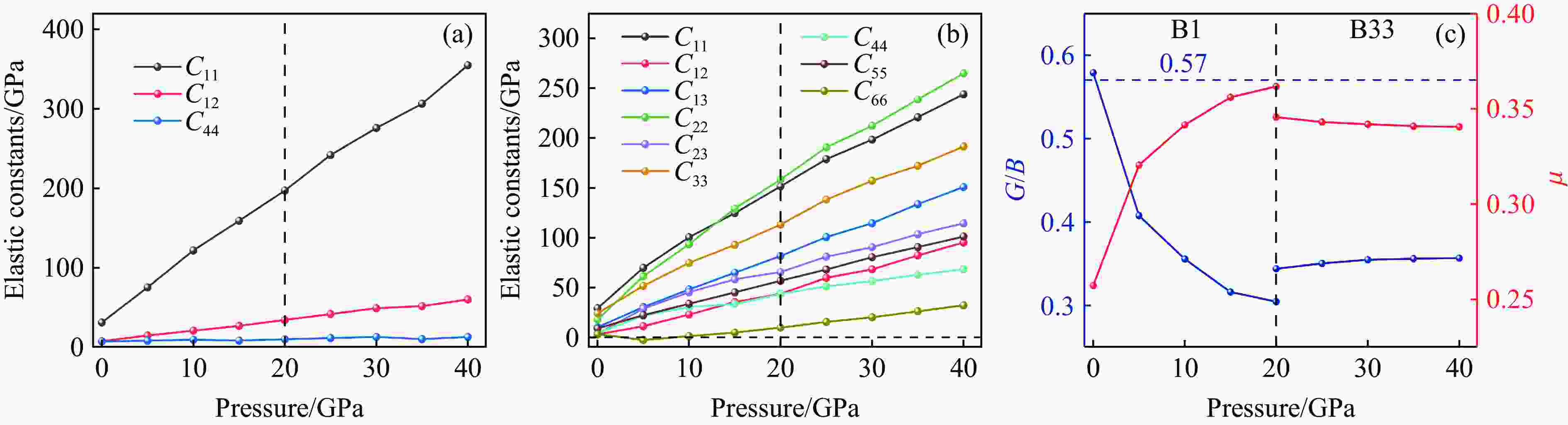 Figure  5.  (a) Elastic constants for B1 phase; (b) elastic constants for B33 phase; (c) G/B and Poisson’s ratio μ for B1 and B33 phases under high pressures