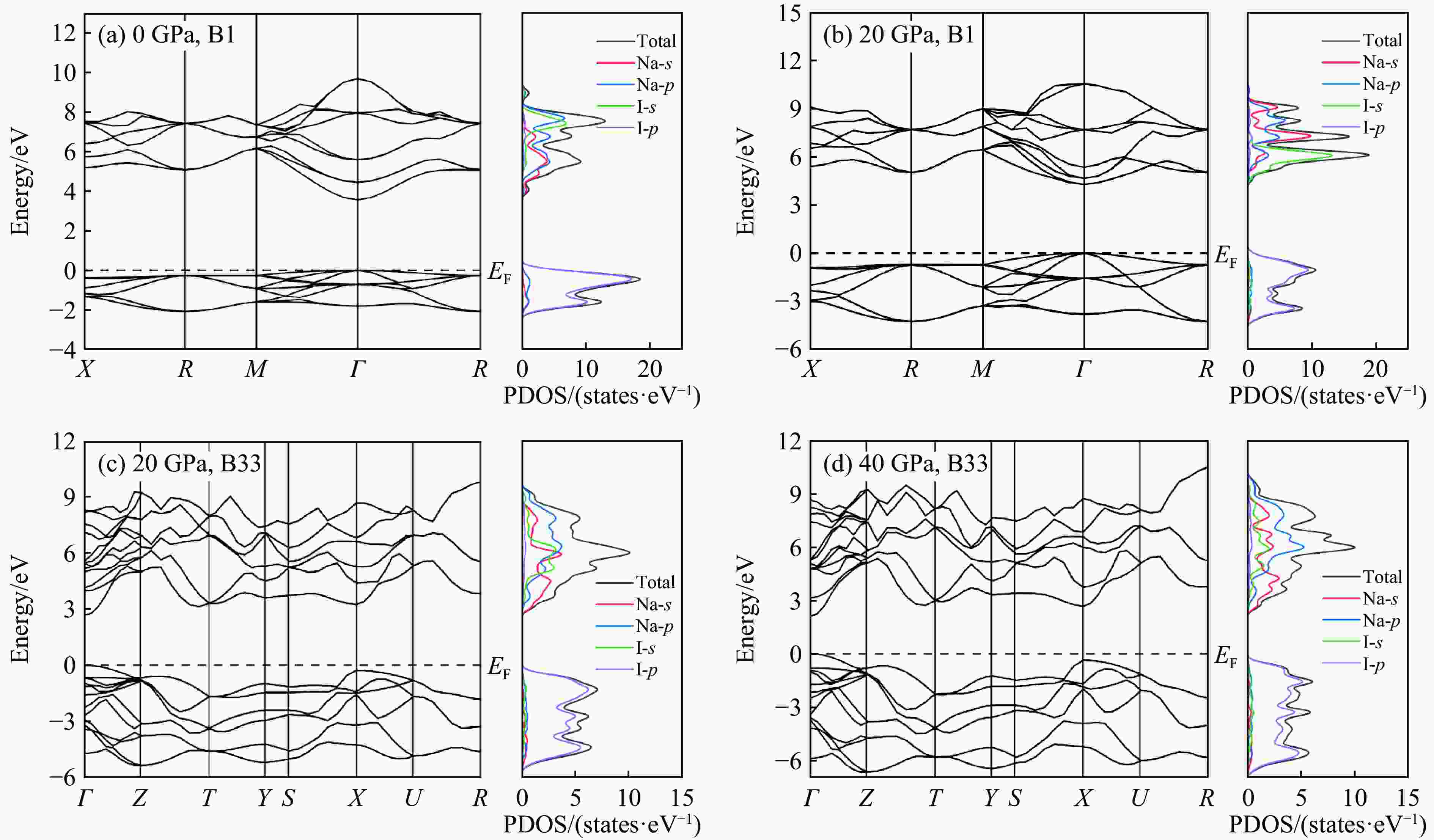 图  不同压力下NaI的能带结构和投影态密度