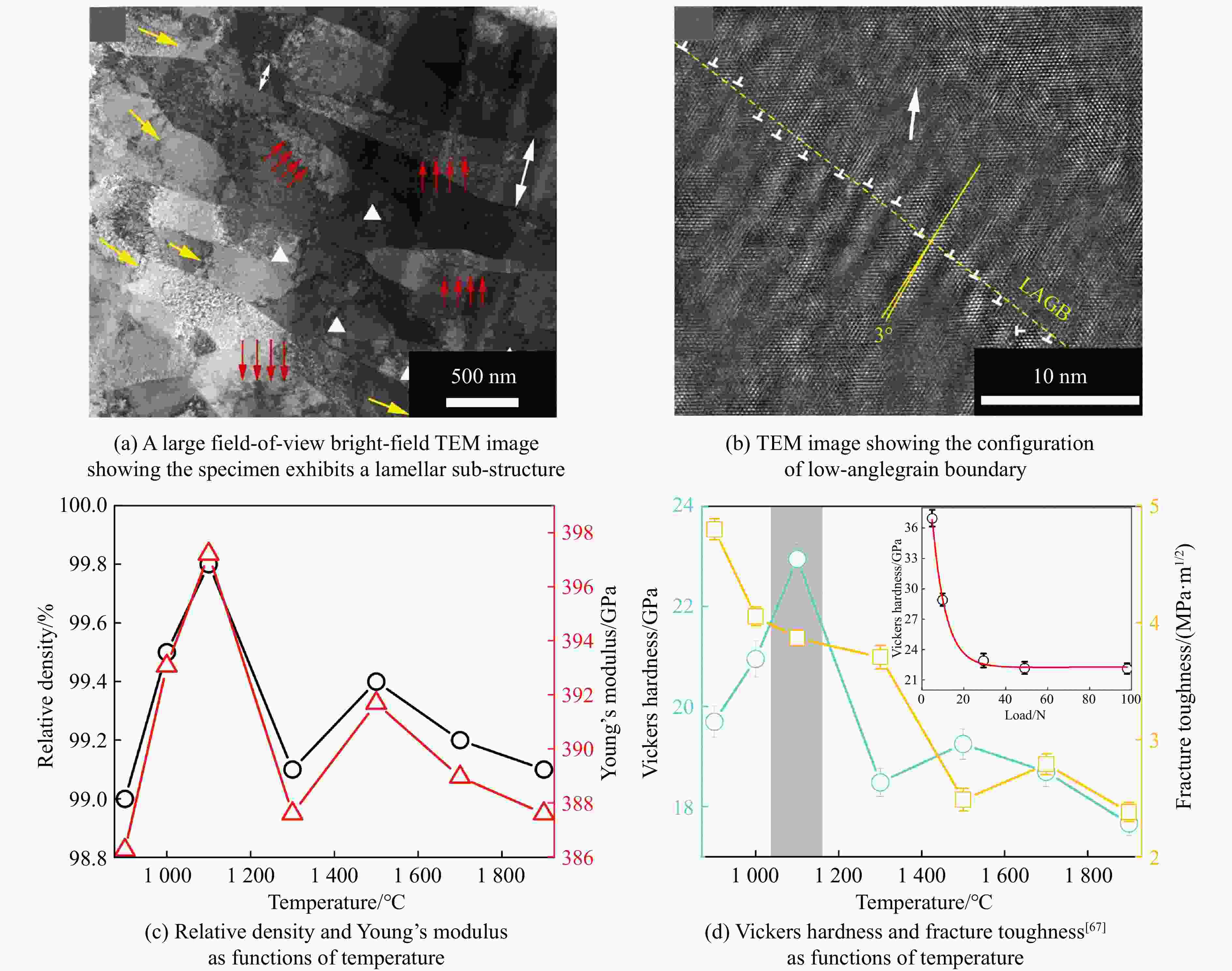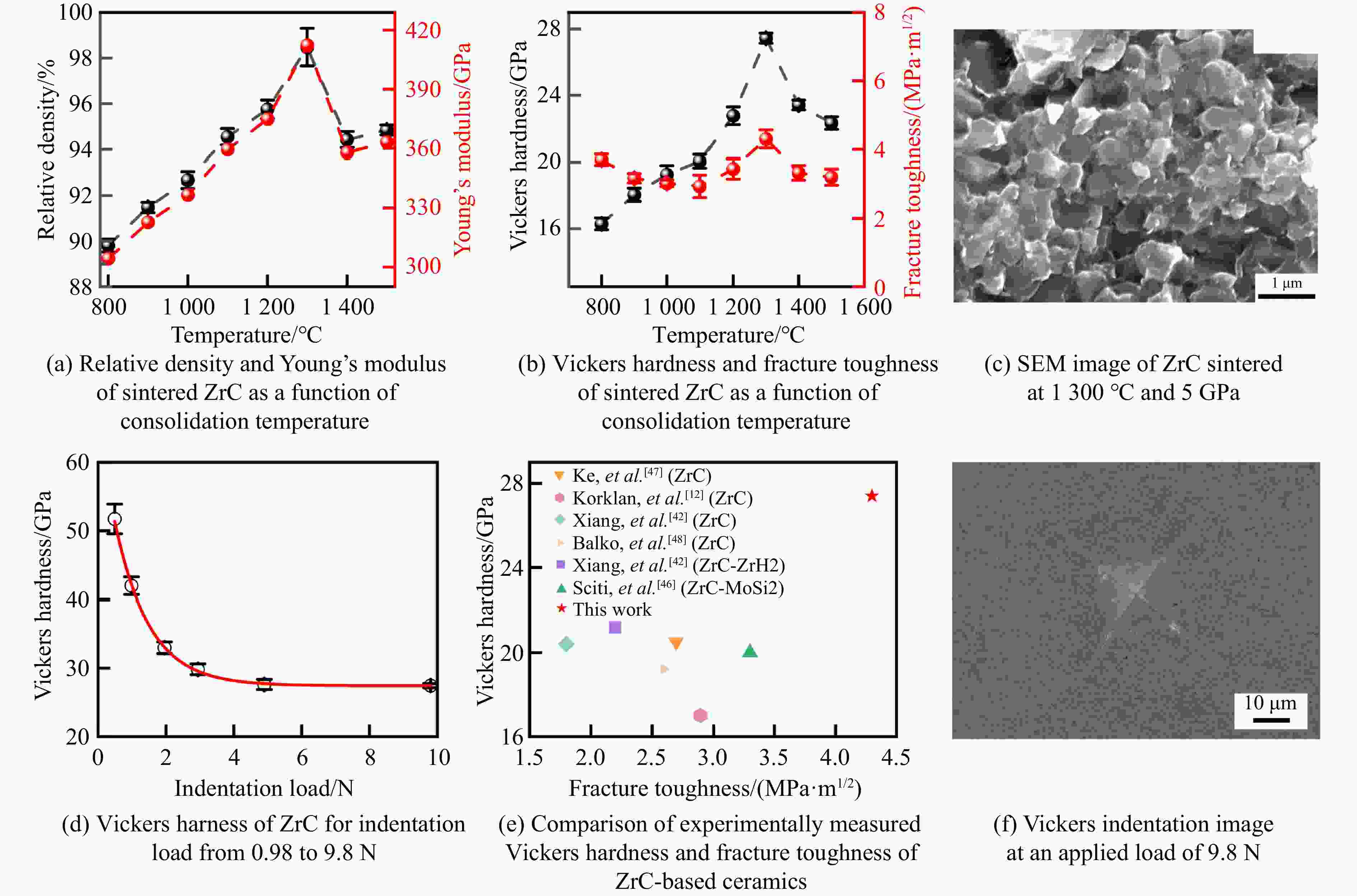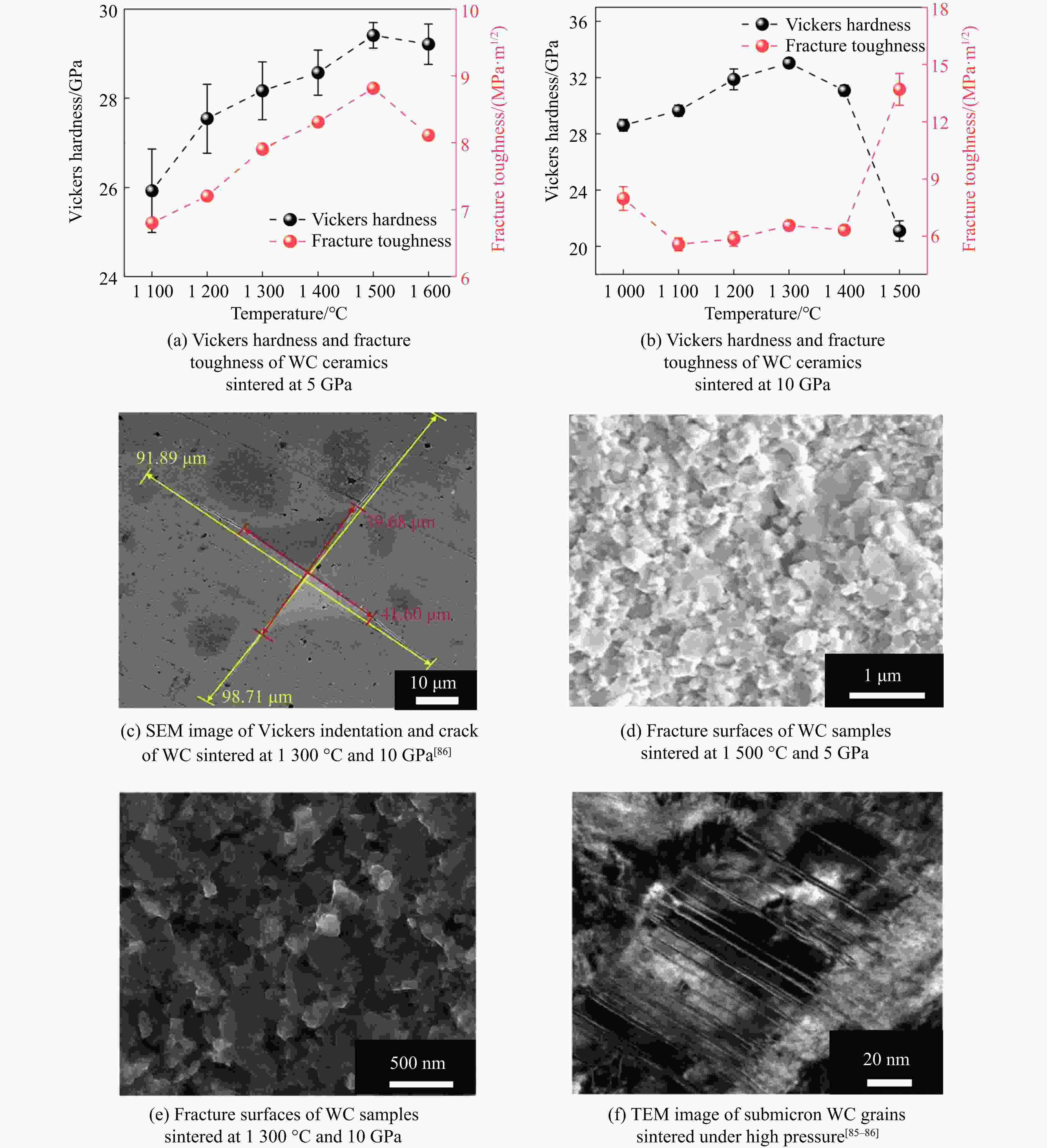 摘要: 过渡金属碳化物具有高硬度、高熔点、高电导率、耐腐蚀等优异的综合性能,在航空航天、切削加工等极端环境领域具有广阔的应用前景。由于过渡金属碳化物具有强共价键和低扩散系数,其烧结制备所需的温度极高,制备高致密度且性能优异的块体陶瓷具有挑战性。高温高压烧结方法具有可有效降低烧结温度、缩短烧结时间、抑制晶粒生长、提高致密化程度并保持物相纯净等优点。本文从高温高压合成角度,综述了数种典型过渡金属碳化物(ⅣB~ⅥB族)的制备、力学性能、微观机制的研究进展,总结并展望了过渡金属碳化物陶瓷的应用前景和未来发展方向。Abstract: Transition metal carbides (TMCs) exhibit exceptional properties, including high hardness, high melting point, excellent electrical conductivity, and corrosion resistance, making them promising candidates for extreme environments such as aerospace and cutting tools. However, the strong covalent bonding and low diffusion coefficients inherent to TMCs necessitate extremely high sintering temperatures, posing significant challenges for fabricating dense bulk ceramics with superior properties. The high pressure and high temperature (HPHT) sintering technique offers distinct advantages, effectively lowering sintering temperatures, reducing processing times, suppressing grain growth, enhancing densification, and preserving phase purity. This review summarizes recent advances in the HPHT synthesis, mechanical properties, and underlying mechanisms of several typical TMCs (Groups ⅣB to ⅥB). The application prospects and future research directions for TMC ceramics are also discussed and outlined.