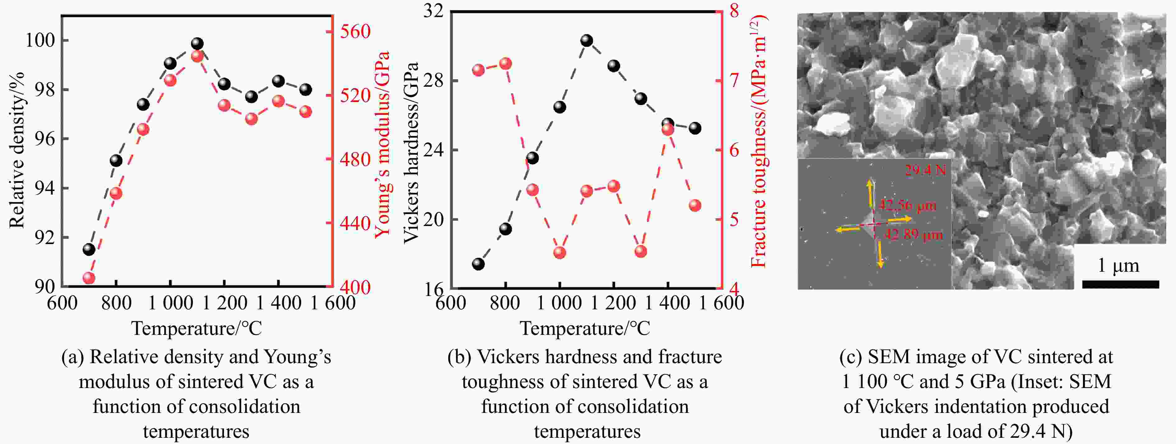 stability/℃TiC SPS 1 650 ℃, 100 MPa[38–39] 25.7/27 97.9/95.1 HFIHS 80 MPa[16] 25.7 99 PS 1 700 ℃[40] 20.3 95.7 HPHT 1 500 ℃, 14 GPa[41] 31.2 4.2 99.7 ZrC SPS 1 850 ℃, 100 MPa[42] 20.4 376 1.8 98 1 800 ℃, 40 MPa[43] 17.6 3.3 95.5 PS 2 100 ℃[89] 8.9 94.4 HPHT 1 300 ℃, 5 GPa[44] 27.4 412 4.3 98.2 713 HfC SPS 2 200 ℃, 65 MPa[31] 19 500 98 2 300 ℃, 38 MPa[13] 10.2 283 2.9 85 HPS 1 900 ℃, 30 MPa[10] 5.79 1.88 89 HPHT 1 700 ℃, 15 GPa[32] 25.8 455 5.5 99.5 860 VC HPHT 1 100 ℃, 5 GPa[59] 30.4 544 5.4 99.8 655 NbC HPHT 1400 ℃, 5 GPa[63]19.2 7.7 99.4 TaC SPS 2 350 ℃, 38 MPa[13] 13.9 458 2.7 98 HPS 2 300 ℃, 30 MPa[52] 14 3 94 2 000 ℃, 40 MPa[54] 15.7 4.1 97 HFIHS 80 MPa[53] 22 5.1 96 HPHT 1 300 ℃, 5.5 GPa[56] 21 457 97.7 Cr3C2 HPS 1 300 ℃, 40 MPa[70] 18.5 5.6 HIP 1 330 ℃, 150 MPa[70] 17 5 GPCS 727 ℃, 100 MPa[71] 18 5.6 PECPS 1 300 ℃, 30 MPa[72] 18.9 7.1 98.9 HPHT 1 700 ℃, 15 GPa[74] 24 459 4.9 99 Mo2C HPS 1 550 ℃, 50 MPa[66] 16 400 100 HPHT 1 100 ℃, 15 GPa[67] 23 397 3.9 99.8 655 WC SPS 1 400 ℃, 80 MPa[88] 27 7.2 99.3 HPHT 1 500 ℃, 5 GPa[85] 29.3 8.9 99.2 1 300 ℃, 10 GPa[86] 33 6.6 -
