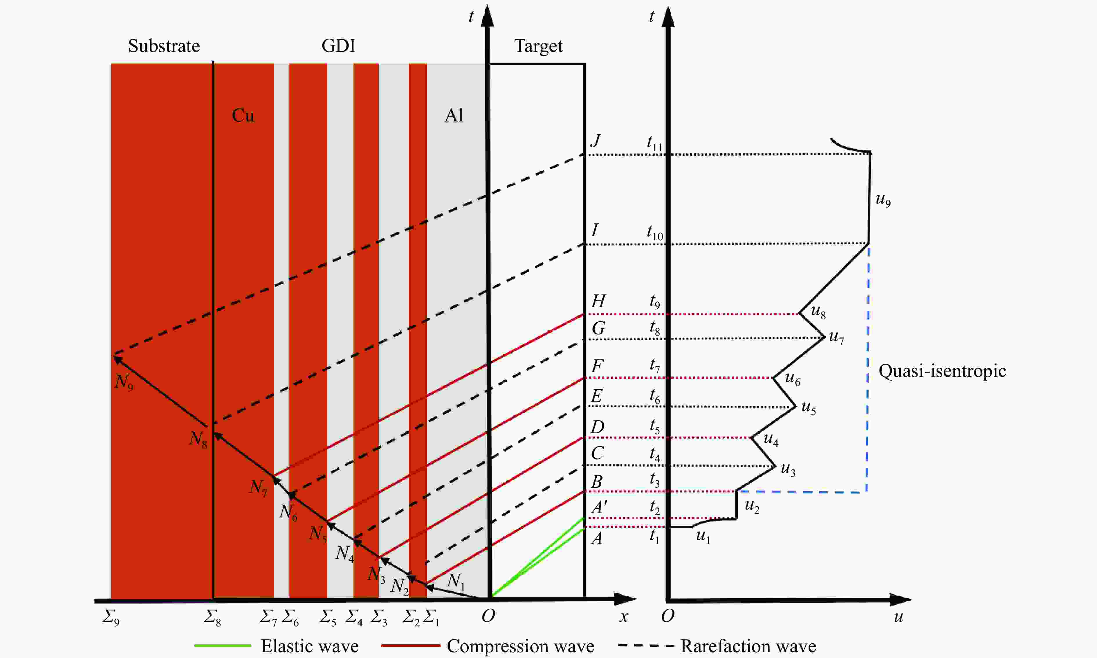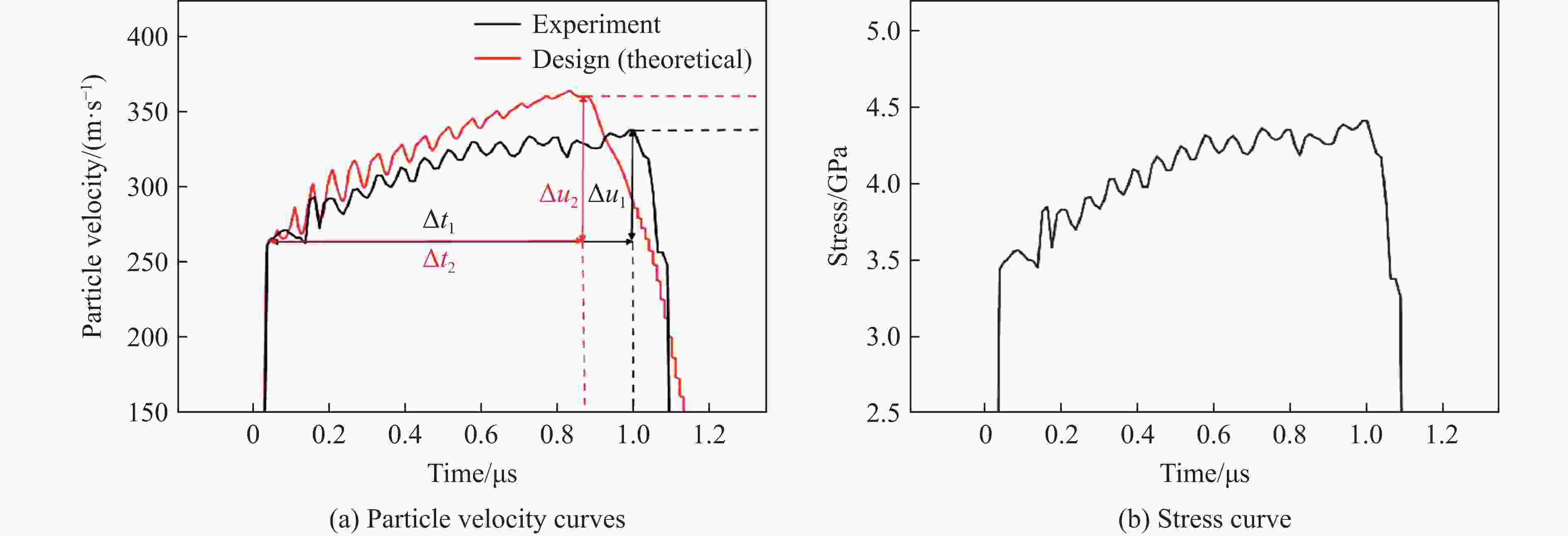 摘要: 周期叠层梯度材料具有独立可控的波阻抗分布和极少的物相反应,已被用于实现准等熵加载。然而,由于制备技术的局限性,目前制备的周期叠层梯度材料的波系作用时间只有纳秒量级,难以获得更高量级的加载时间。为此,系统探究了流延技术,成功通过流延法结合低温致密化技术制备出大尺寸Al-Cu周期叠层梯度材料。通过微观结构表征和动态加载实验,验证了其质量和准等熵加载特性。结果表明:材料梯度结构明显,层间平行度高,层界面结合良好,无裂纹缺陷,且无金属间化合物生成;材料致密度达95.8%,整体变形量小于15 μm。Al-Cu周期叠层梯度材料以510.6 m/s的驱动速度加载6 μm厚Al靶时,加载波形振荡上升,加载时间接近1 μs。通过对实验材料Al/Cu周期层厚和Cu层波阻抗进行修正,设计模拟结果与实验曲线在加载趋势上吻合较好,表现出良好的准等熵加载特性。研究结果可为周期叠层梯度材料制备技术提供理论依据和技术支持。Abstract: Periodic laminated gradient materials with independently controllable wave impedance distributions and minimal physical phase reactions are now being used for quasi-isentropic loading. However, the wave system action time of the currently periodic laminated gradient materials are on the order of nanoseconds due to limitations in preparation technology, which makes it difficult to achieve loading times of significantly larger magnitudes. In this study, the tape casting process was systematically investigated, and large-size Al-Cu periodic laminated gradient materials were successfully prepared using a combined technique of tape casting and low-temperature densification. The quality and quasi-isentropic loading properties were verified through microstructural characterization and dynamic loading experiments. The results show that the gradient structure of the material is well-defined, the interlayer parallelism is high, the layer interface is well bonded, and that no crack defects or intermetallic compounds generated. The material exhibits a densification of 95.8% and a total deformation less than 15 μm. When the Al-Cu periodic laminated gradient material was loaded with a 6 μm-thick Al target at a driving speed of 510.6 m/s, the loading waveform oscillated and increased with a loading time approaching 1 μs. The loading trends of simulation results agree well with the experimental curves through correcting Al/Cu periodic layer thickness and Cu layer wave impedance. The materials demonstrate excellent quasi-isentropic loading characteristics. This study provides theoretical basis, technical support and new preparation techniques for the application of periodic laminated gradient materials.