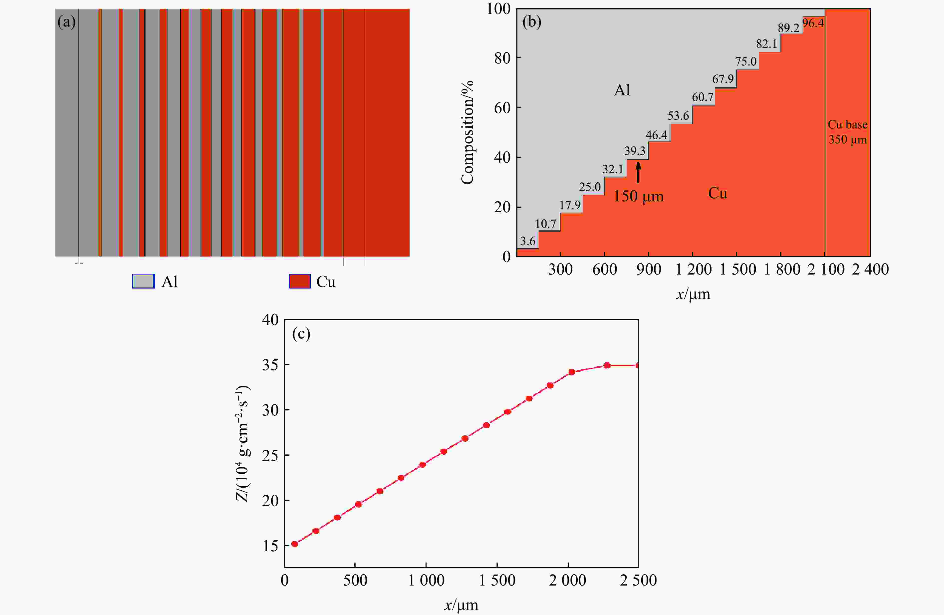 Point Atom fraction/% Al Cu C O 1 0 95.75 1.22 3.02 2 8.06 88.51 3.43 0 3 0 94.45 2.73 2.82 4 95.64 0 3.03 1.33 5 7.28 92.72 0 0 表 2 Al-Cu周期叠层梯度材料不同物相的物性参数