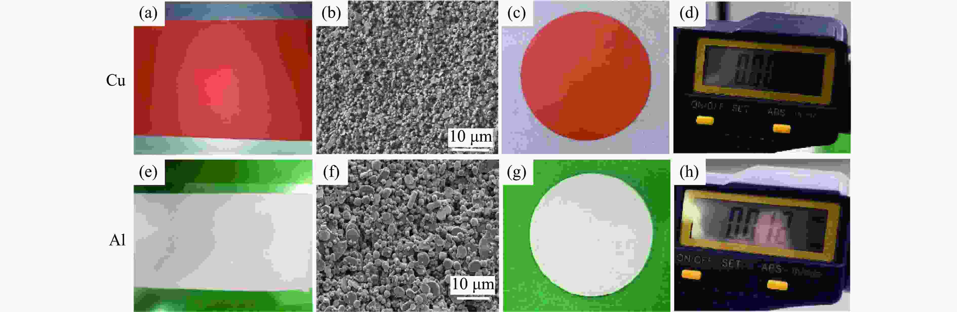 图 8 纯Cu和纯Al流延素片的表征:(a)~(d) Cu素片的宏观形貌、微观形貌、加工形貌、厚度,(e)~(h) Al素片的宏观形貌、微观形貌、加工形貌、厚度