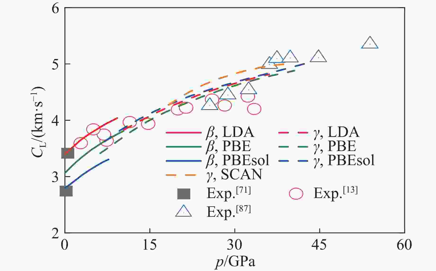 图 15 采用4种泛函结合能量-应变法计算的沿主Hugoniot线的β-Sn和γ-Sn的声速(对比实验数据来自文献[13, 71, 87])