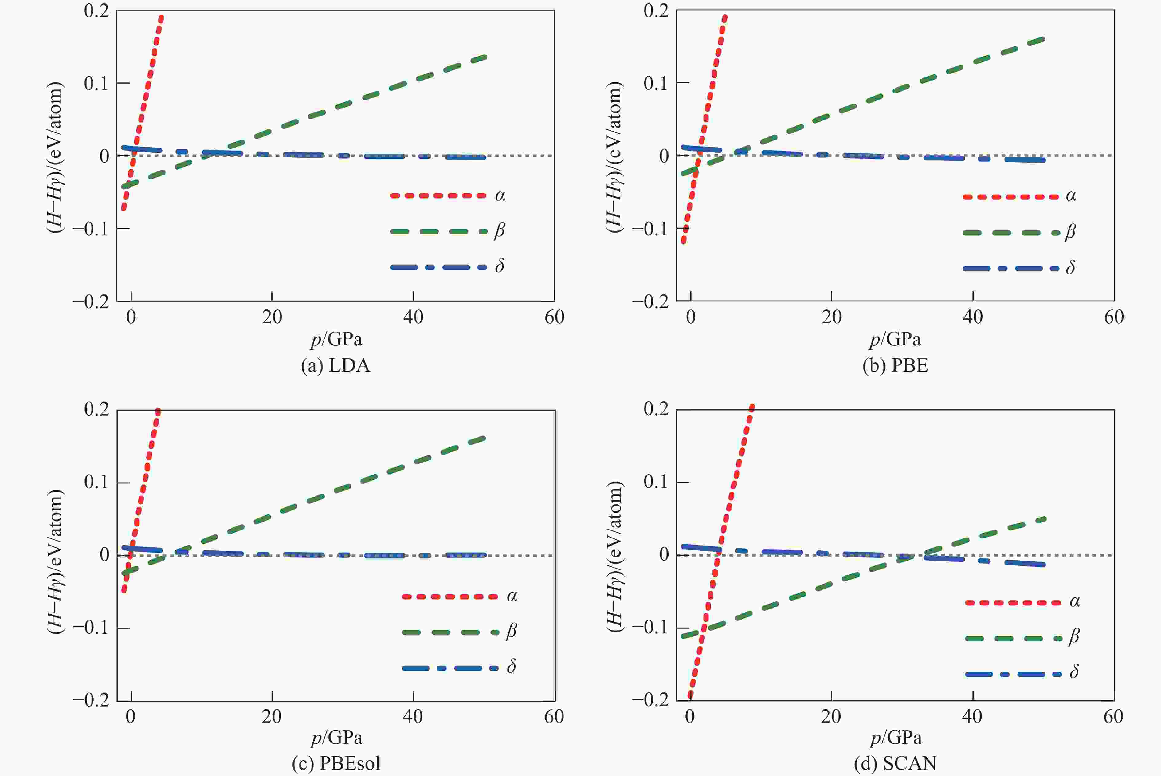 Phase Method a0/Å c0/a0 V0/(Å3/atom) E0/(eV/atom) B0/GPa $B'_0 $ Exp. 6.483[60] 1.000[60] 34.06[60] 3.140[61] 42.6[62] LDA 6.476 1.000 33.94 3.958 45.0 4.9 α-Sn PBE 6.654 1.000 36.83 3.152 35.9 4.8 PBEsol 6.539 1.000 34.95 3.509 41.7 4.8 SCAN 6.549 1.000 35.11 3.414 41.5 4.6 Exp. 5.831[60] 0.546[60] 27.07[60] 3.100[16] 57.0[62] LDA 5.778 0.543 26.19 3.977 60.1 4.8 β-Sn PBE 5.929 0.544 28.40 3.112 47.6 4.8 PBEsol 5.827 0.543 26.87 3.536 56.1 4.8 SCAN 5.868 0.544 27.45 3.335 52.7 4.8 LDA 3.920 0.854 25.63 3.938 57.0 4.9 PBE 4.041 0.846 27.80 3.091 45.5 4.9 γ-Sn PBEsol 3.945 0.859 26.26 3.517 54.3 4.8 SCAN 3.956 0.866 26.99 3.226 47.3 5.2 Exp. 76.4[9] 4.04[9] LDA 3.708 1.000 25.48 3.928 59.4 4.8 δ-Sn PBE 3.809 1.000 27.63 3.081 47.3 4.8 PBEsol 3.738 1.000 26.12 3.507 55.8 4.8 SCAN 3.770 1.000 26.78 3.215 51.4 4.8 表 3 采用4种交换-关联泛函计算得到的Sn的4个相分别稳定存在的压强范围