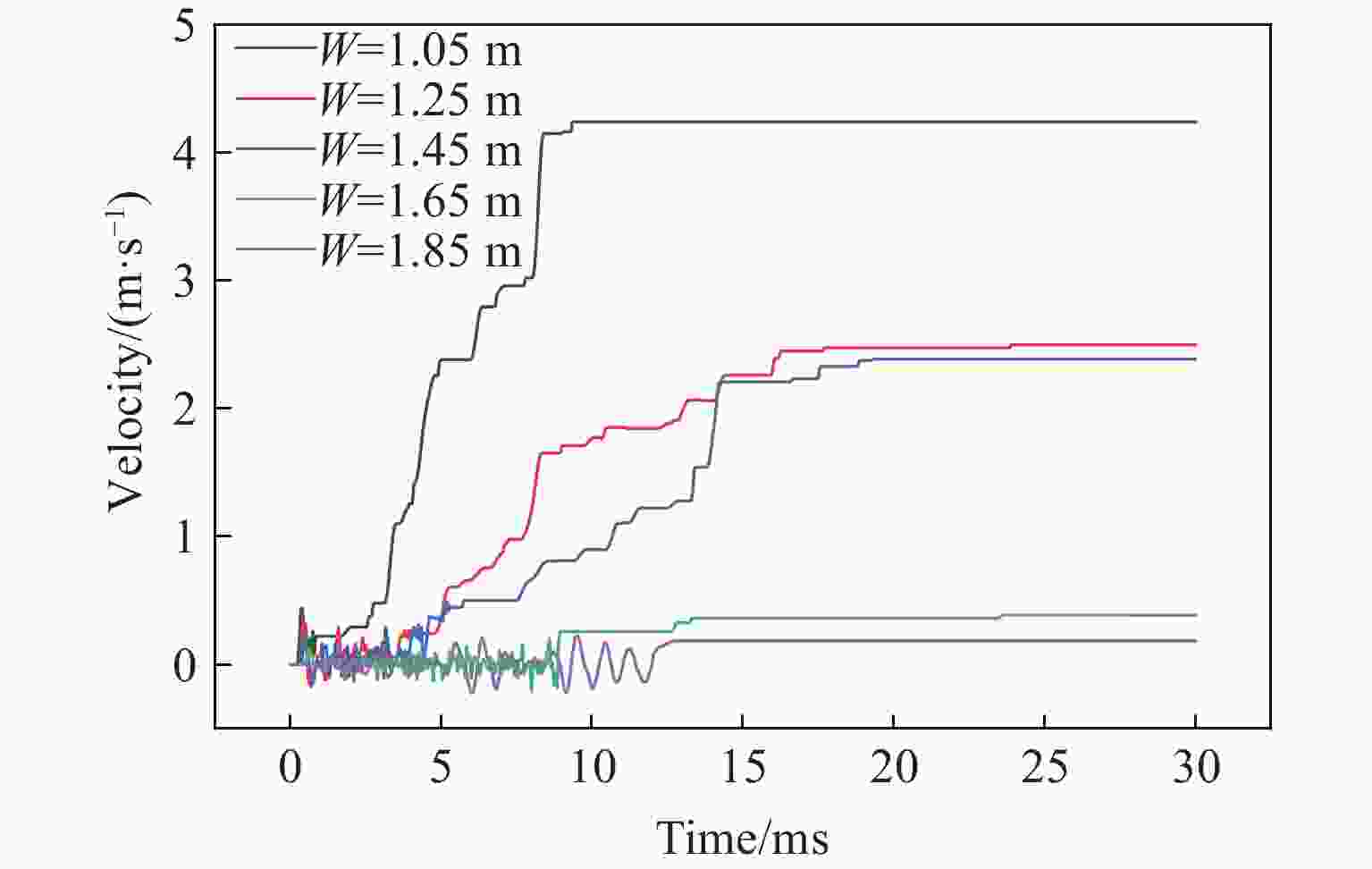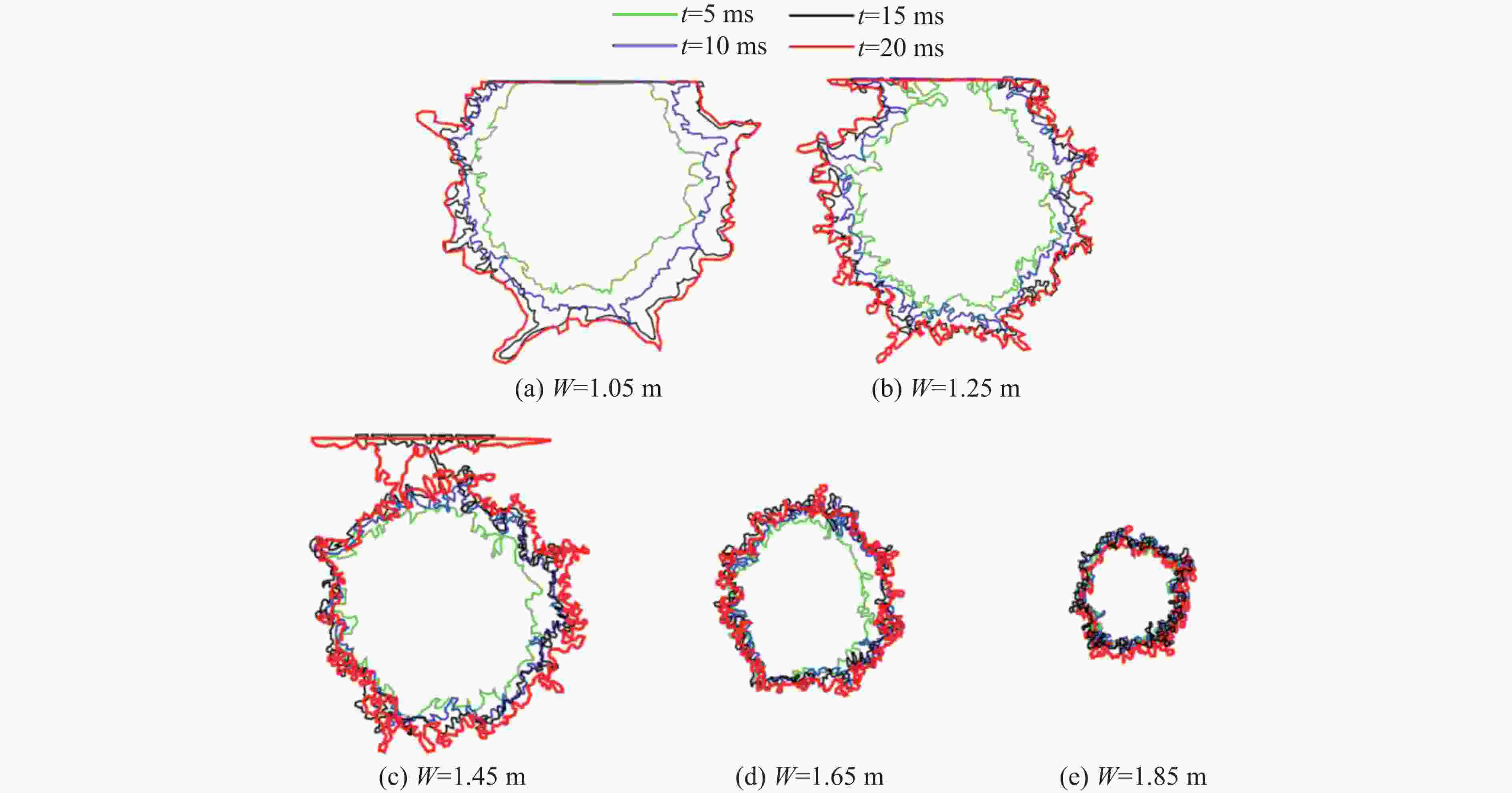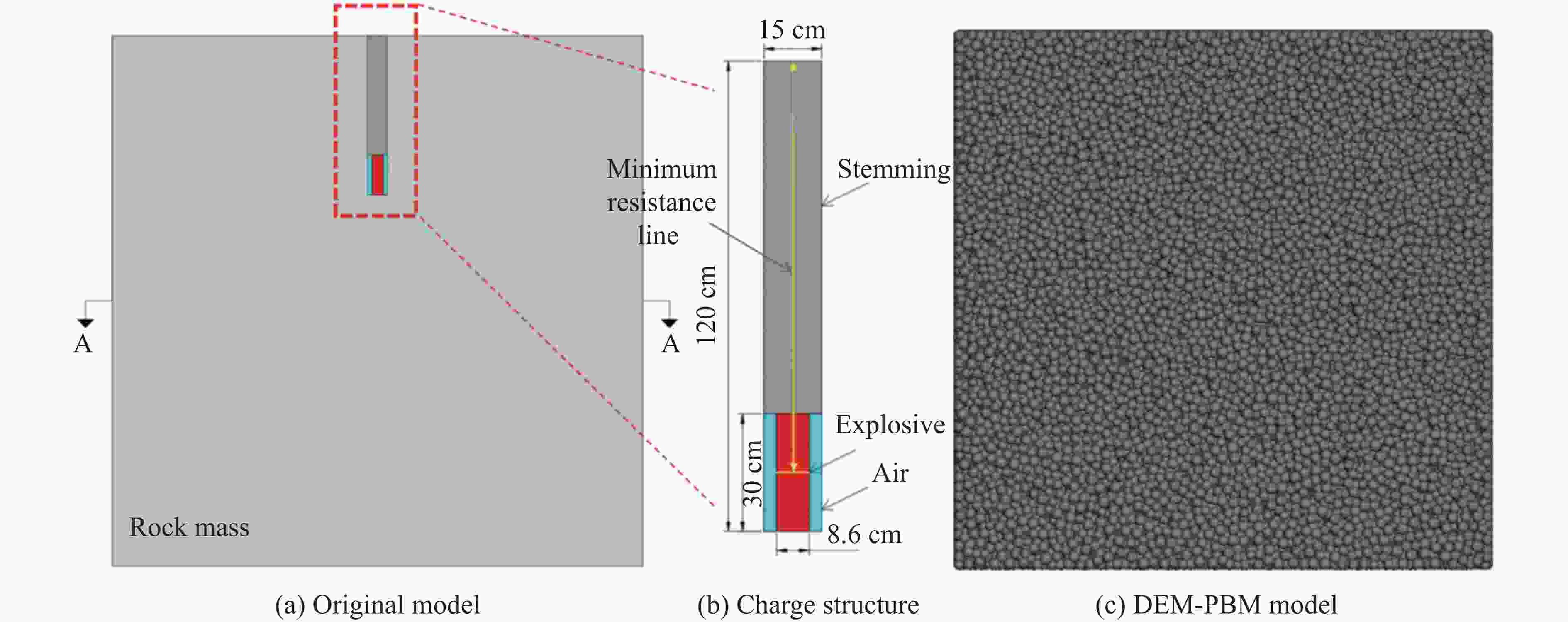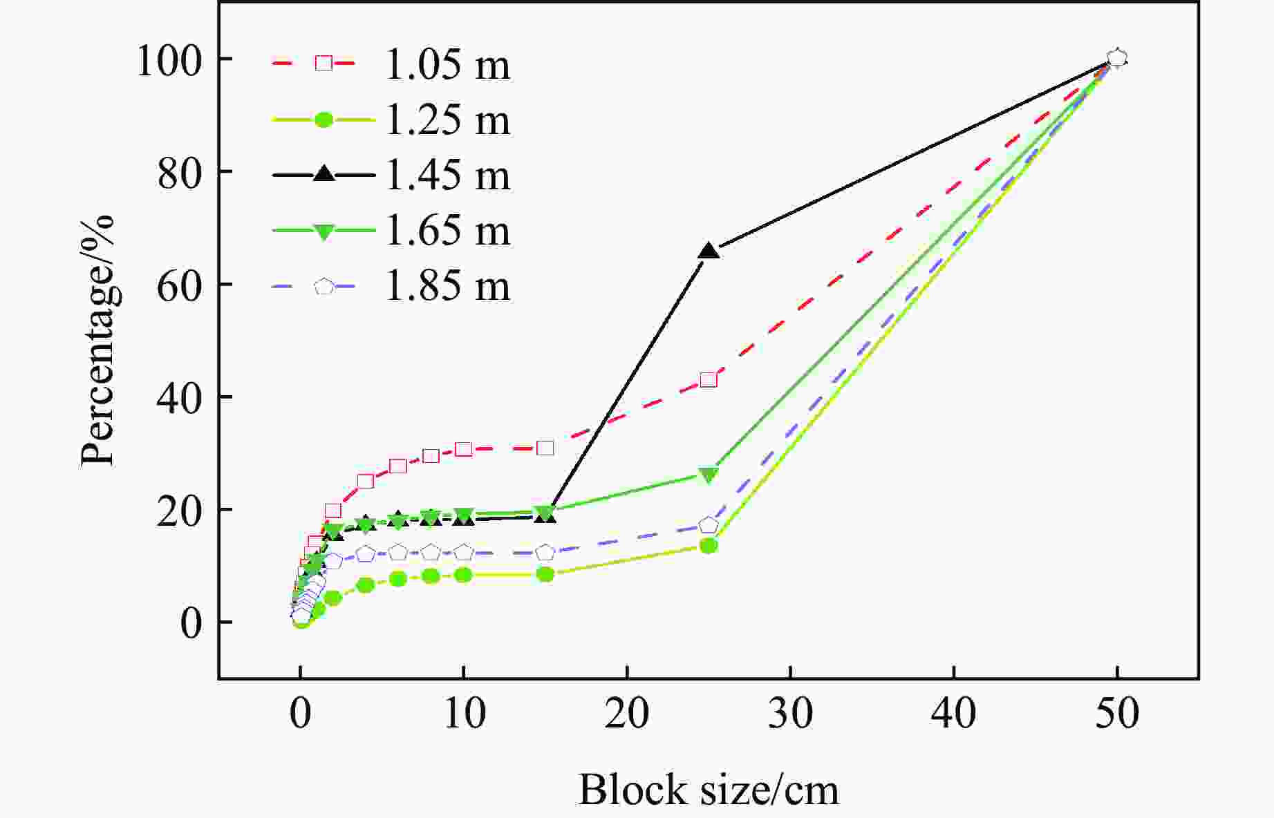 • 摘要: 在露天爆破中,最小抵抗线决定了爆破能量释放的主导方向和岩石运动速度的方向,是控制爆破作用范围、岩石破碎效果及抛掷路径的核心因素。基于DEM-PBM(discrete element method-population balance model)耦合的爆破漏斗数值模拟方法,通过多尺度建模与试验数据协同分析,结合现场爆破漏斗试验,对不同最小抵抗线下爆破漏斗破岩规律进行了研究,以优化爆破参数,提高爆破效率和安全性。数值模拟结果表明:当抵抗线长度为1.05 m时,20 ms时的爆破扩腔面积比5 ms时增长70.33%;当抵抗线长度为1.85 m时,爆破扩腔面积增长11.42%。对比不同抵抗线下破碎块度的抛掷作用效果,当抵抗线长度为1.05 m时,抛掷效果最佳。现场爆破漏斗试验结果显示:当抵抗线长度增大时,爆破漏斗体积变小;当抵抗线长度为1.05 m时,爆破漏斗体积最大,与数值模拟得到的爆破扩腔规律相似。现场爆破块度尺寸分形规律分析结果表明,当抵抗线长度为1.05 m、炮孔深度为1.2 m时,抛掷岩石块体较多,块度分布适中,破碎块体抛掷作用效果最佳。研究结果可为现场钻爆参数优化提供一定参考。