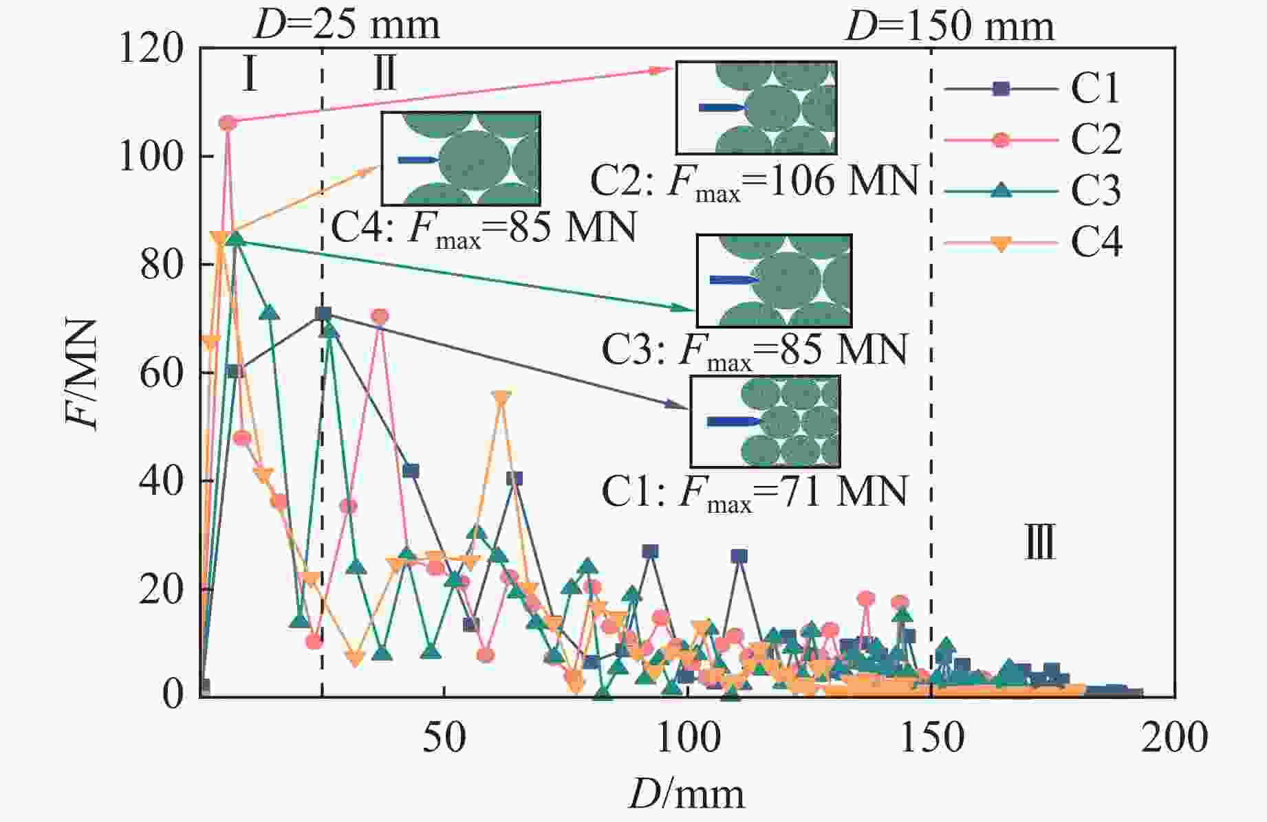 图  不同粒径块石工况下的侵彻阻力-侵彻深度曲线